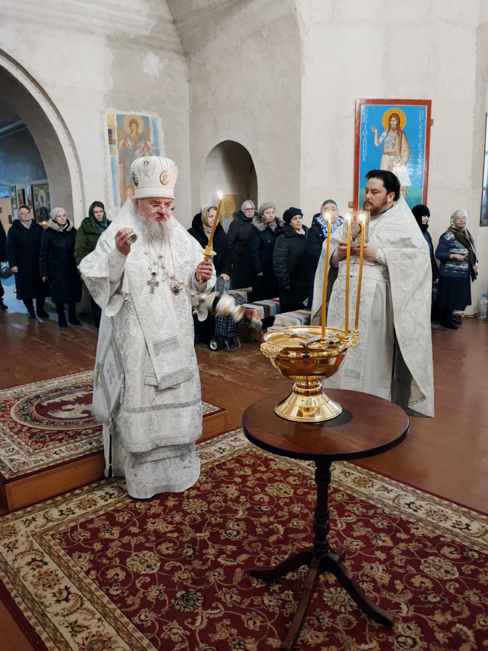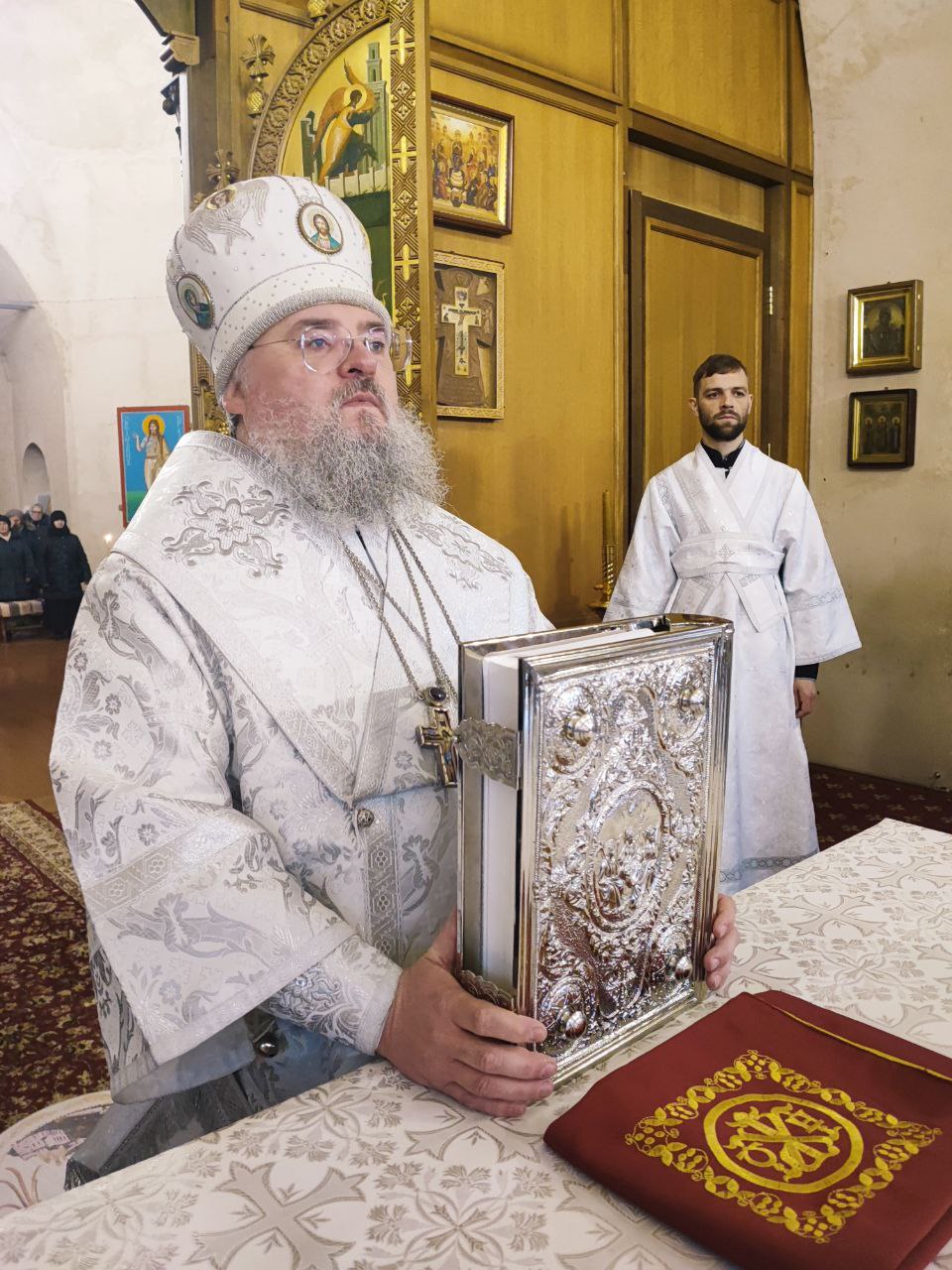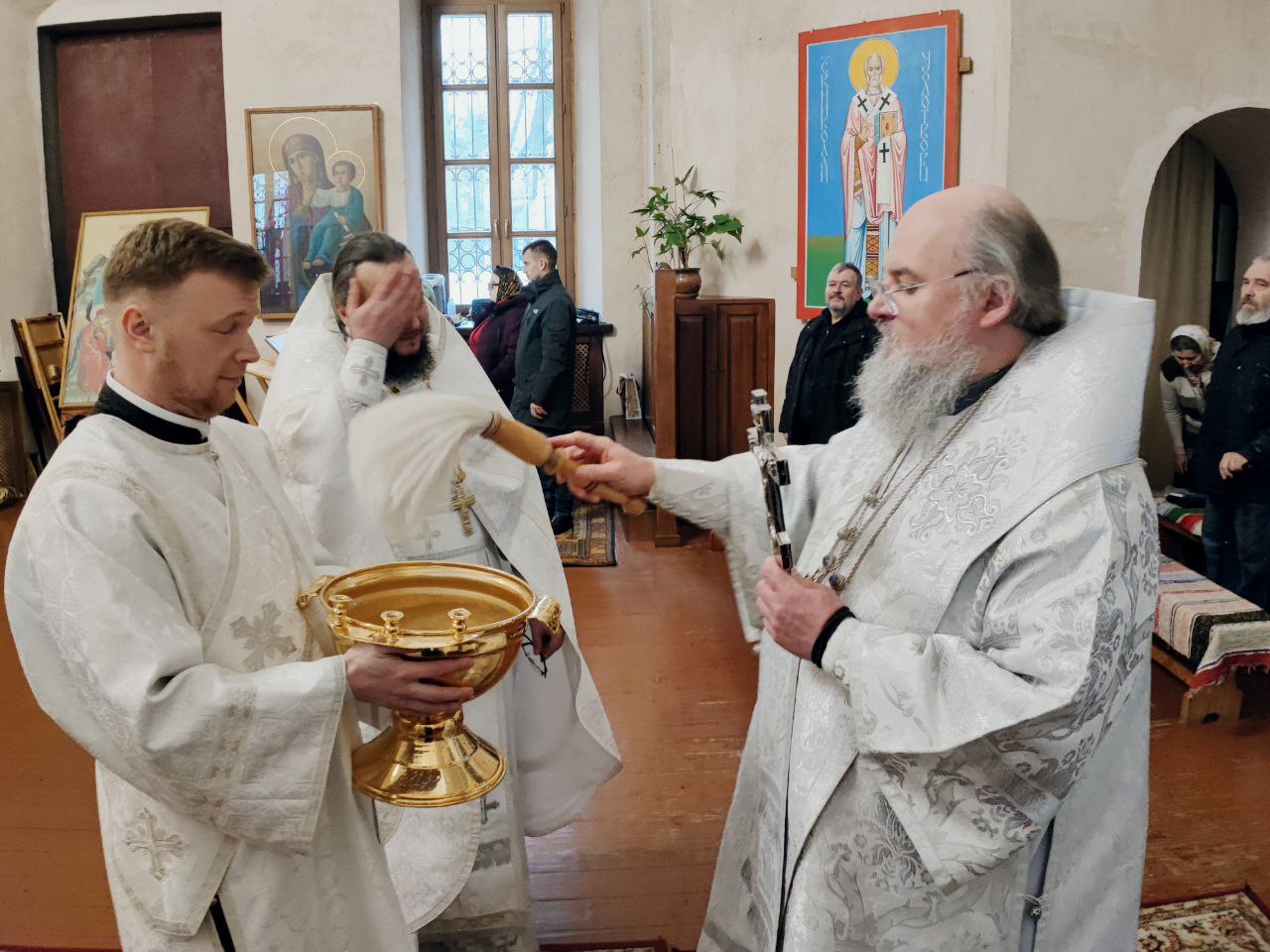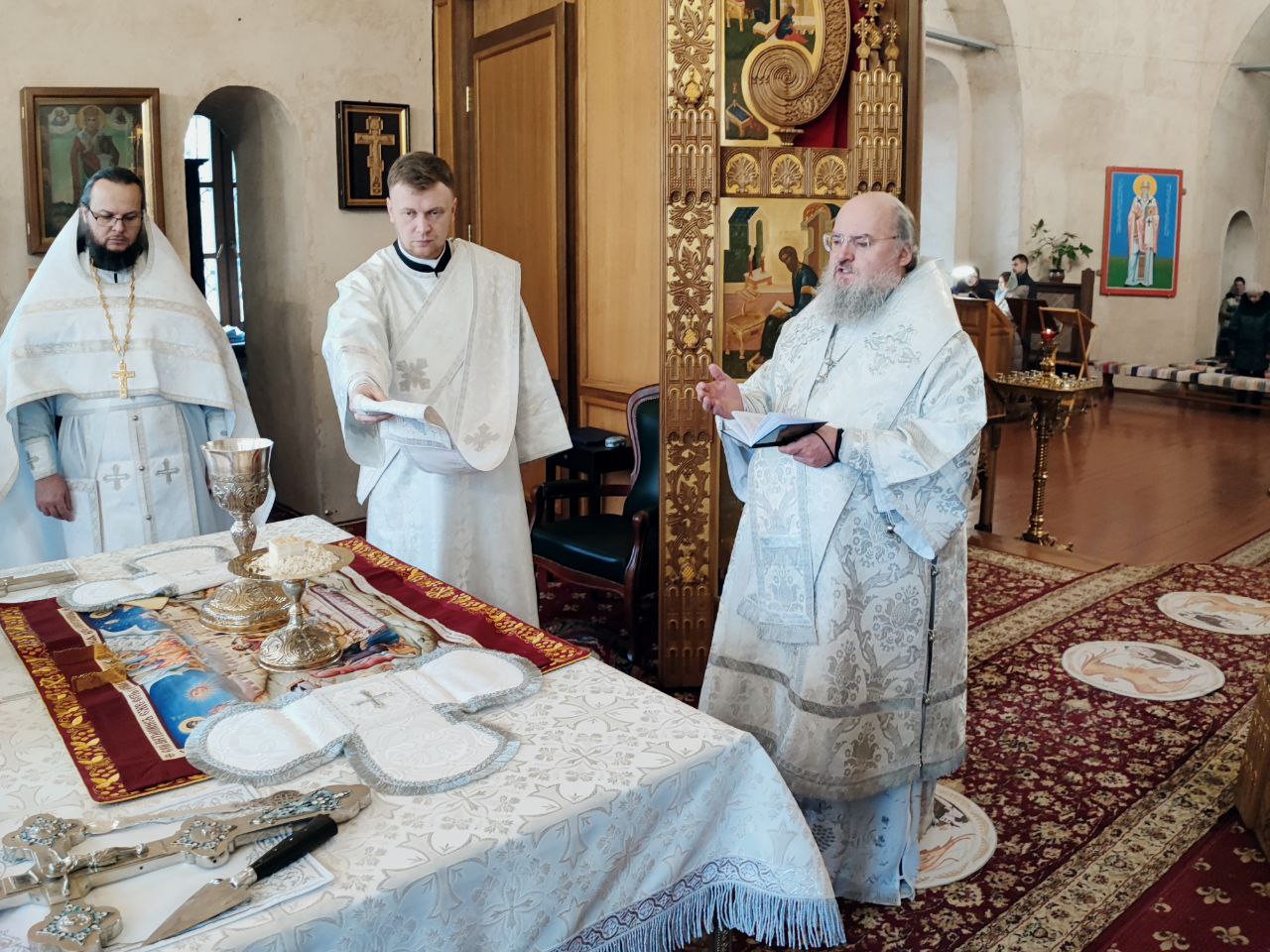 Преосвященному владыке сослужили: иеромонах Паисий (Курмаз) настоятель собора, протоиерей Антоний Хатунцев, иерей Елисей Тимофеев и диакон Евгений Ковригин.