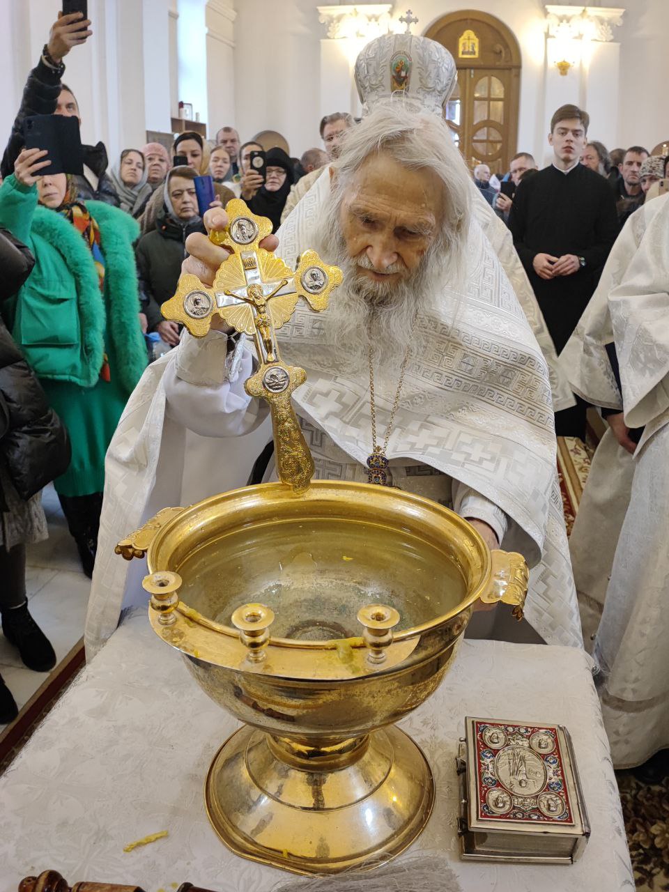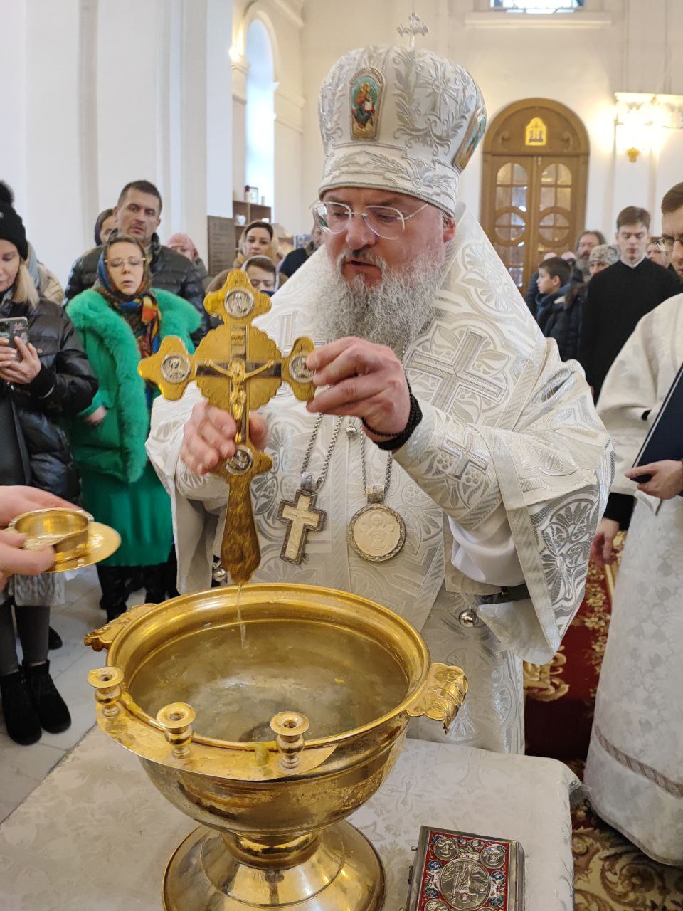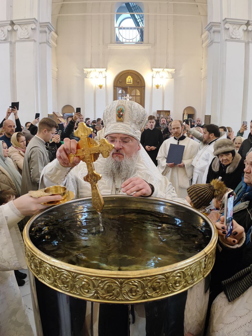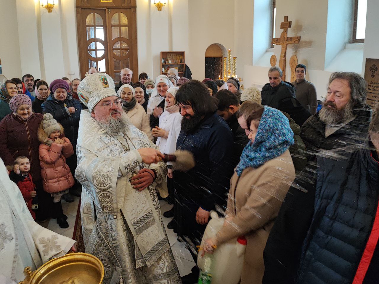 После заамвонной молитвы священнослужители совершили чинопоследование великого освящения воды, а затем владыка обратился к богомольцам с проповедью.