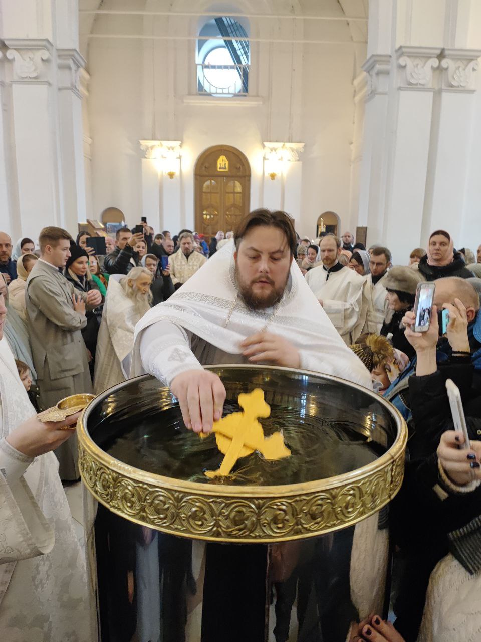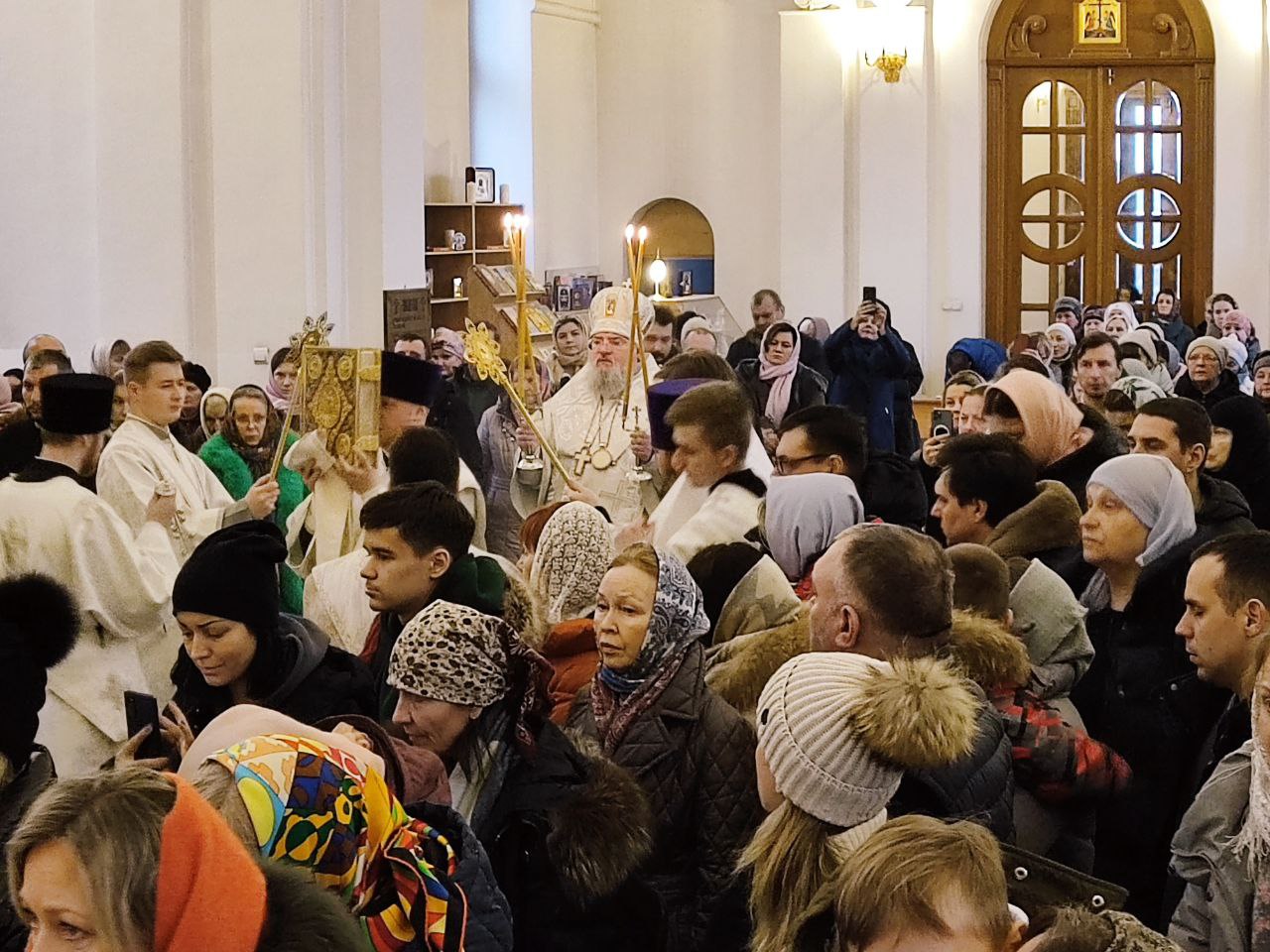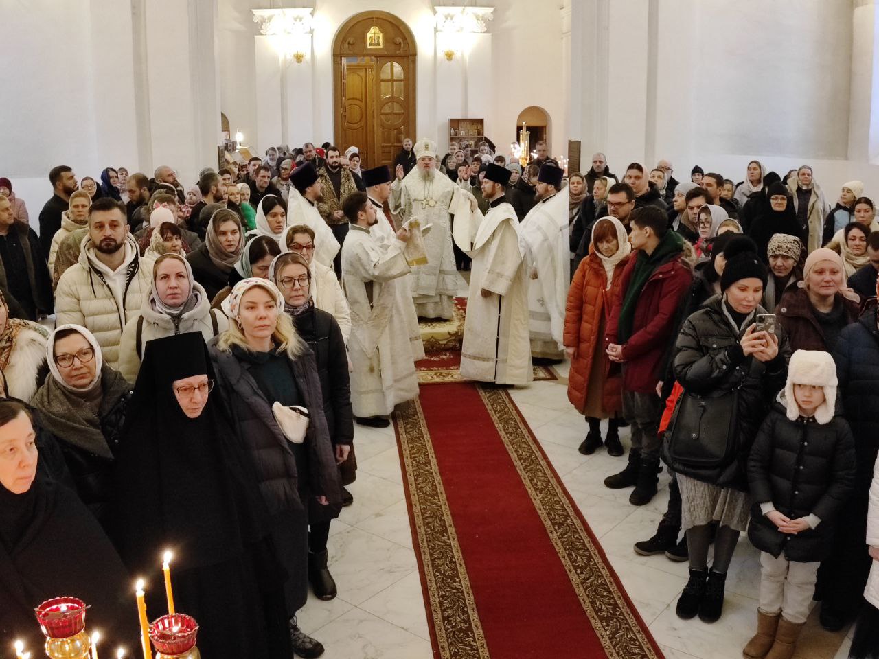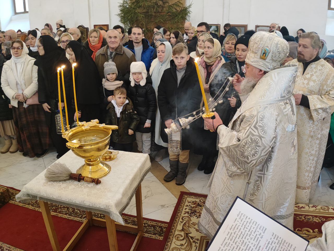 После заамвонной молитвы священнослужители совершили чинопоследование великого освящения воды, а затем владыка обратился к богомольцам с проповедью.