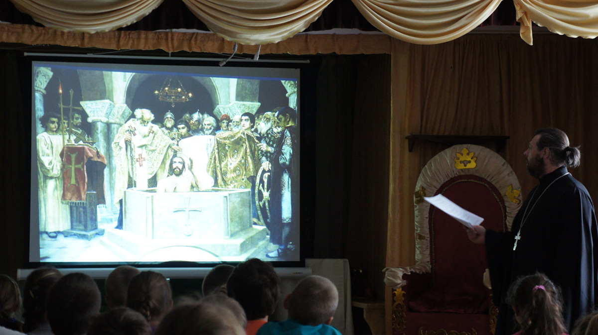 Перед началом представления иерей Алексей Боков знакомил зрителей с ключевыми понятиями, которые необходимо знать детям, чтобы лучше понять описываемые события. Священник Алексей объяснял детям значение следующих слов: Бог, христианство, язычество, крещение, апостол, равноапостольный и летопись. После этого, батюшка рассказывал о жизни Князя Владимира до принятия им православия, о поиске истинной веры и крещении Руси.