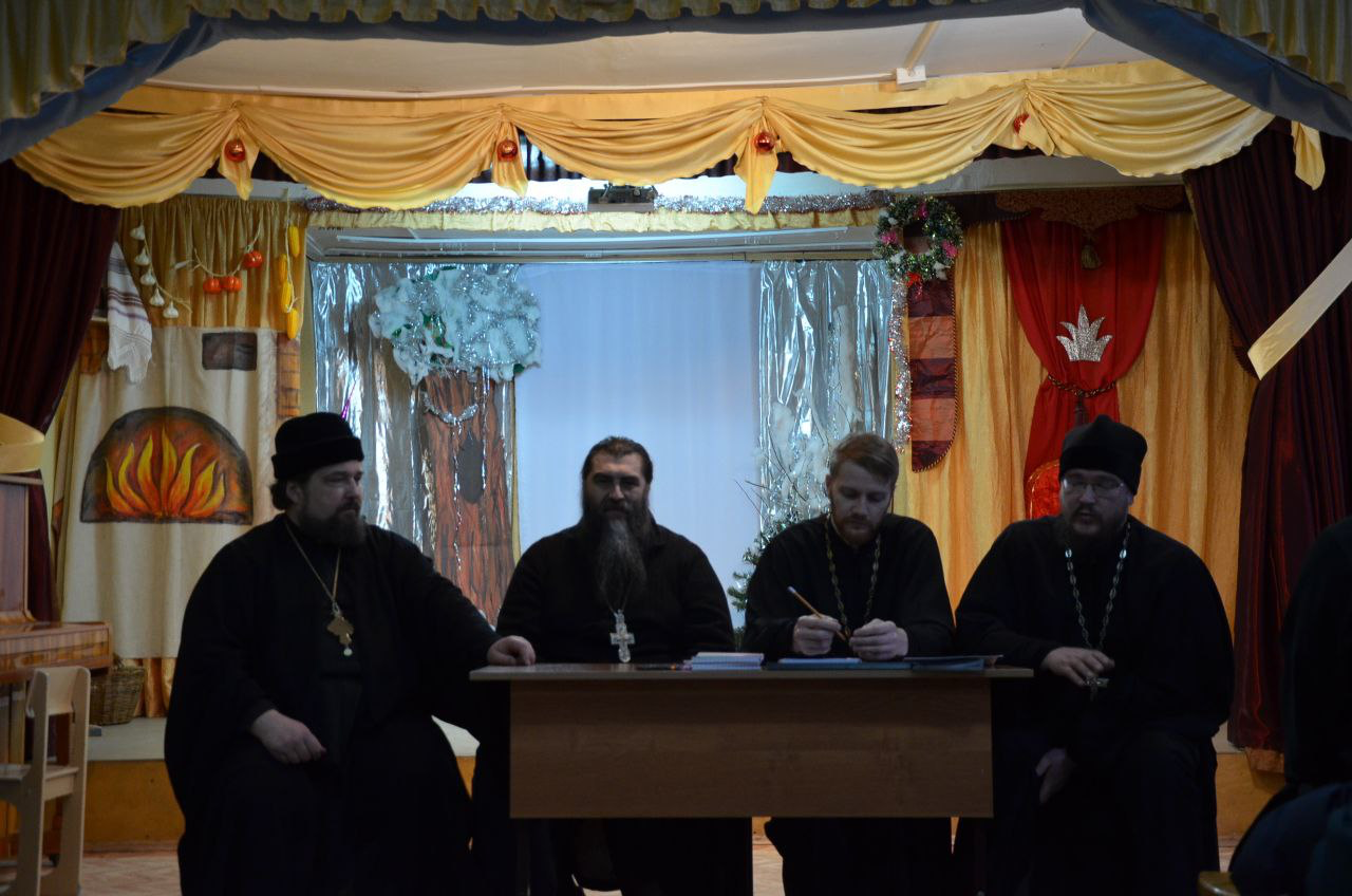 От духовенства Козельского благочиния в работе собрания приняли участие: игумен Михаил (Семенов) — наместник мужского монастыря Спаса Нерукотворного пустынь села Клыково Козельского района, протоиерей Владимир Бахаев, иерей Дионисий Куваев — настоятель храма в честь Богоявления Господня города Козельска, председатель Отдела по церковной благотворительности и социальному служению Козельской епархии, иеромонах Тихон (Клинов), иерей Николай Кузнецов и иерей Елисей Тимофеев.