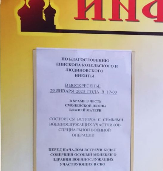 29 января 2023 года в городе Козельске, по благословению епископа Козельского и Людиновского Никиты, состоялась встреча духовенства благочиния с семьями военнослужащих участвующих в проведении специальной военной операции.