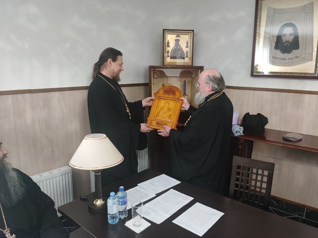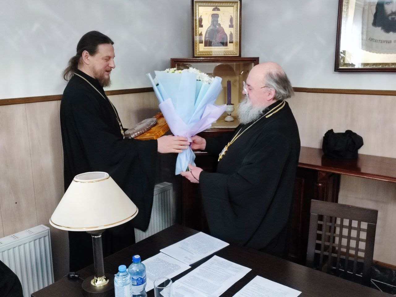 В начале собрания владыка Никита поздравил настоятеля храма Смоленской иконы Пресвятой Богородицы города Сухиничи протоиерея Алексия Казакова с 55летием со дня рождения и вручил ему памятный подарок.