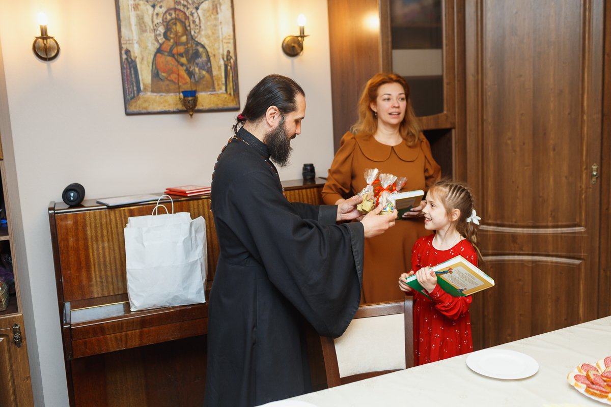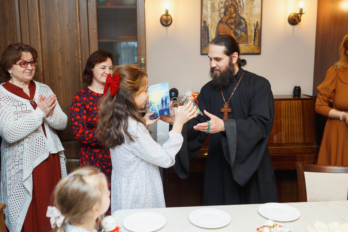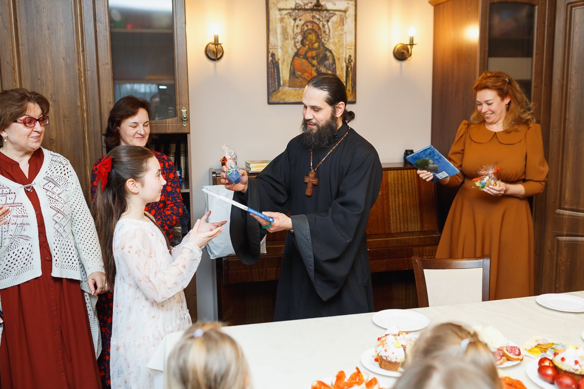 По окончании мероприятия настоятель иерей Максим Изопов вручал участникам концерта книги и сладкий приз, а остальным деткам присутствующем на празднике сладкие призы. А преподавателей, родителей и благотворителей поблагодарил за организацию.