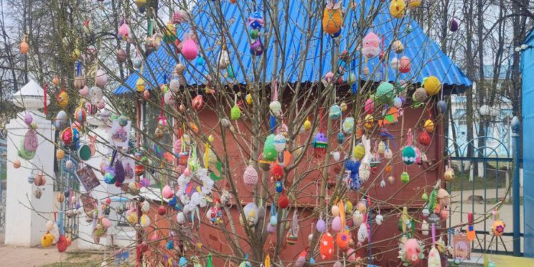 К празднику Светлого Христова Воскресения прихожане Казанского собора города Людиново во дворе храма украсили «пасхальное» древо. Эта традиция длиться уже несколько лет и особенно полюбилась юным прихожанам – воспитанникам духовно-просветительского центра «Светоч». Древо украшено расписными пасхальными «крашенками» и открытками.