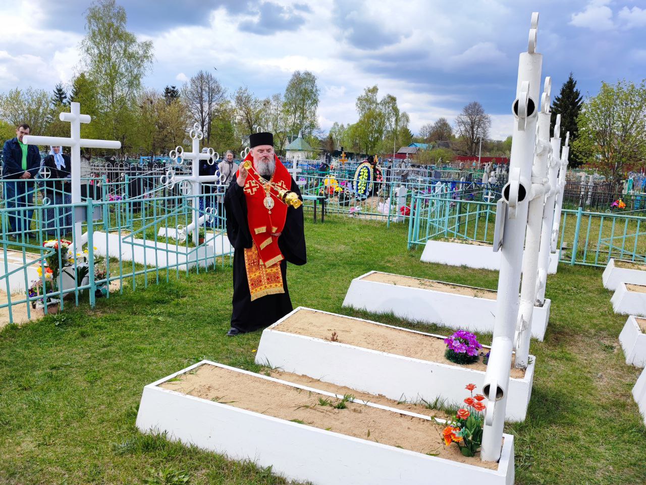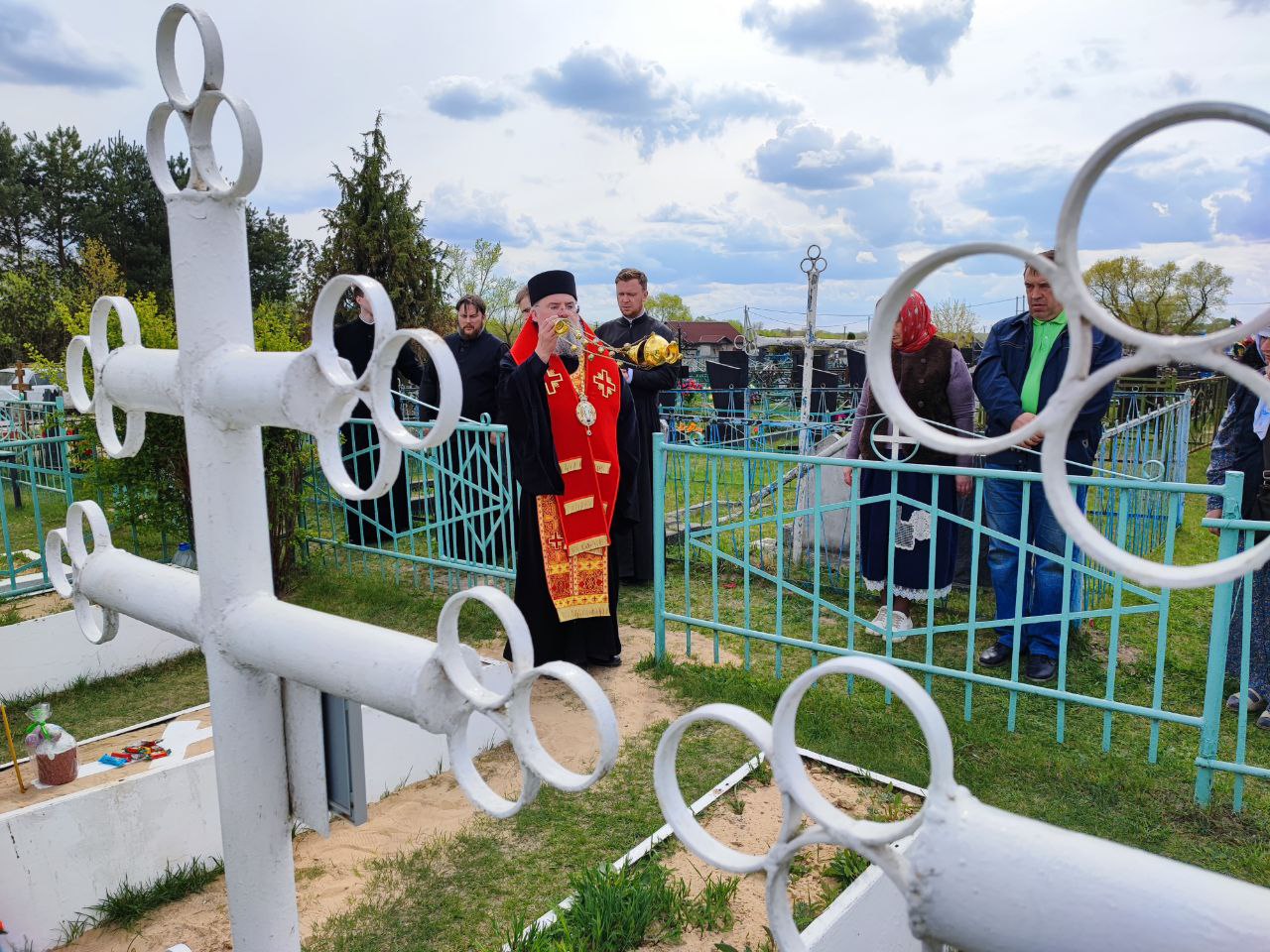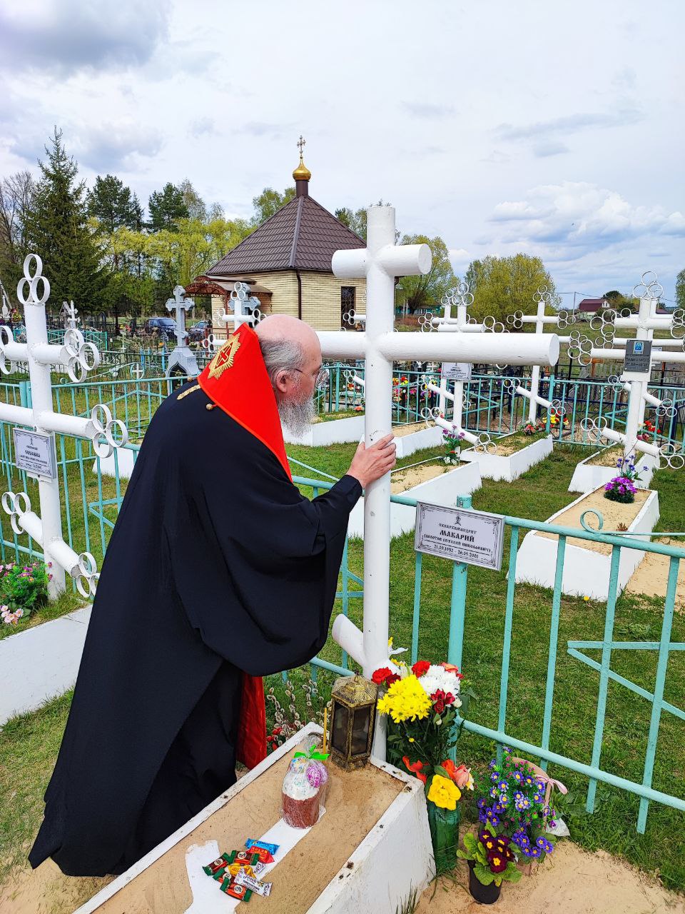 25 апреля. Радоница. Поминовение усопших. Епископ Козельский и Людиновский Никита совершил заупокойные литии в храме Преображения Господня села Нижние Прыски, где рядом с центральным алтарем погребен бывший многолетний настоятель протоиерей Леонтий Никифоров, а также на сельском кладбище на месте захоронения схиархимандрита Макария (Болотова).