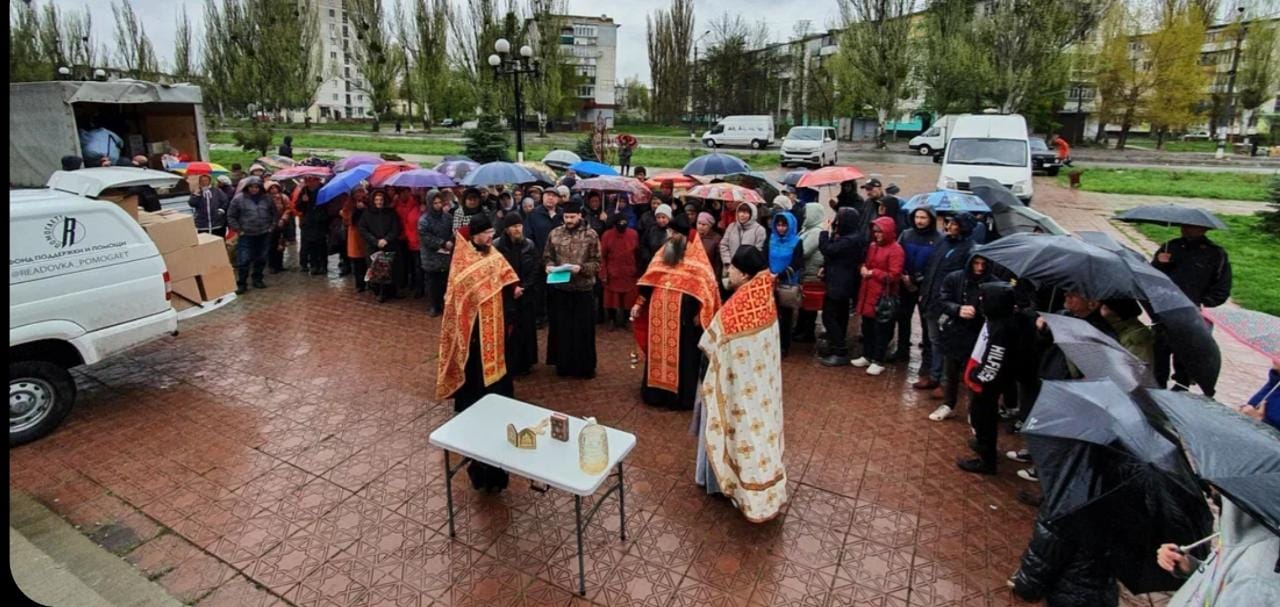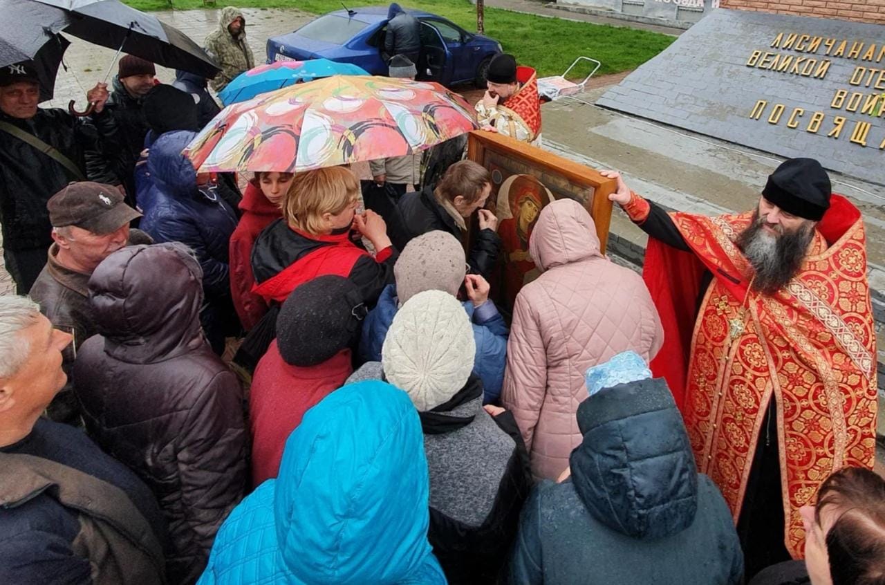Первым пунктом назначения был город Лисичанск, где перед началом раздачи продуктовых наборов и вещей, для жителей города был отслужен пасхальный молебен перед иконой Божией Матери «Песчанская», которая сопровождала участников миссии на протяжении всего пути. Молебен возглавил архимандрит Михаил (Семенов), которому сослужили протоиерей Владимира Бахаев и иерей Дионисий Куваев.