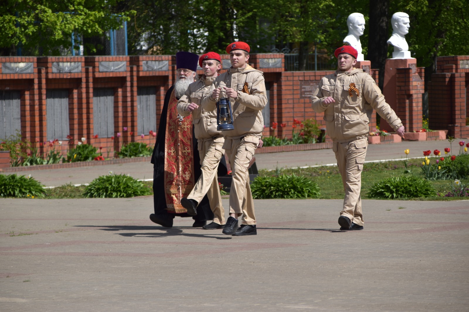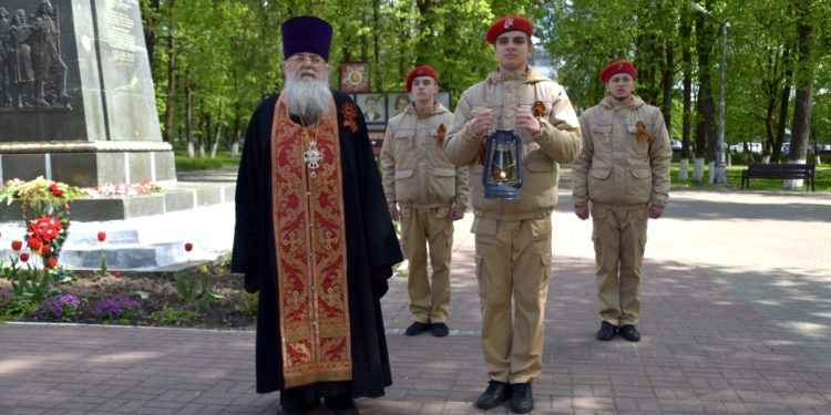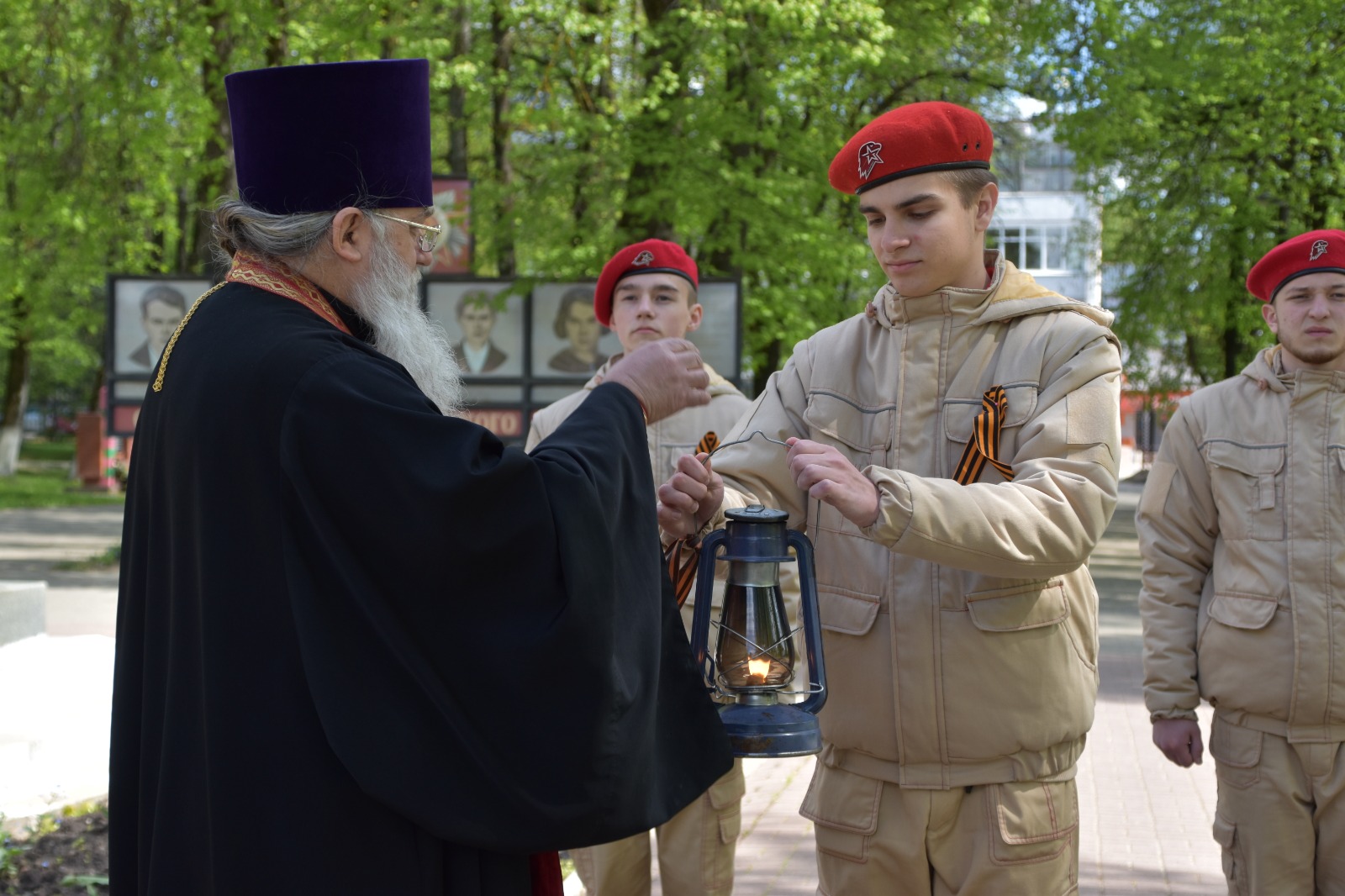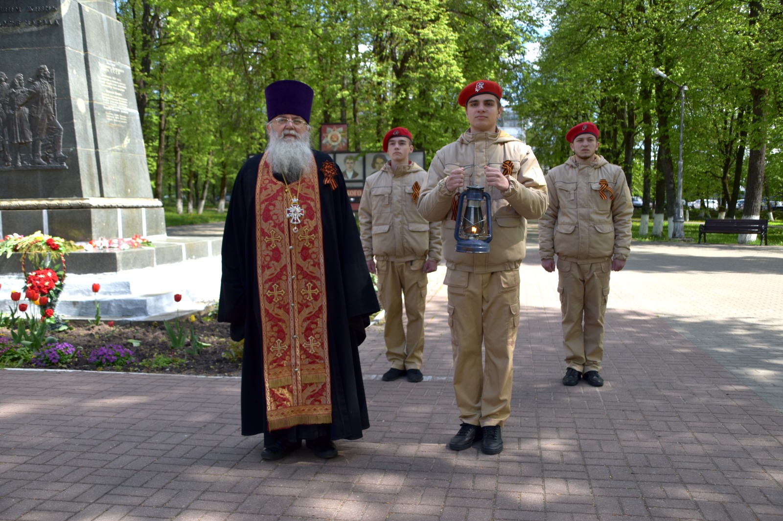 Очень значимо, что перед изнесением из собора и возжжением на Мемориале частичка пламени вечного огня была воссоединена с Благодатным огнём из храма Гроба Господня в Иерусалиме, привезенным в наш собор в праздник Антипасхи 23 апреля сего года Епископом Козельским и Людиновским Никитой.
