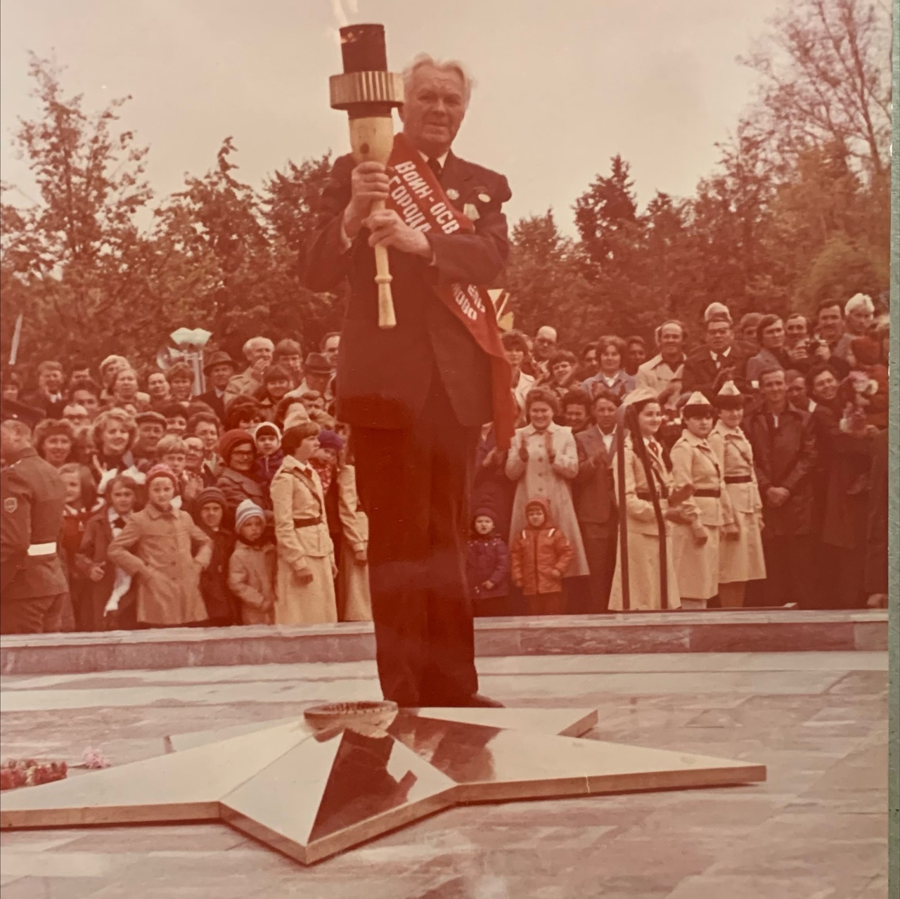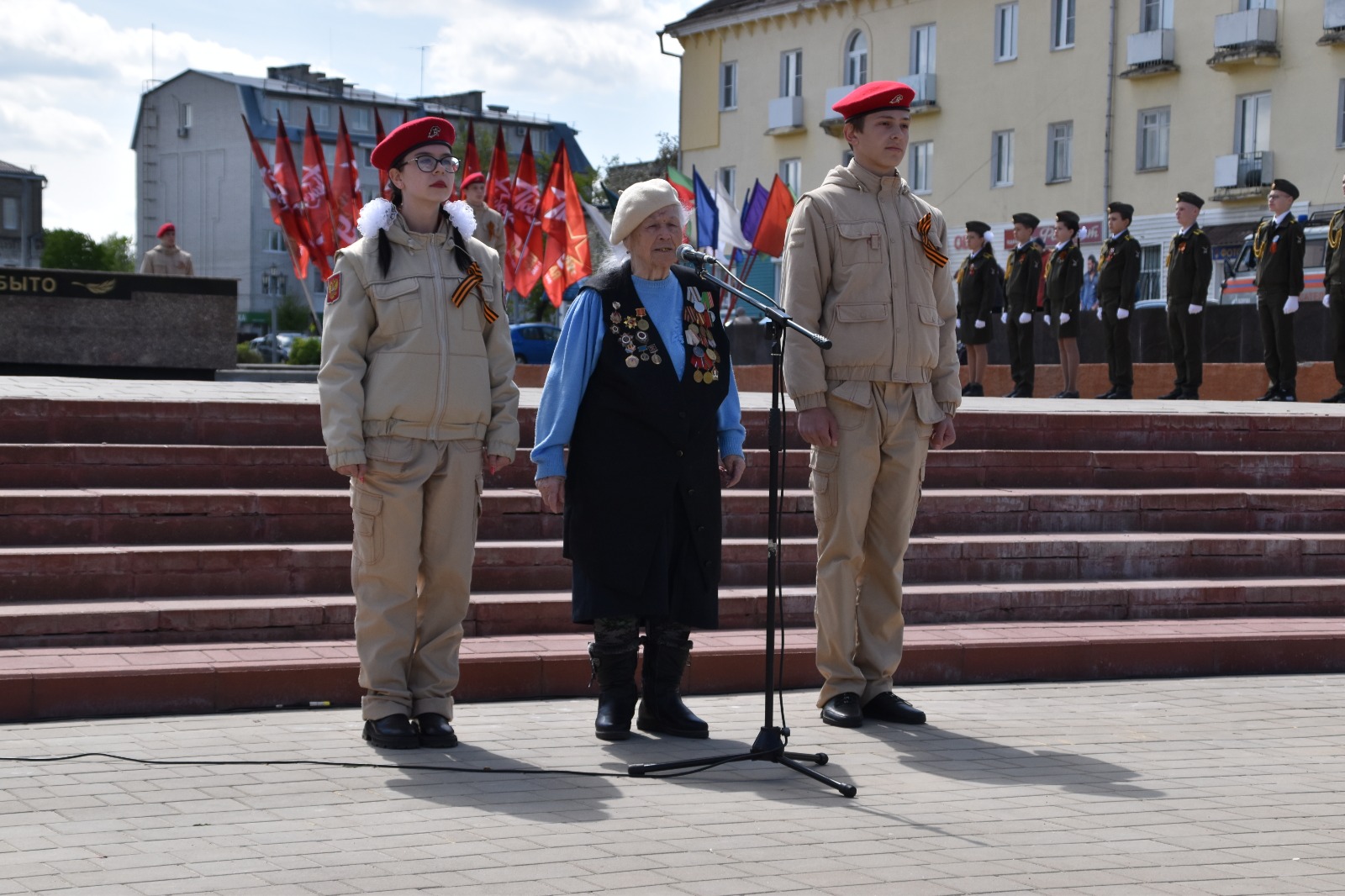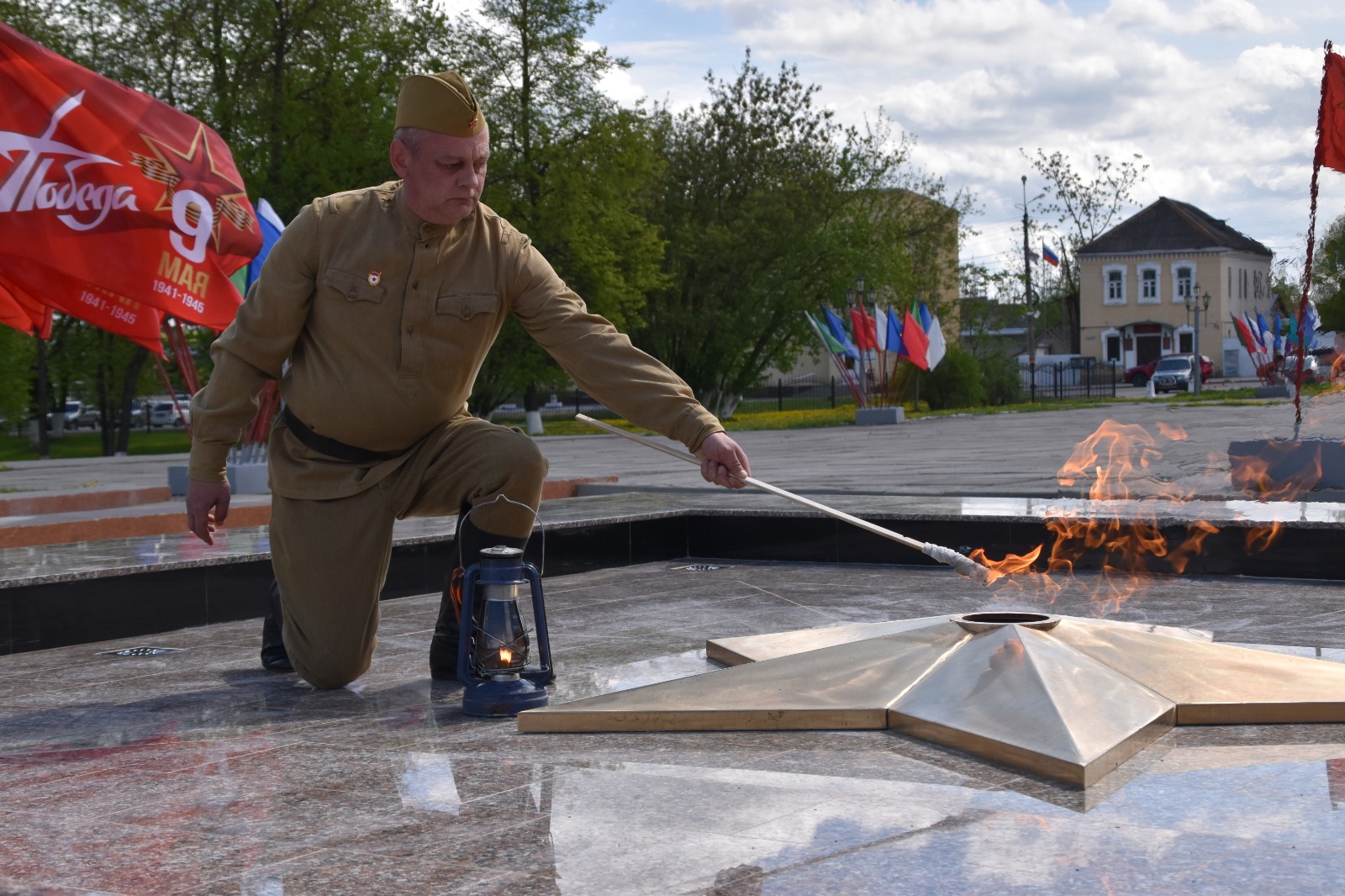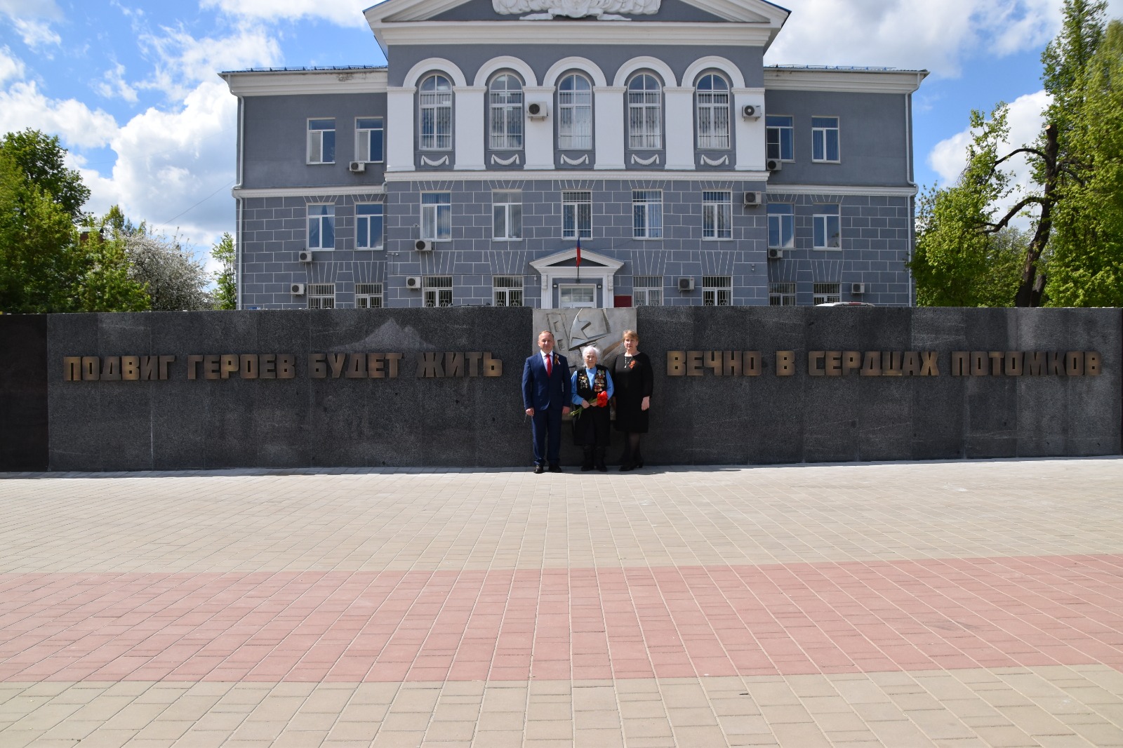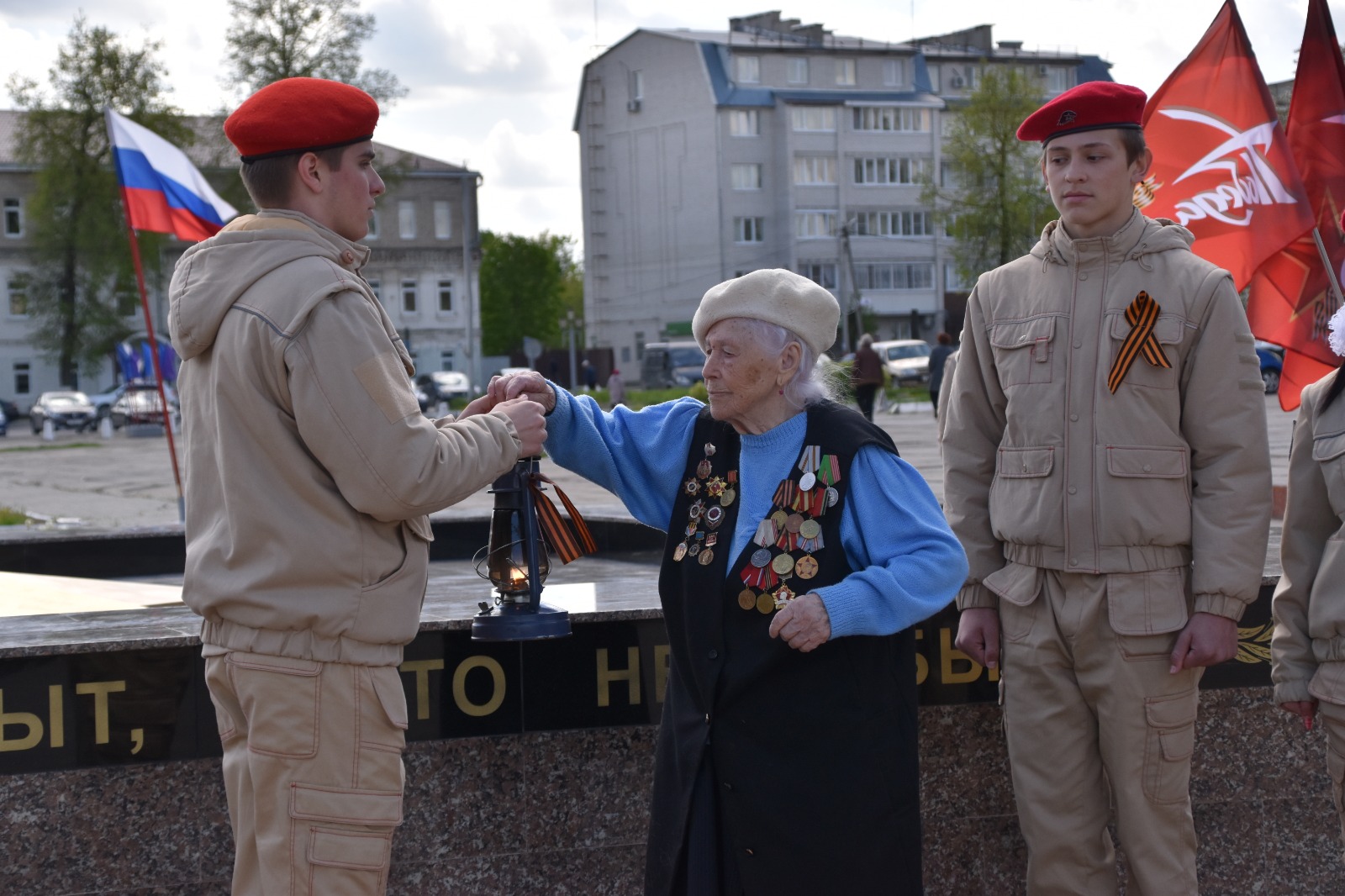 Право зажечь огонь, как символ памяти нашего народа о павших воинах, было предоставлено ветерану Великой Отечественной войны Марии Матвеевне Власенковой. Радостно, что, как и в год открытия Площади Победы в Людинове, появилась и надпись на стене у мемориала «ПОДВИГ ГЕРОЕВ БУДЕТ ЖИТЬ ВЕЧНО В СЕРДЦАХ ПОТОМКОВ». И воин-горнист возвещает о Великой Победе!