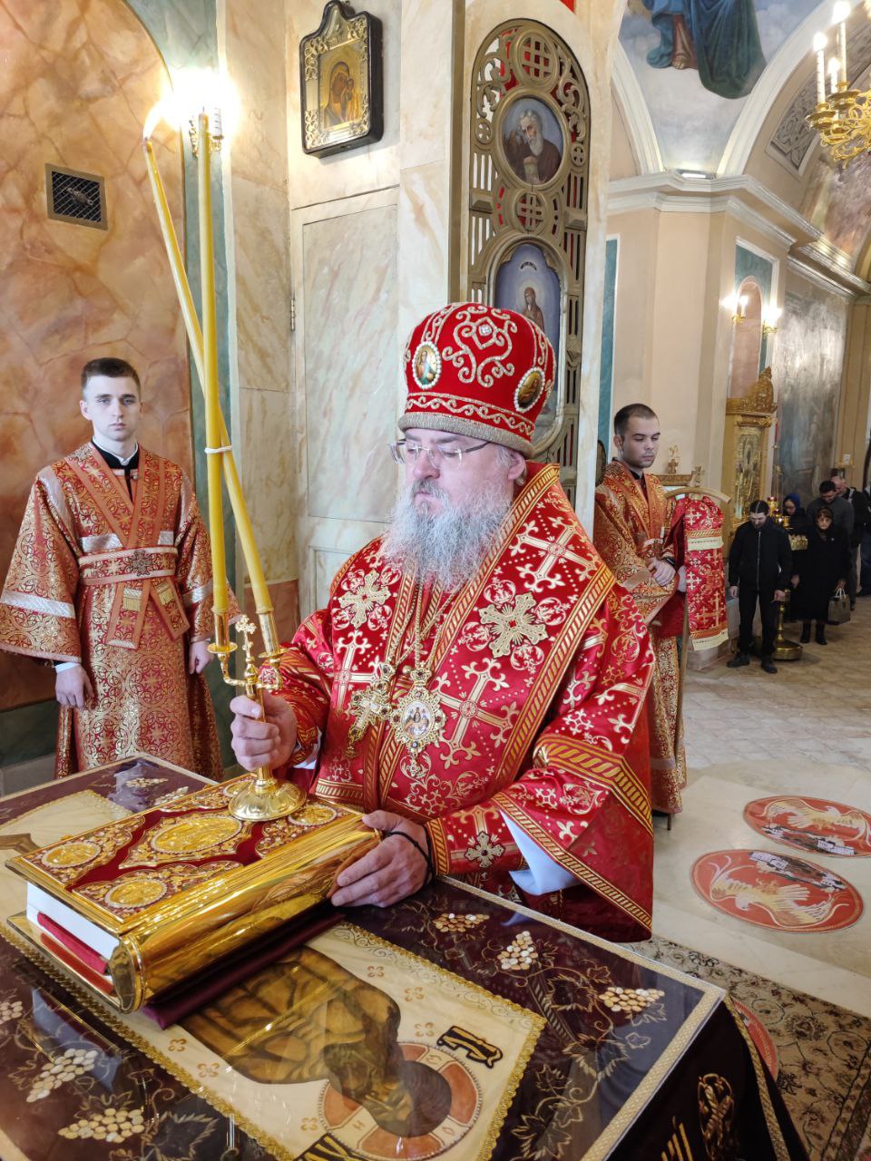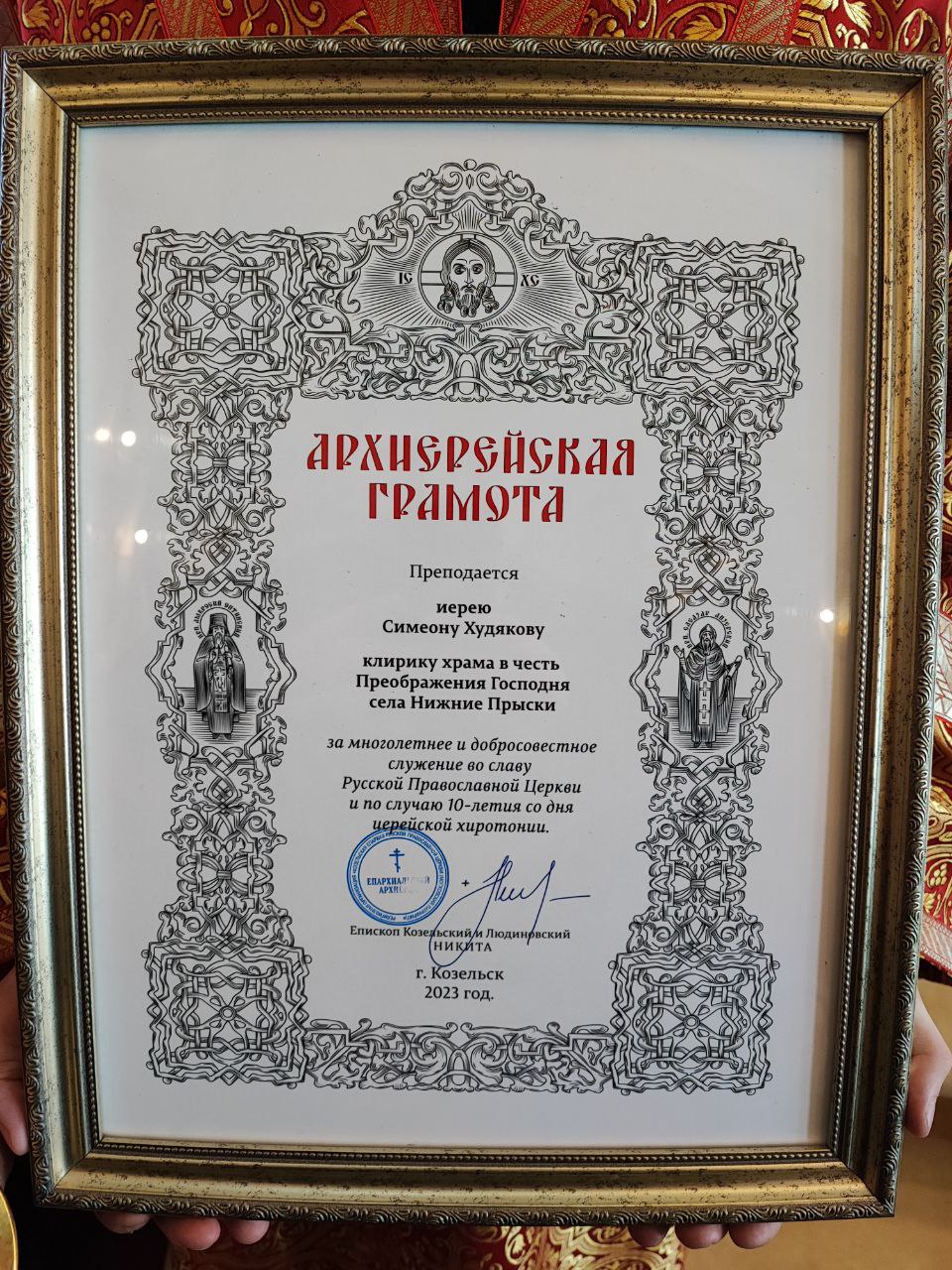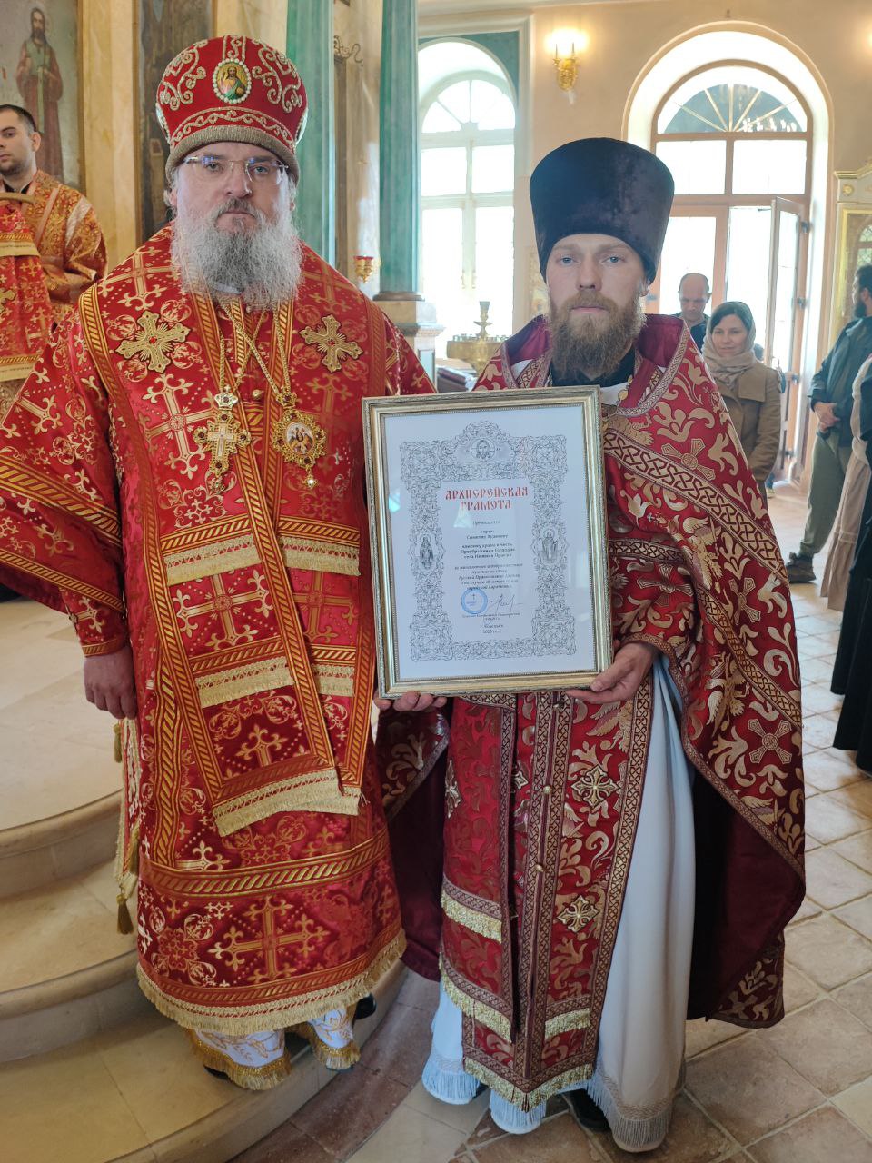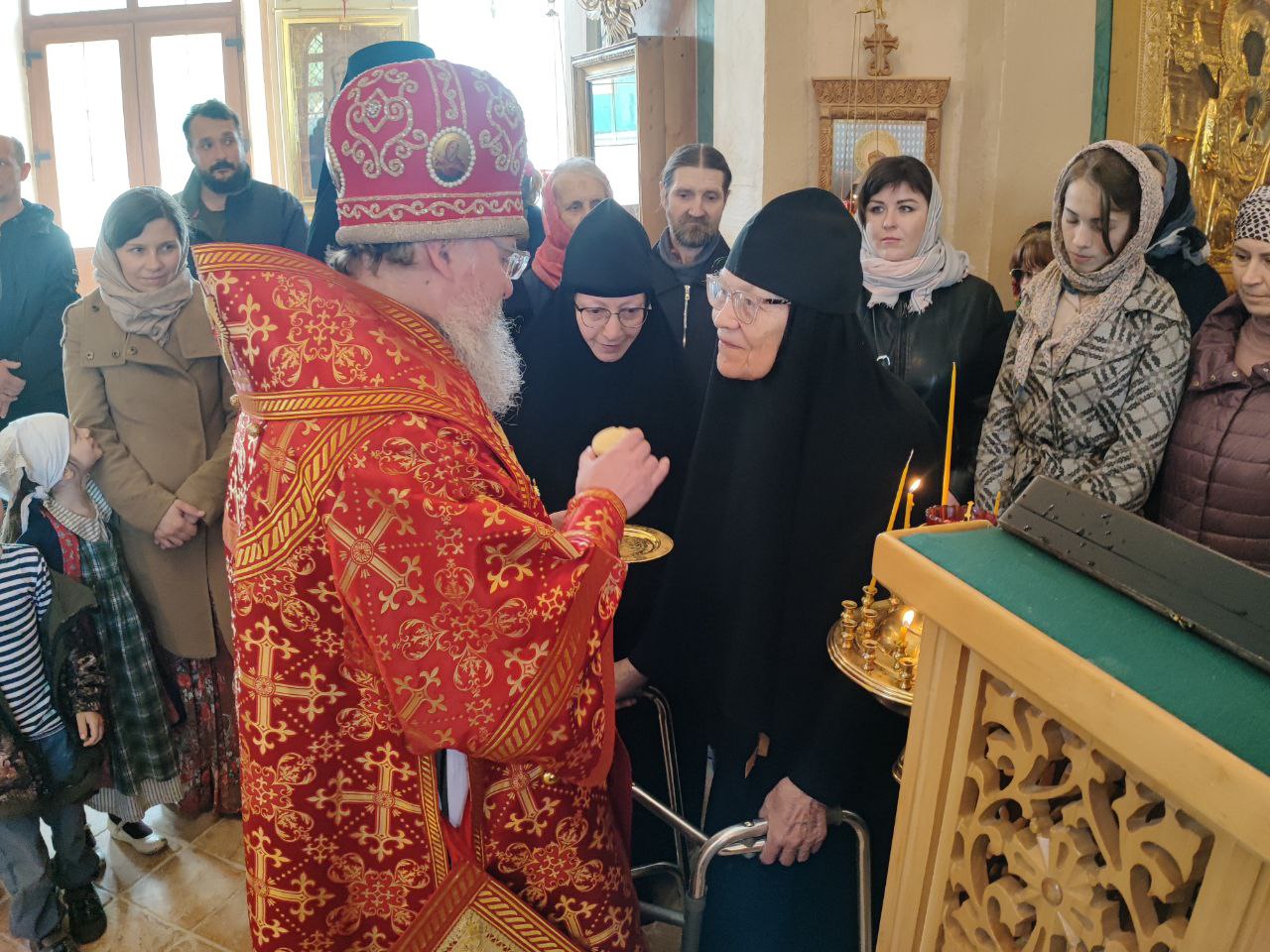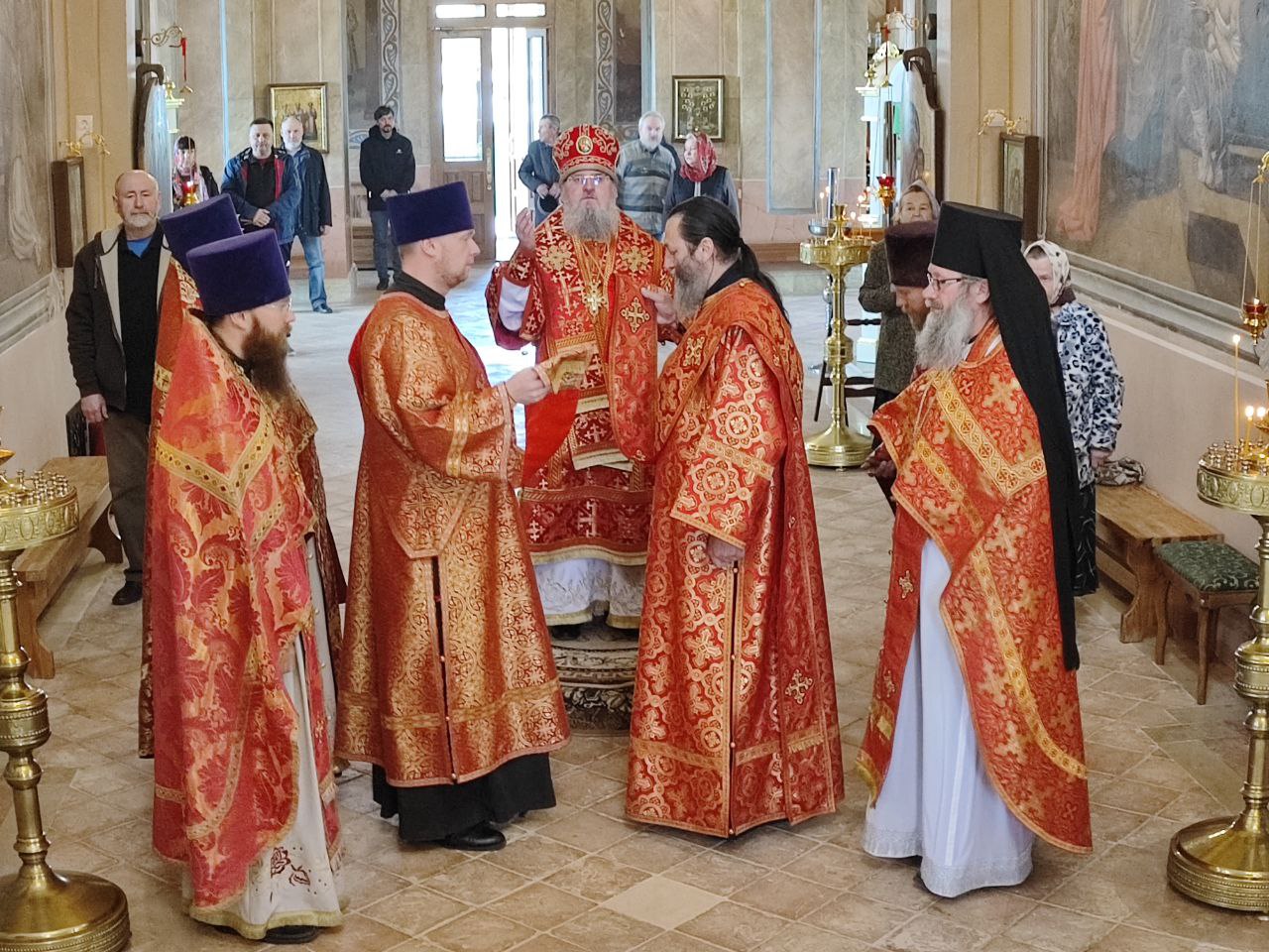 Завершая богослужение, епископ Никита обратился к богомольцам с проповедью. Во внимание к усердным трудам во славу Святой Церкви и в связи с 10-летием служения в священном сане клирик Преображенского храма иерей Симеон Худяков был удостоен Архиерейской грамоты. Владыка также поздравил одну из старейших прихожанок храма монахиню Тавифу с днем тезоименитства и преподнес ей святую просфору возгласив многолетие.