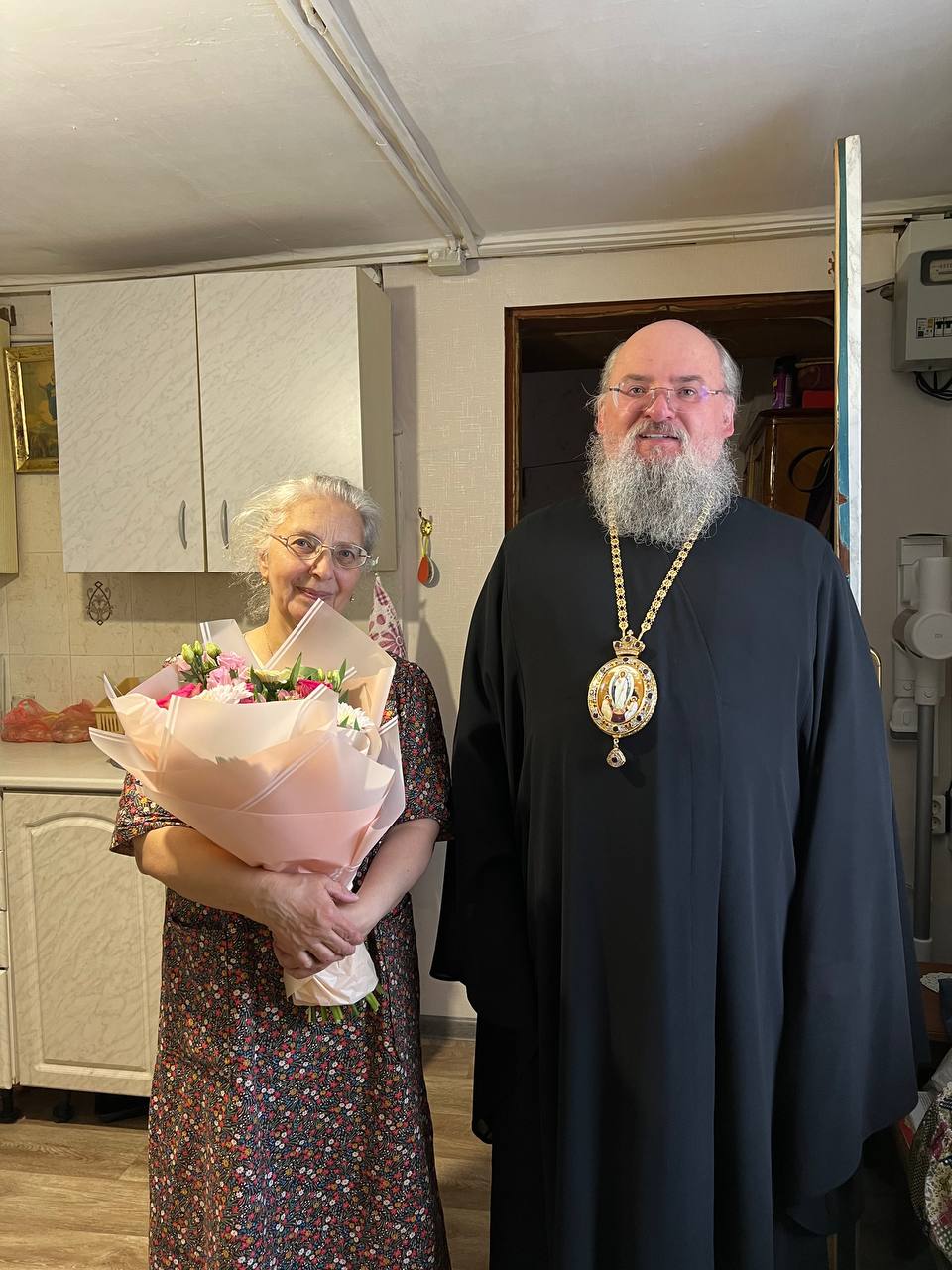 После богослужения архипастырь посетил дом покойного настоятеля храма протоиерея Леонтия Никифорова, где пообщался с его вдовой – Тамарой Ивановной Никифоровой и поздравил его дочь – Ольгу Леонтьевну с наступающим днем рождения, подарив ей букет цветов.