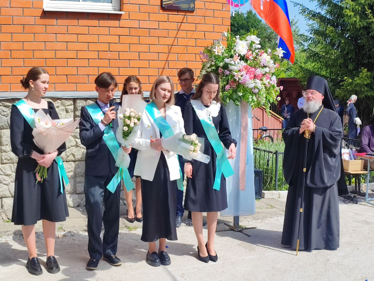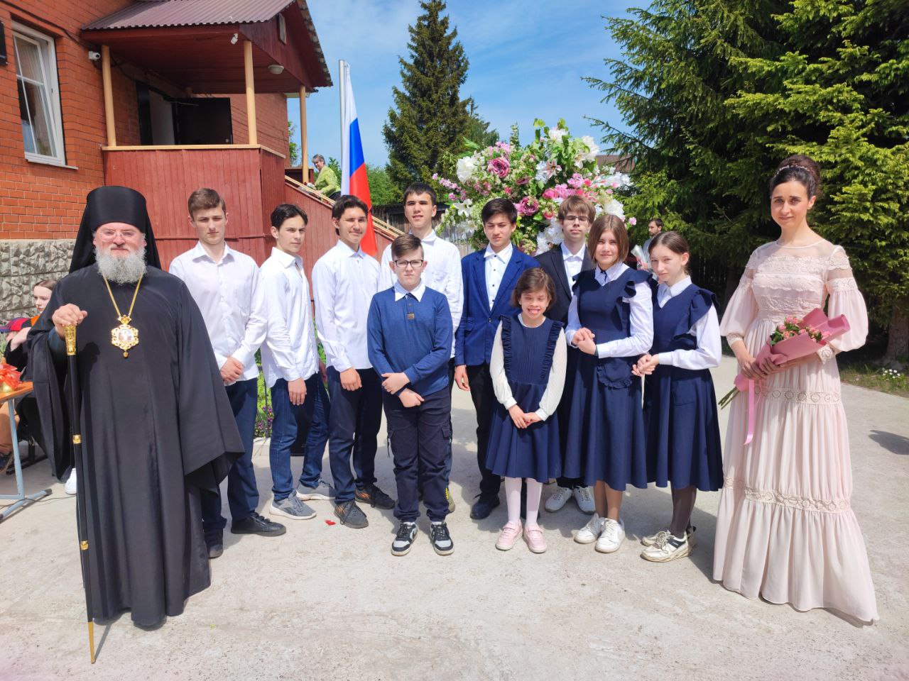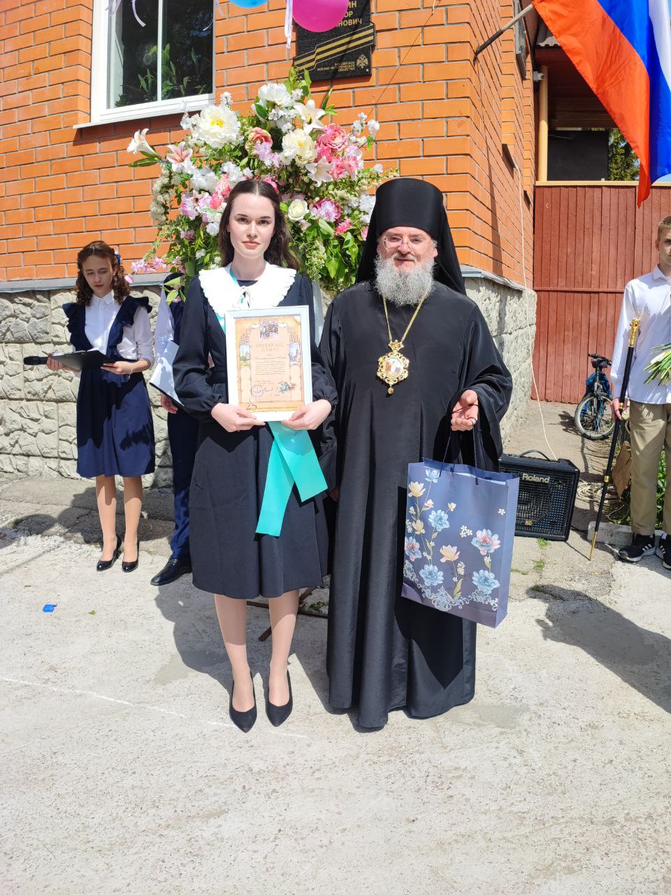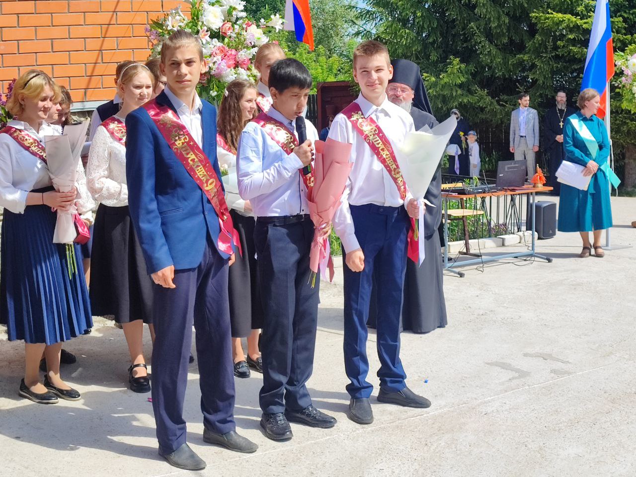 В ответ от выпускников прозвучали песня и благодарственные слова учителям и всем сотрудникам гимназии. По традиции, ребята подарили букеты цветов епископу, директору, духовнику и всем учителям.