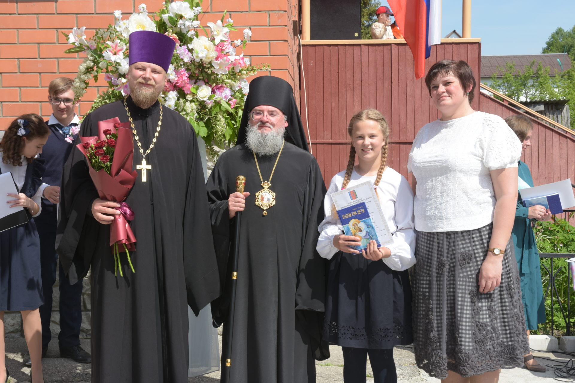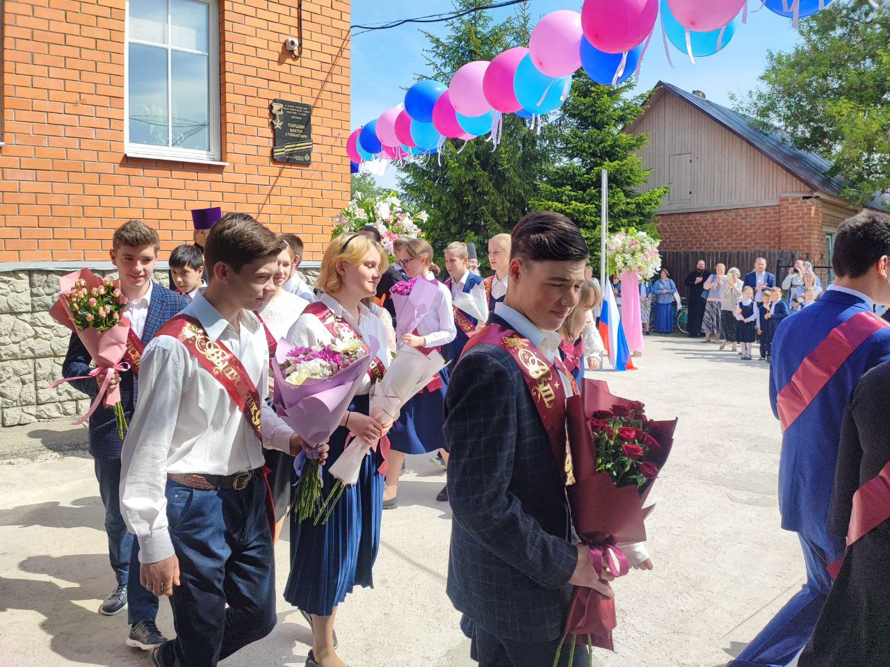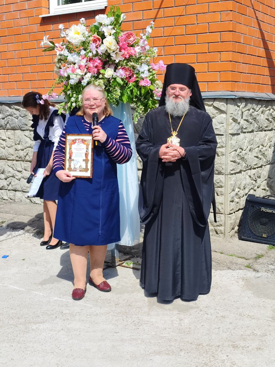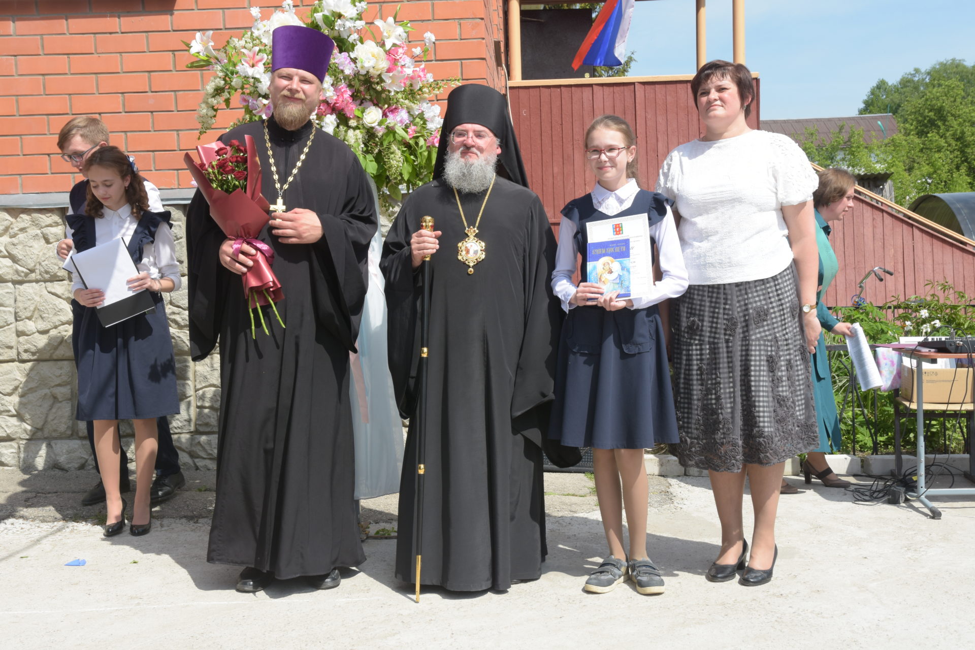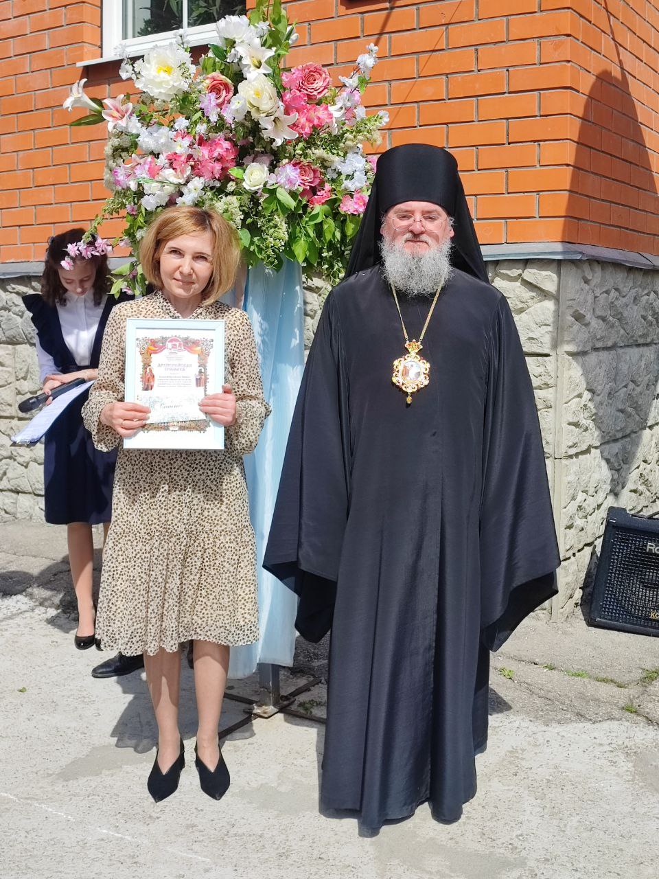 В ответ от выпускников прозвучали песня и благодарственные слова учителям и всем сотрудникам гимназии. По традиции, ребята подарили букеты цветов епископу, директору, духовнику и всем учителям.