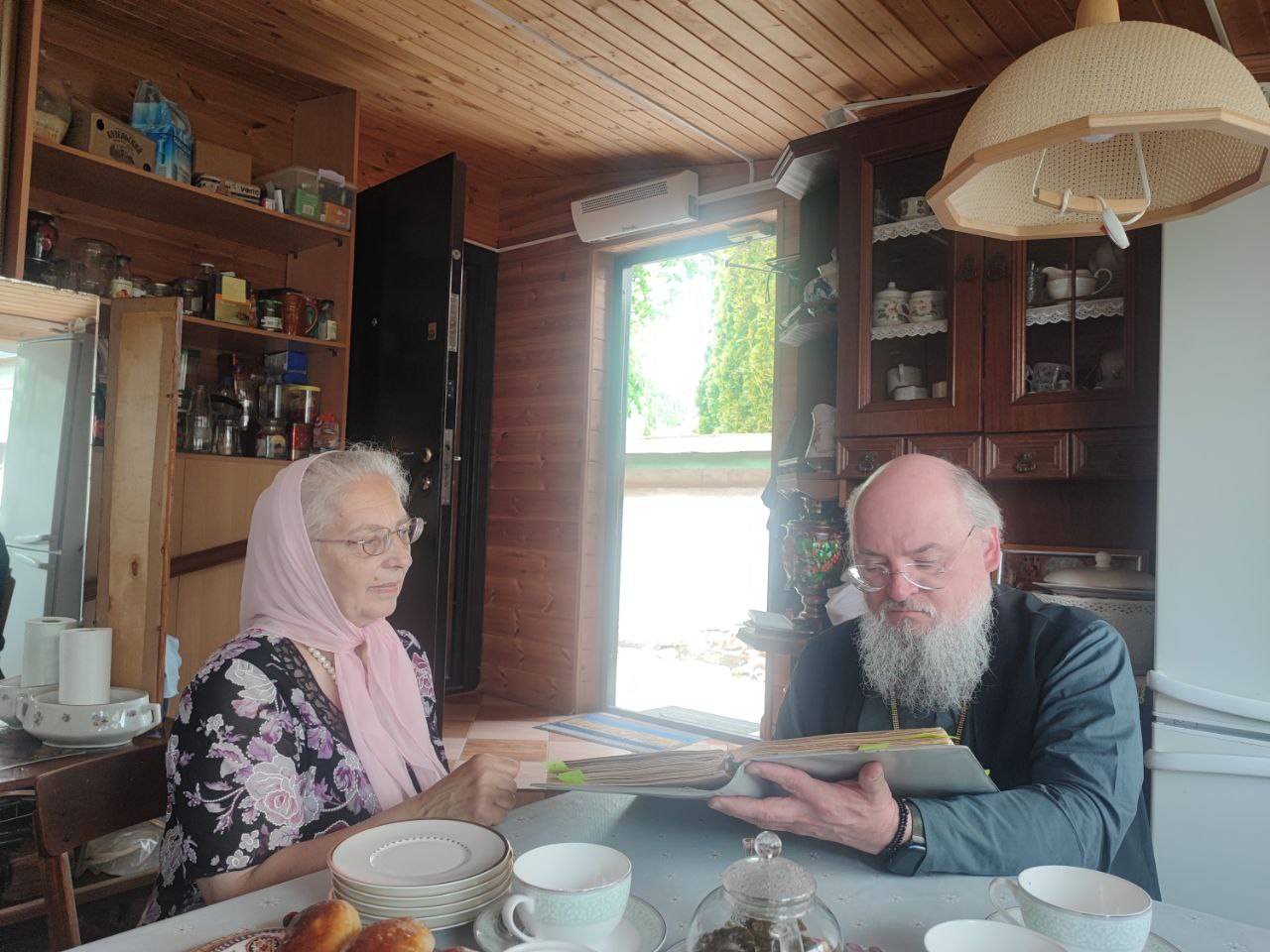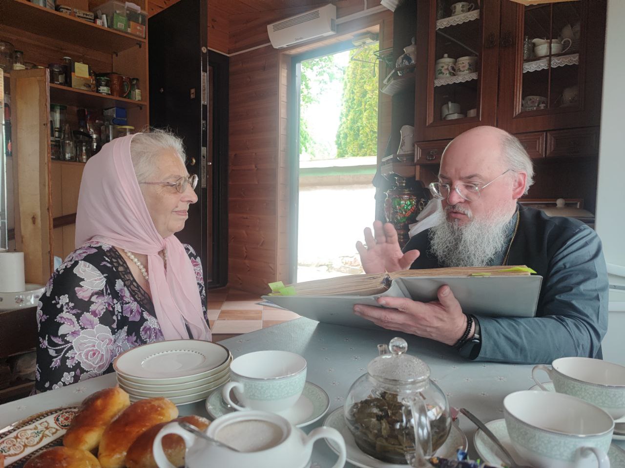 Владыка поздравил матушку с 85летием и вручил ей букет цветов и памятные подарки, а затем за чаепитием состоялась очень познавательная беседа – матушка Тамара, обладая замечательной памятью, поделилась воспоминаниями о своей молодости, о знакомстве с будущим отцом Леонтием, о служении на приходах, об архиереях и священнослужителях с которыми они с покойным супругом имели счастье общаться.