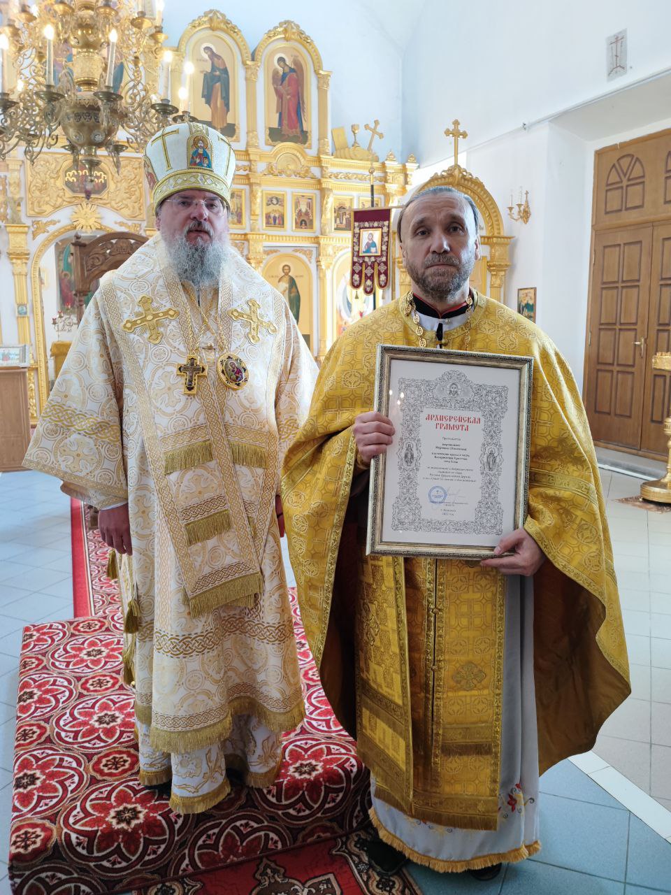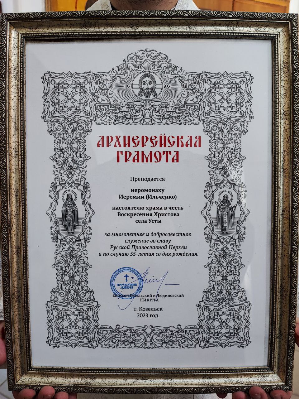 Во внимание к усердным трудам во славу Святой Церкви и в связи с 55летием со дня рождения настоятель храма иеромонах Иеремия (Ильченко) был награжден Архиерейской грамотой.