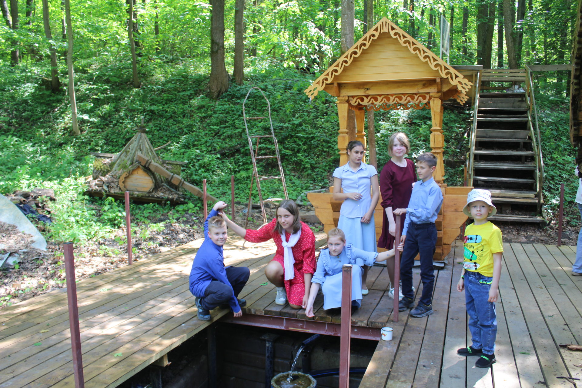 В ходе экскурсии паломники посетили   храм преподобного Кукши, который построен в греческом стиле. Ребята помолились и приложились к иконам храма, ознакомились с артефактами монастыря, найденными при раскопках. Следуя по территории монастыря дети постояли под ротондой, на которой было написано «Пречистому Твоему Образу поклоняемся Святый». Под ротондой Александр рассказал о святых местах Козельской епархии, живописных уголках природы.