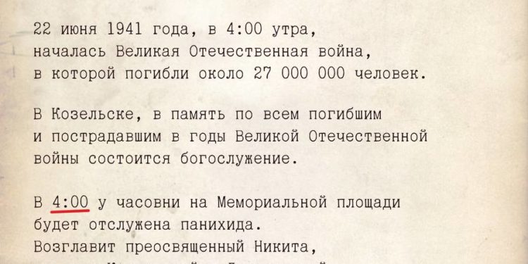 В Козельске, в память по всем погибшим и пострадавшим в годы Великой Отечественной войны состоится богослужение.