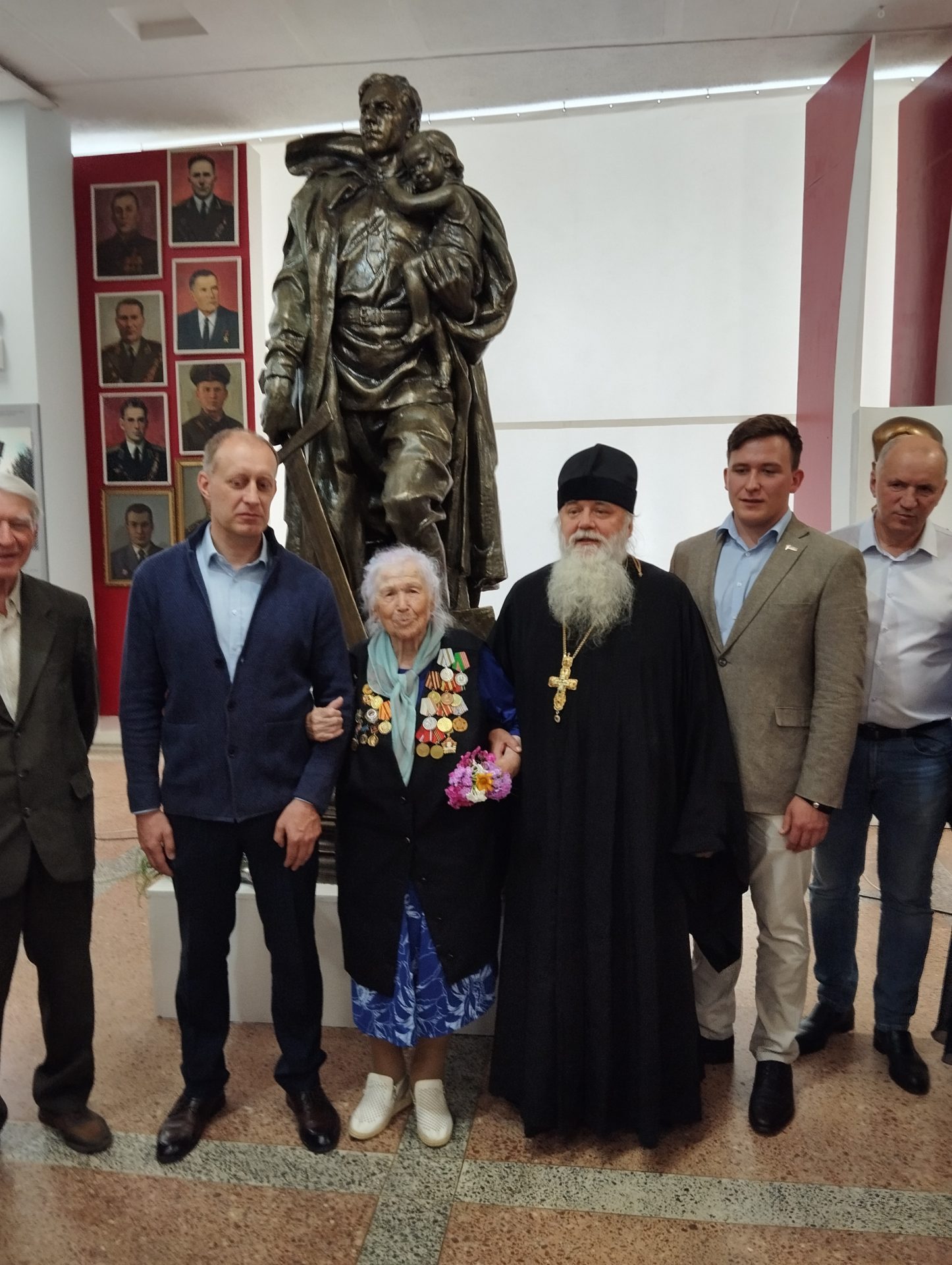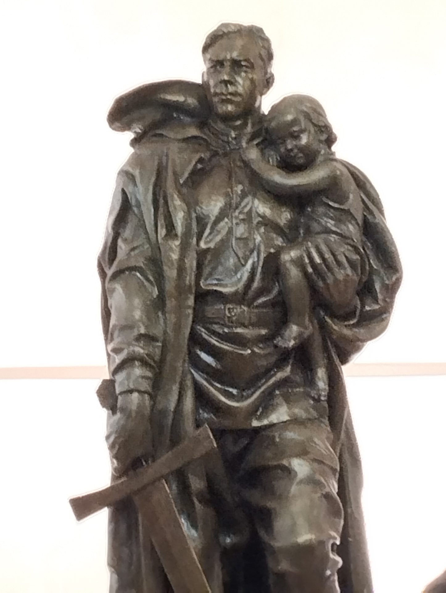 В своем выступлении отец Алексий, после поздравления, кратко остановился на истории создания памятника: «Монумент «Воину – освободителю» находится в Берлине на военном мемориале в Трептов – парке. Прообраз солдата, который держит немецкую девочку на руках, взят с простого русского солдата. Судьба этого воина непростая: он получил отпуск, но  дома узнал, что вся семья погибла, дом разбит. Казалось бы, человек должен озлобиться. Но душа русского солдата откликнулась на боль ребёнка, немецкой девочки, которая среди свистящих пуль ползала около тела убитой матери в Берлине, где ещё шли бои, и плакала. Солдат спас девочку, взял её на руки, отнёс в безопасное место, но сам был тяжело ранен и от ранений скончался.