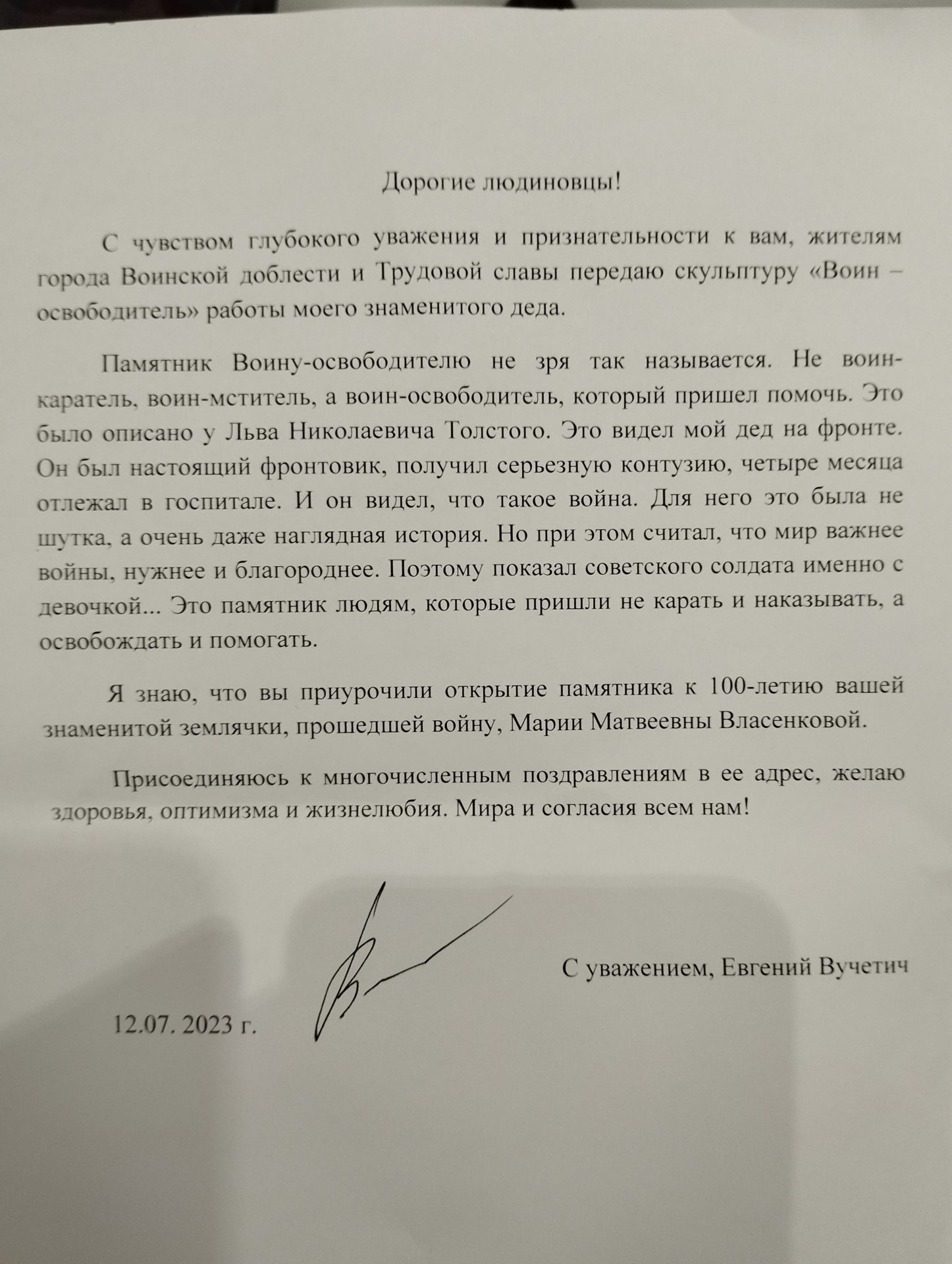 На важном и значимом событии для города – возвращении памятника «Воину – освободителю» в стены Городского музея также присутствовали и выступали Дмитрий Афанасьев – руководитель исполкома «Общероссийского народного фронта» в Калужской области, Андрей Петров – депутат Законодательного собрания Калужской области, Андрей Бауэр — директор Кировского музея Калужской области. Здесь же были дети, жители и гости города. Ведущая торжества зачитала присутствующим поздравительную телеграмму для всех людиновцев от скульптора Евгения Викторовича Вучетича (это внук своего знаменитого деда) полного тёзки, Евгения Викторовича Вучетича, тоже скульптора и создателя величественного монумента «Воину – освободителю» в Берлине.
