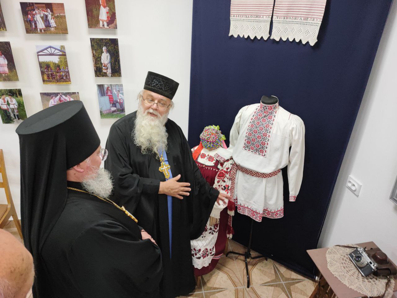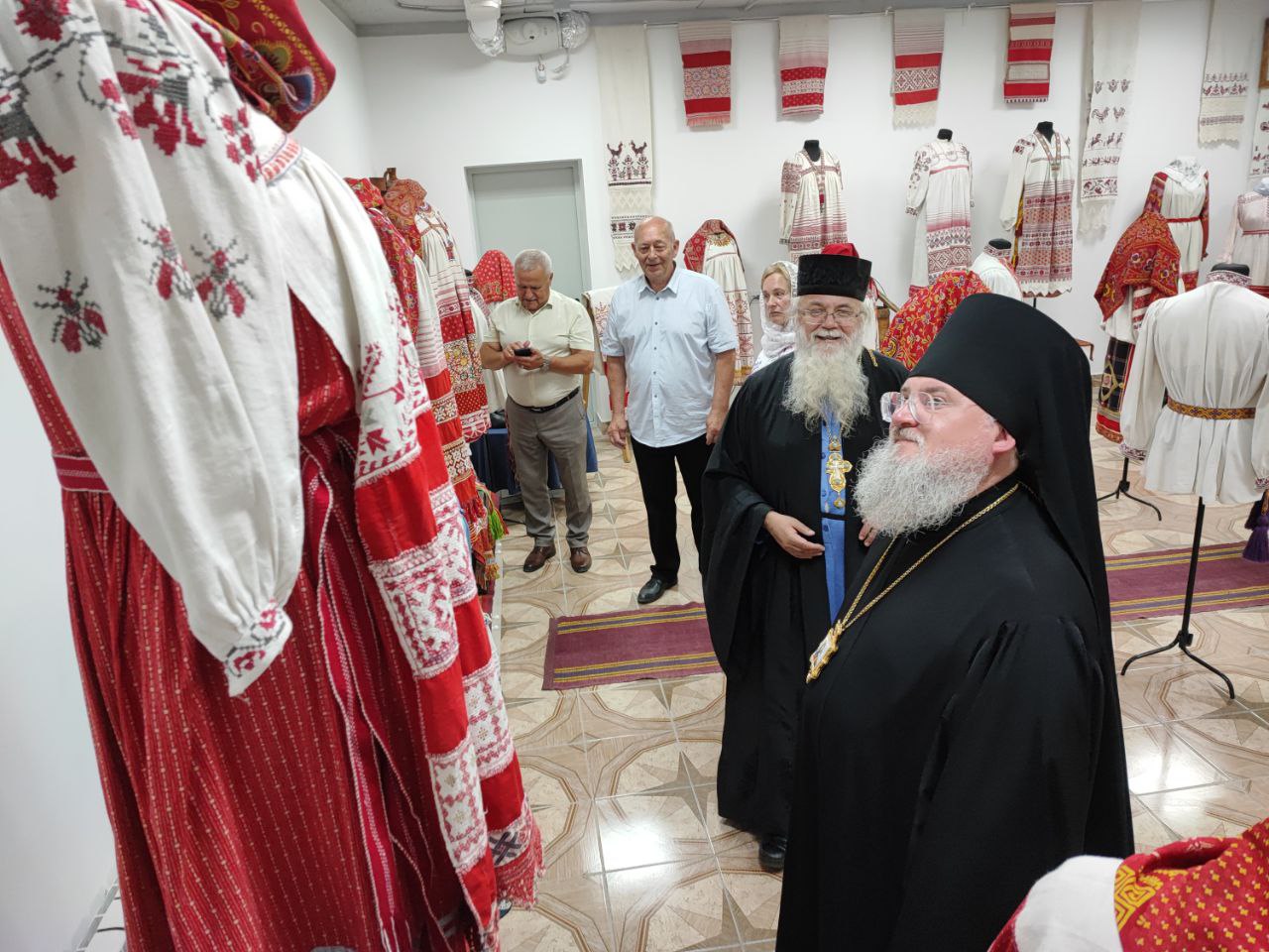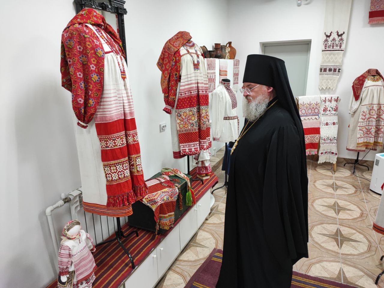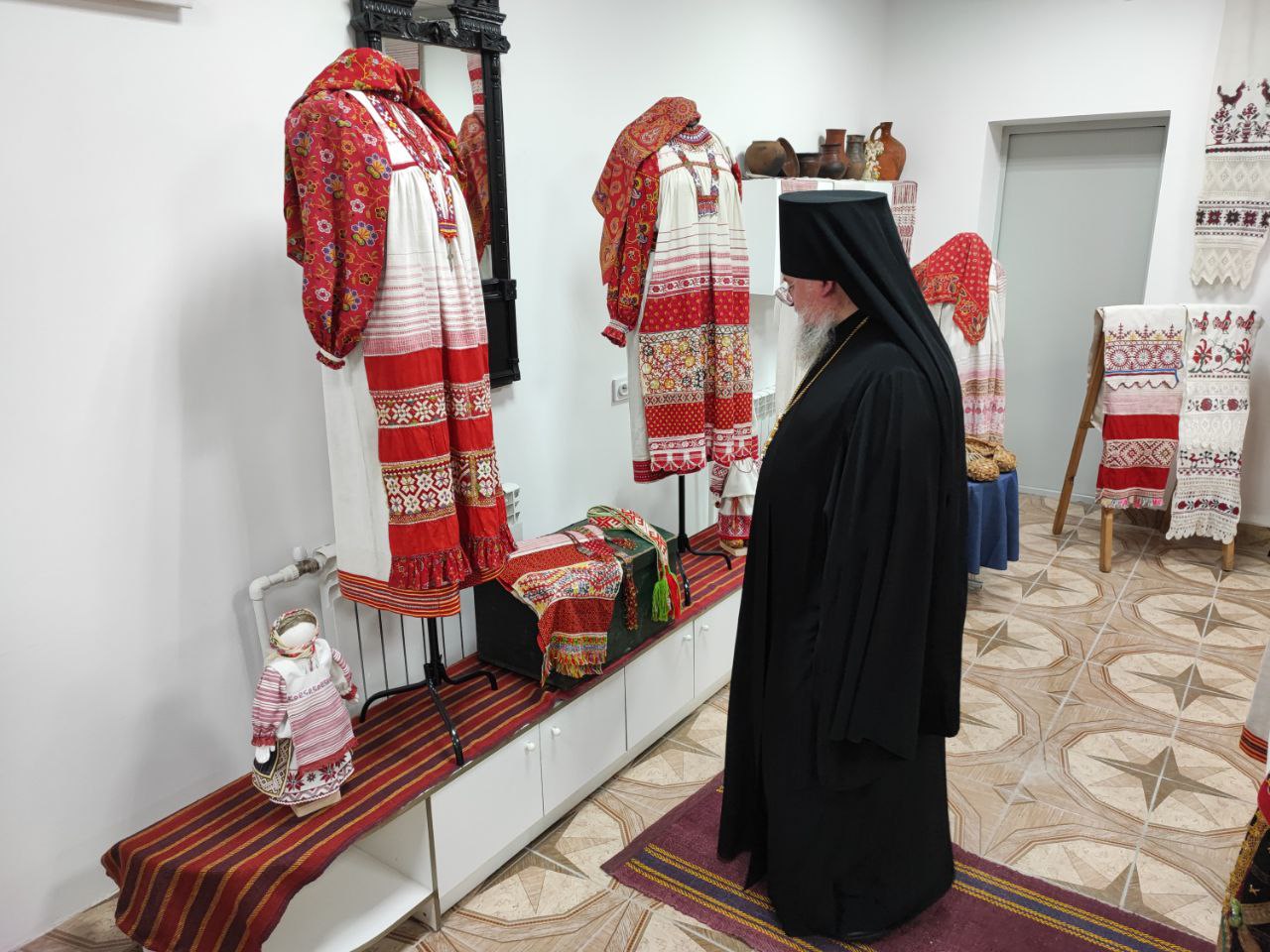 Владыка Никита с настоятелем храма и гостями посетили новую экспозицию старинных русских костюмов и предметов Калужской губернии, оформленную и размещённую в помещении нижнего этажа Духовно – просветительского центра «Светоч».
