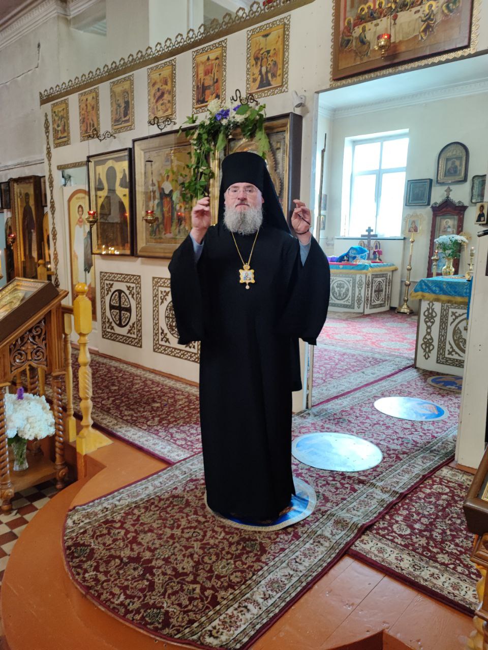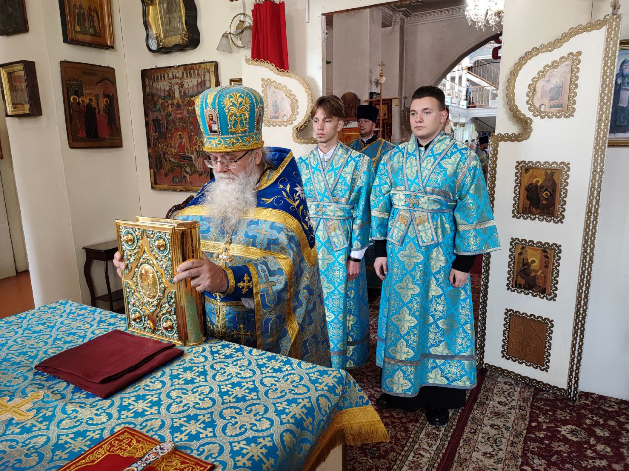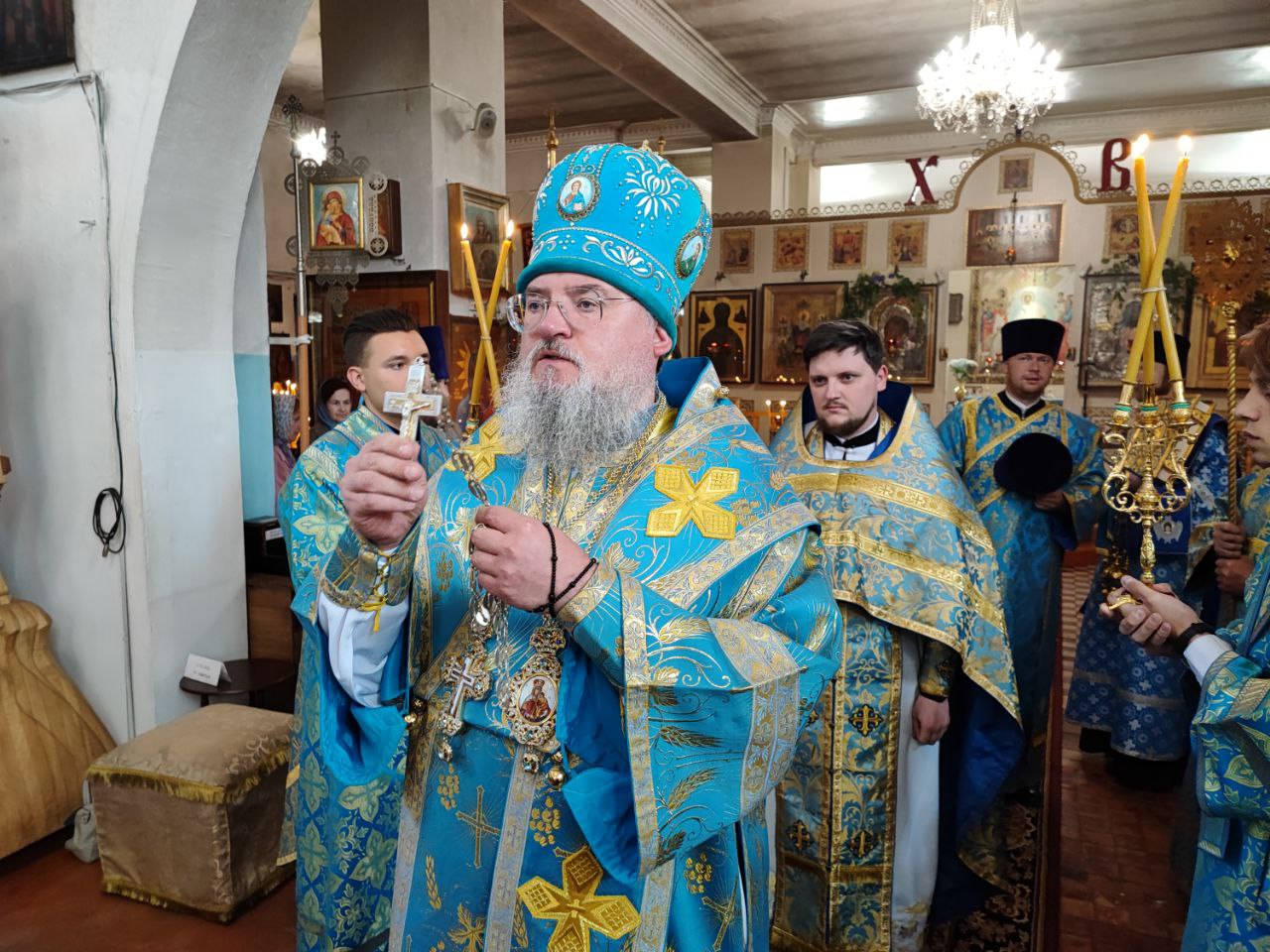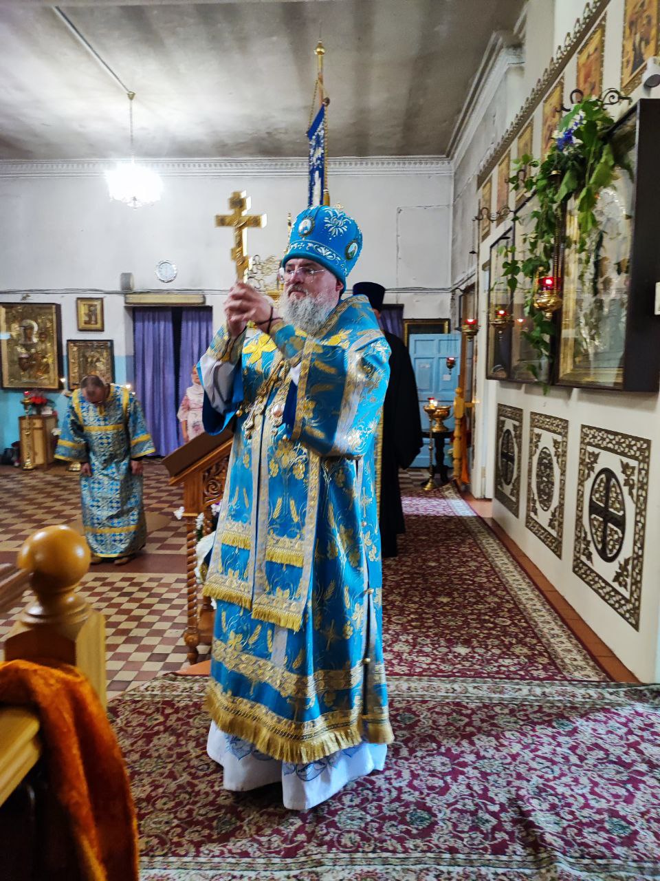 Владыка поблагодарил и поздравил настоятеля собора отца Алексия с праздником, пожелав ему Милостью Божией и молитвами Богородицы, а также помощью добрых людей завершить восстановительные работы по храму.