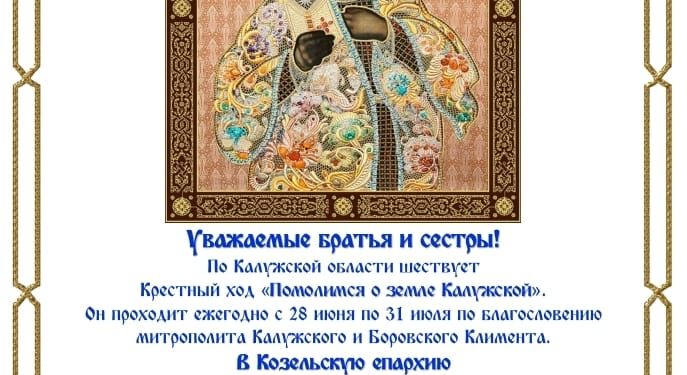 По благословению митрополита Калужского и Боровского Климента в Калужской митрополии с 28 июня по 31 июля 2023 года совершается ежегодный Крестный ход «Помолимся о земле Калужской» с чудотворной Калужской иконой Божией Матери, а также иконой новомучеников и исповедников Церкви Русской пострадавших на Калужской земле.