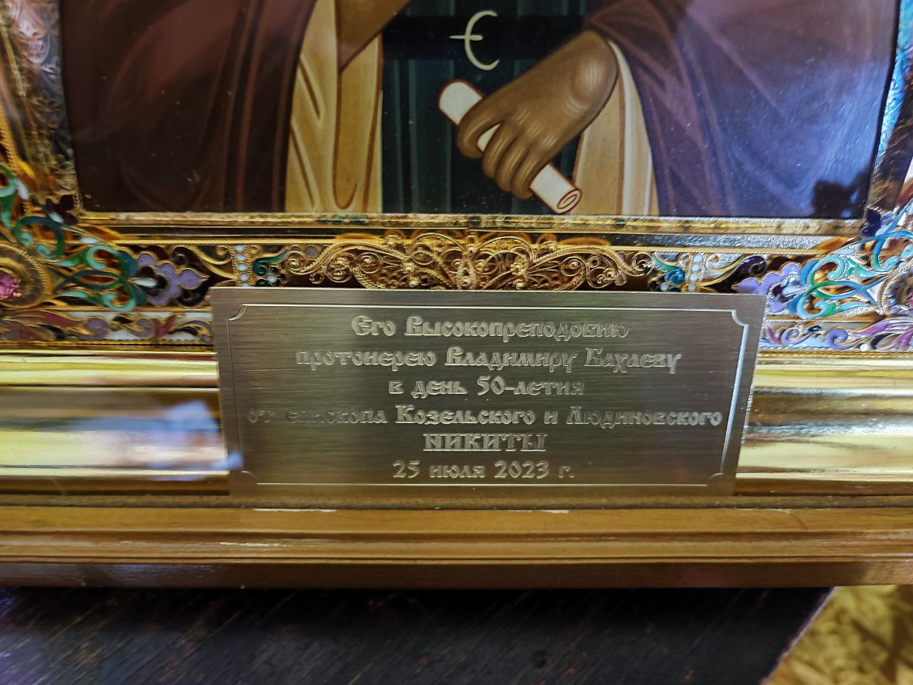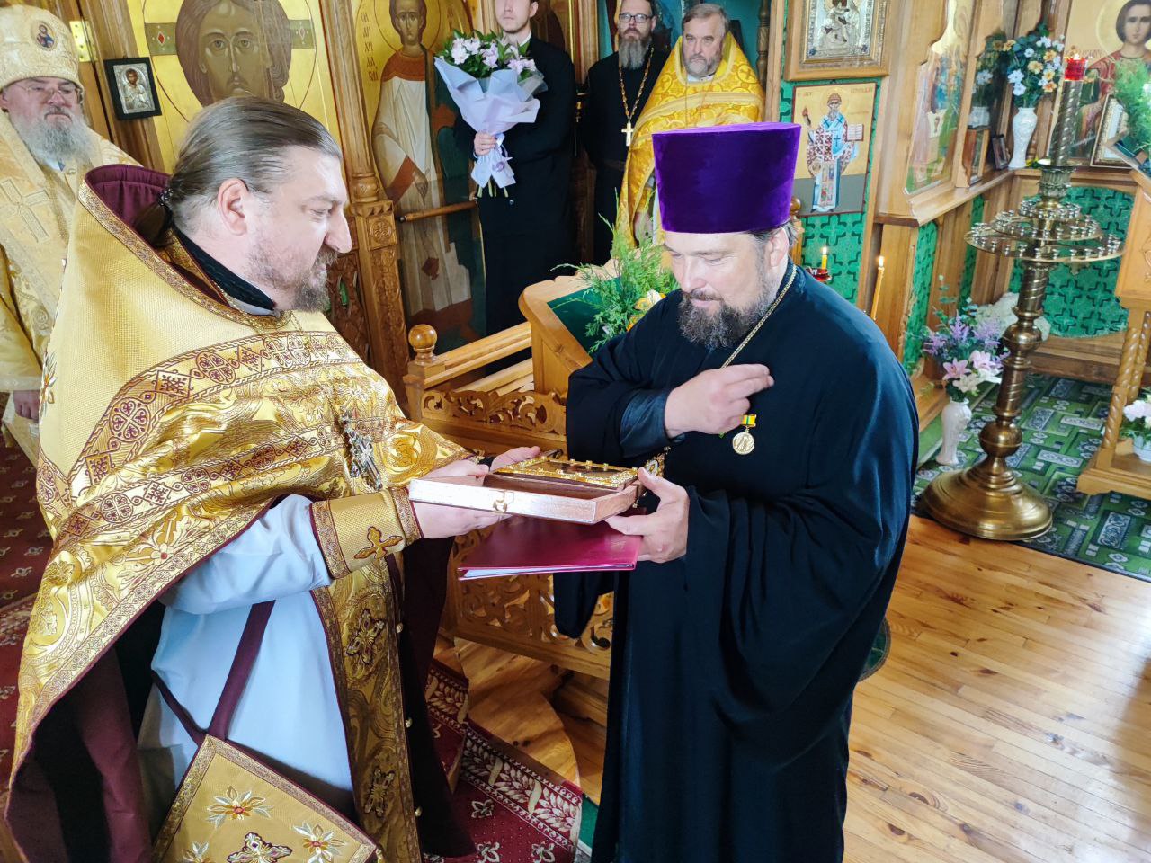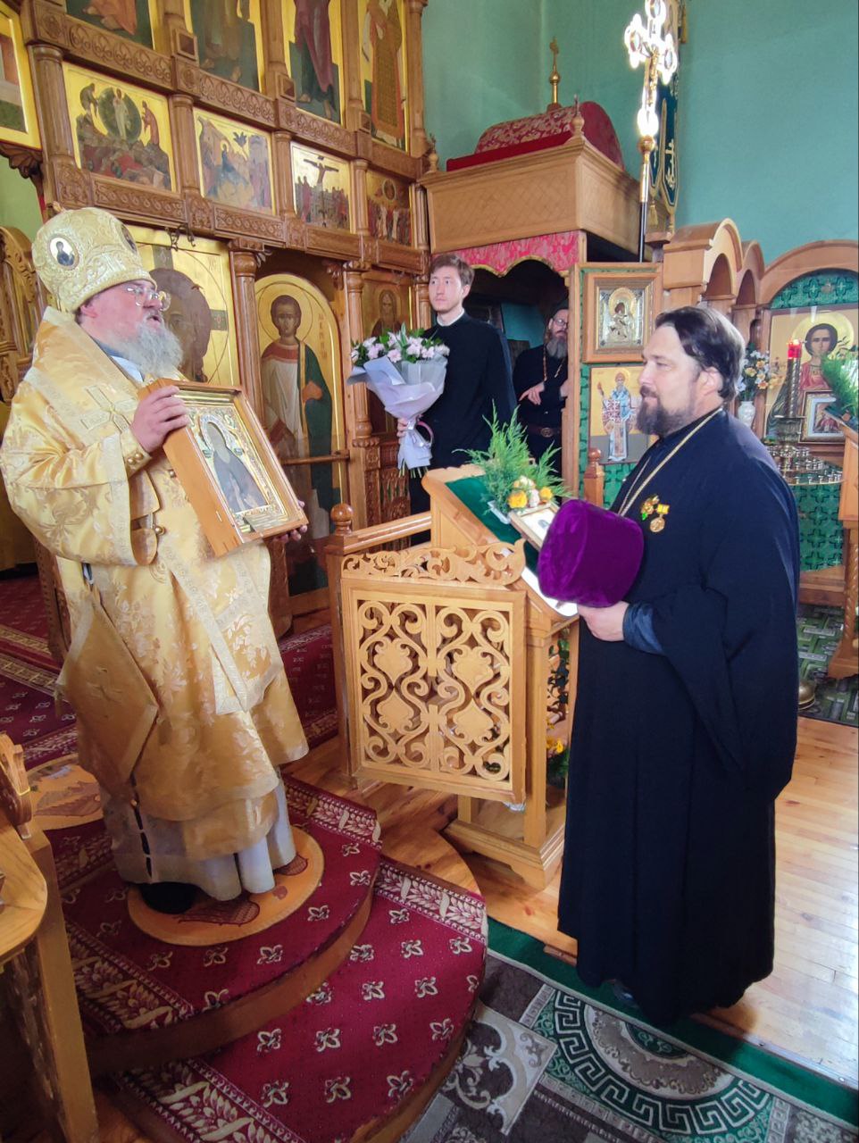 Епископ Никита преподнес отцу Владимиру икону преподобного Сергия Радонежского.