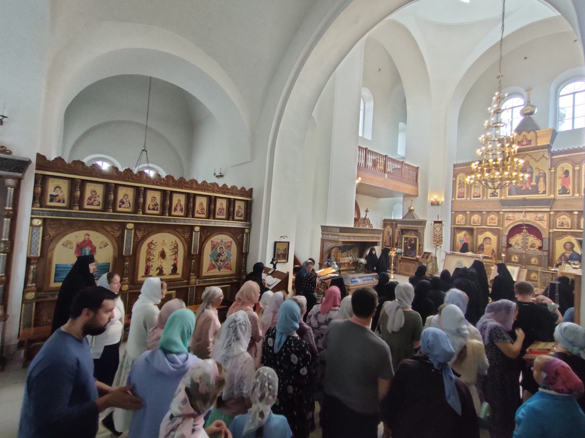 Братия и паломники обители встретили крестный ход у святых врат обители. Святыни торжественно с пением тропарей и молитвословий перенесли в главный храм монастыря в честь иконы Спаса Нерукотворного. Приехавшие в монастырь с ночлегом паломники из других регионов России встречали крестный ход впервые. В храме Калужская икона Божьей Матери заняла центральное место перед амвоном. Поклонение святыням сопровождалось Божественной литургией после которой был отслужен молебен Пресвятой Богородице. Братия обители и богомольцы, пришедшие поклониться Калужской иконе Божией Матери, отмечали необычайную благодать и любовь, исходившие от чудотворного образа. После Литургии и молебна святыни отправились в город Козельск.