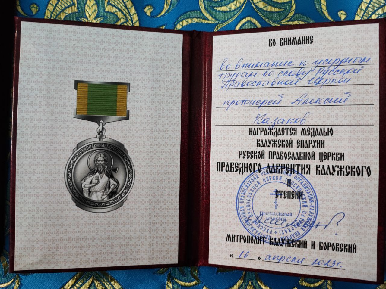 Во внимание к усердным трудам во Славу Святой Православной Церкви и в связи с 55-летием со дня рождения настоятель прихода протоиерей Алексий Казаков был награжден медалью Калужской митрополии Русской Православной Церкви святого праведного Лаврентия Калужского.