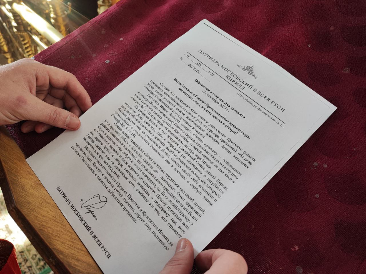 На запричастном стихе было оглашено послание Святейшего Патриарха Кирилла по случаю Дня трезвости.