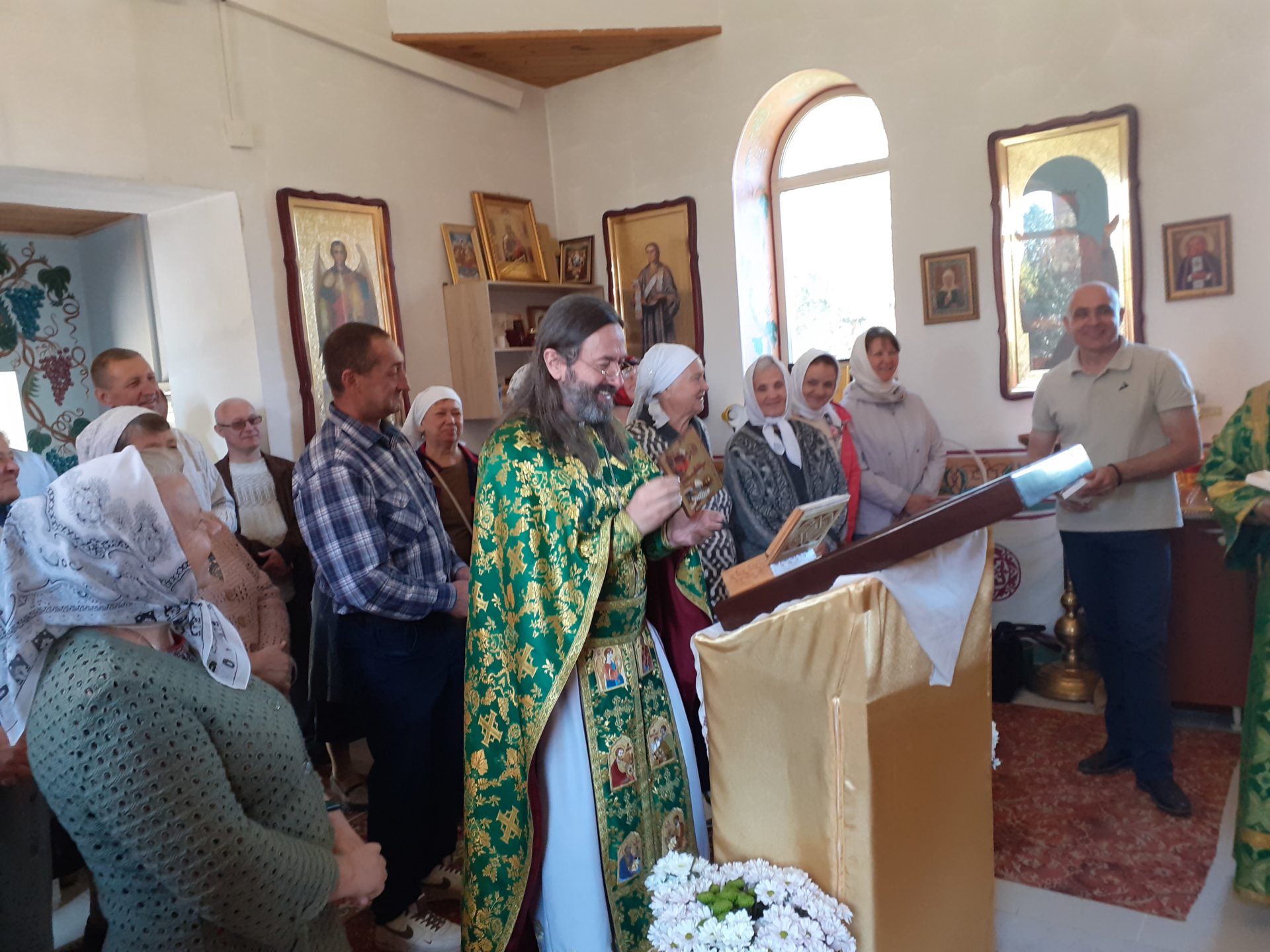 После литургии от лица благочинного и настоятеля храма в честь иконы Казанской Божией Матери протоиерея Алексия Жиганова диакон Андрей поздравил иерея Георгия и всех прихожан с праздником и вручил подарки.