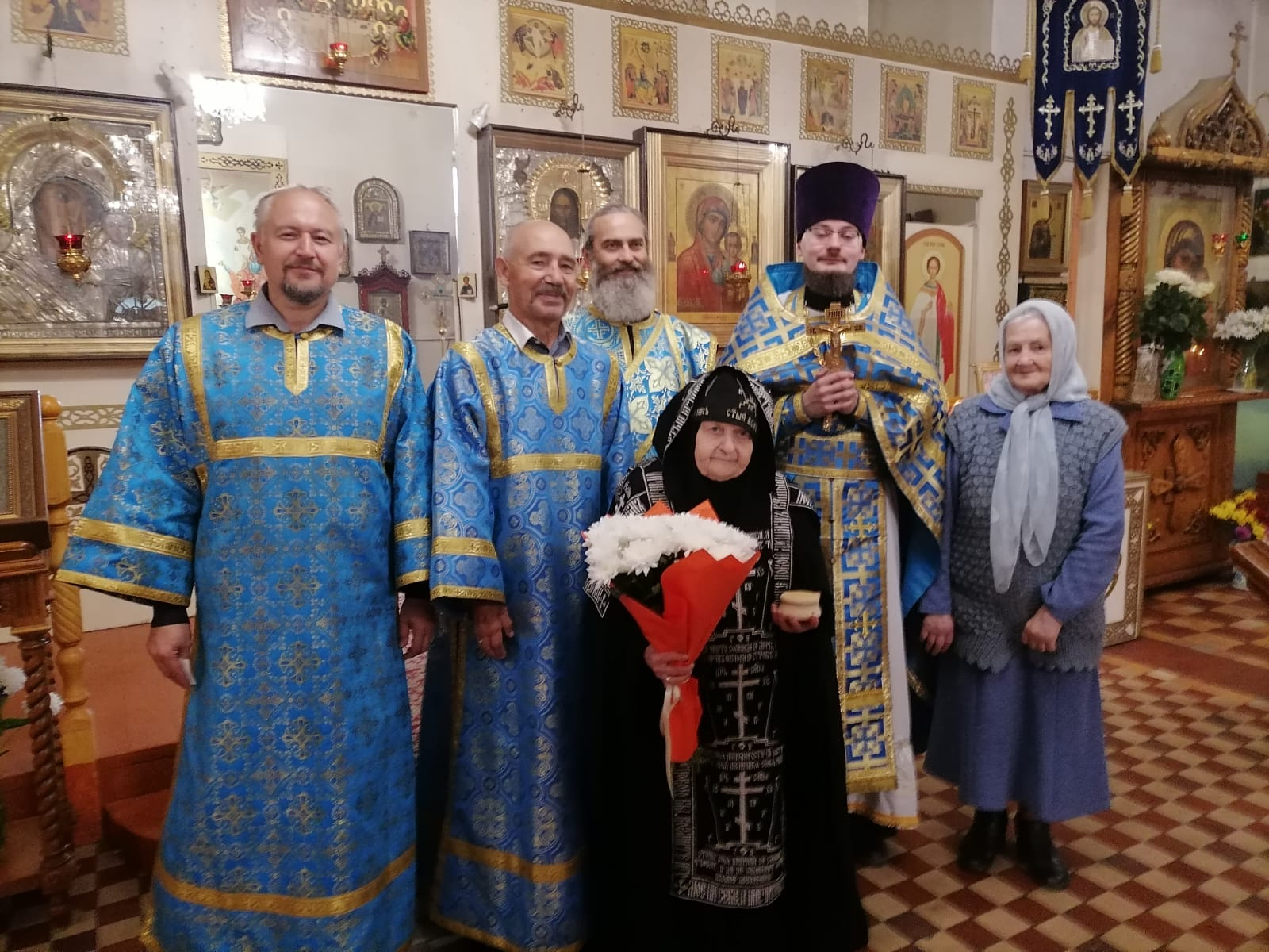 В этот же день отец Алексий поздравил старейшую прихожанку Казанского собора схимонахиню Рахиль (Сначёву), свою родную бабушку, с днем рождения. Своим жизнелюбием и стойкостью в Вере Христовой мать Рахиль, в свой 91 год, может служить примером всем прихожанам. Все молящиеся вместе со священнослужителями и церковным хором пропели именнинице многая благая лета! Отец Алексий в завершении пожелал матери Рахиль и всем прихожанам заступничества Царицы Небесной и Божьего благословения.