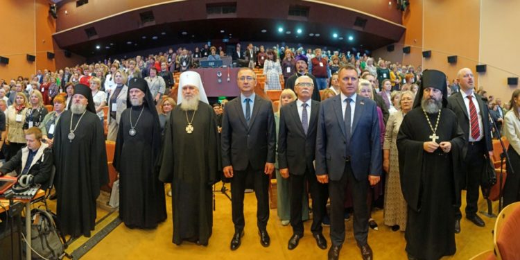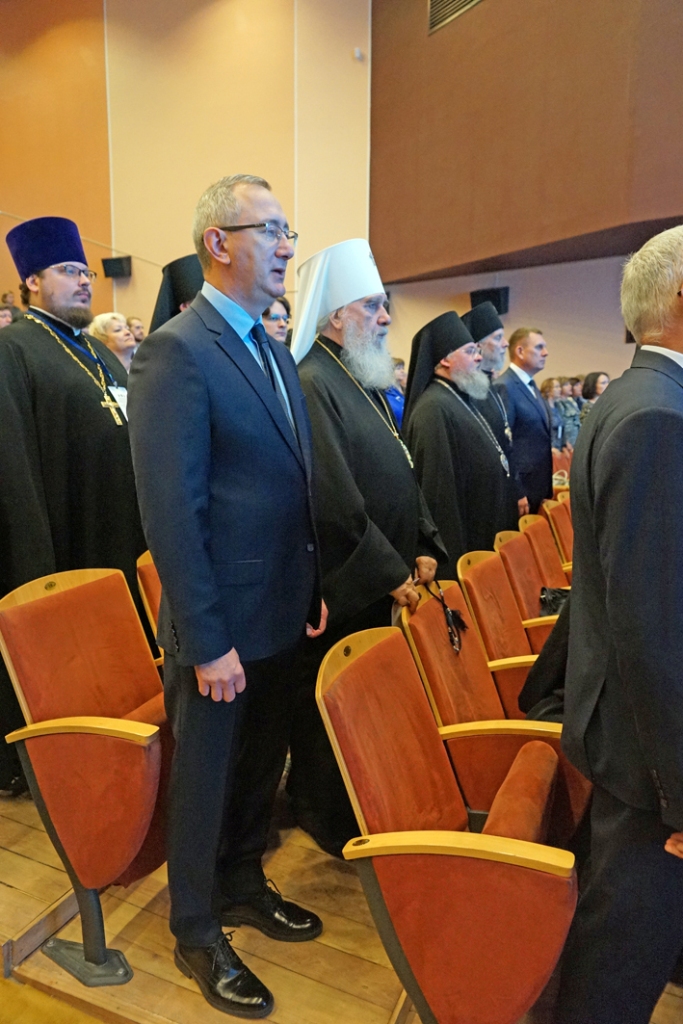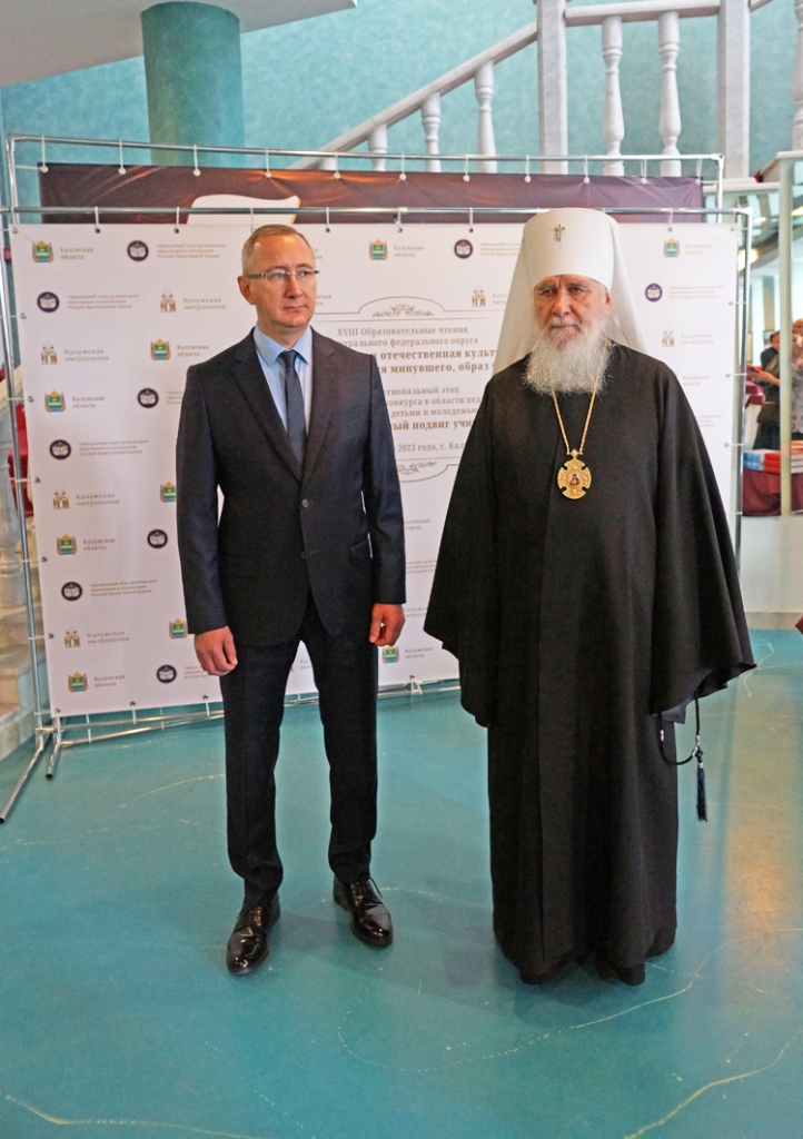 Затем губернатор Калужской области Владислав Валерьевич Шапша приветствовал делегатов XVIII образовательных чтений Центрального федерального округа и XXVI Богородично-Рождественских образовательных чтений Калужской митрополии. Владислав Валерьевич отметил важность объединения усилий в сохранении нравственных устоев общества: «Сегодня для страны непростое время. Мы стоим перед большими испытаниями. Идет специальная военная операция. Мы боремся с абсолютным злом. И победить в этой борьбе можно только, имея очень крепкий духовный фундамент. Я рассчитываю, что все мы здесь внесем свою крупицу в формирование новых подходов в воспитании молодёжи и в нашу общую победу».