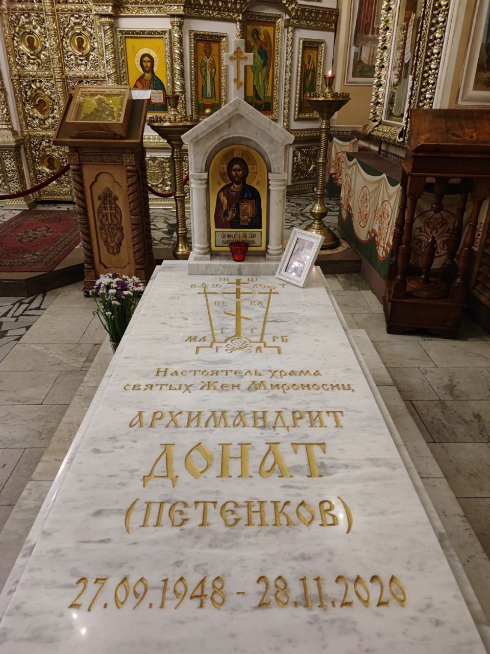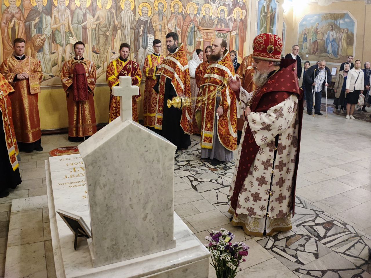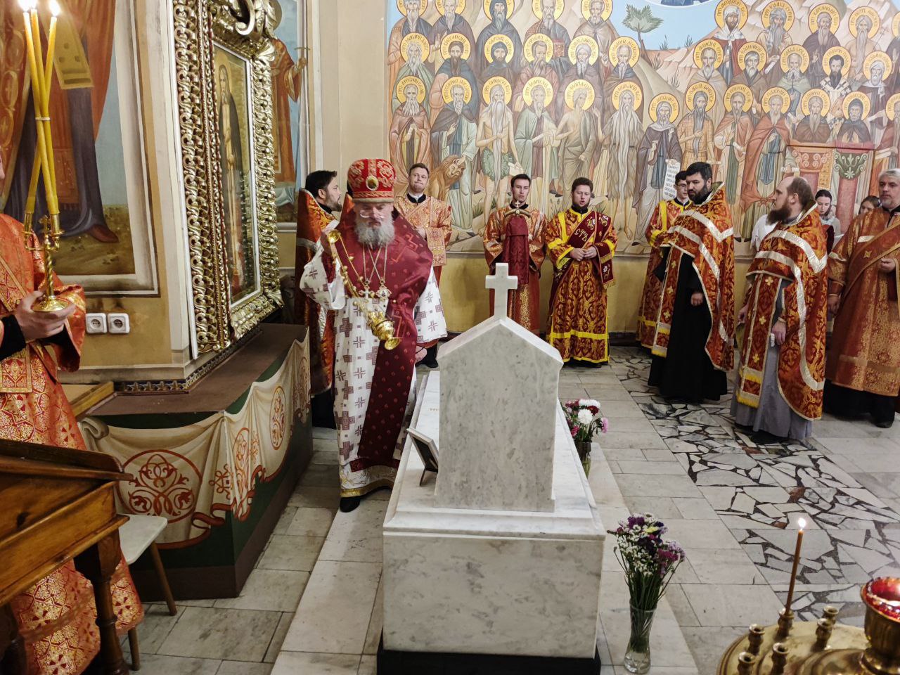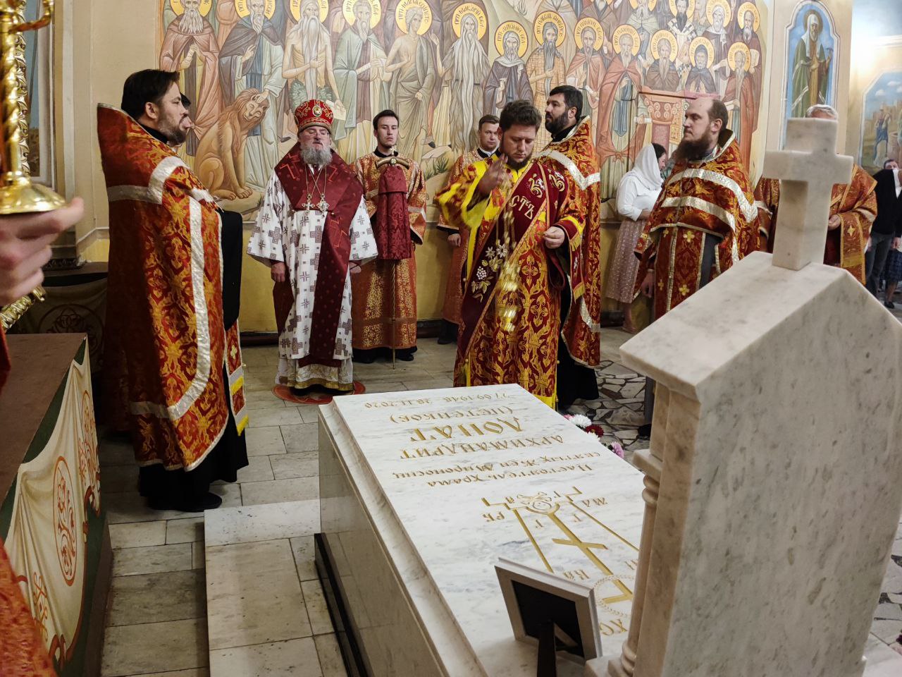 Перед первым часом священнослужители совершили заупокойную литию у могилы почившего многолетнего настоятеля храма архимандрита Доната (Петенкова) день рождения которого приходится на праздник Воздвижения.