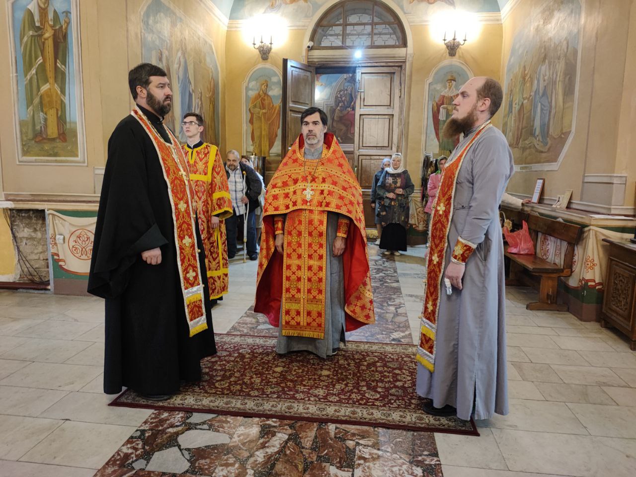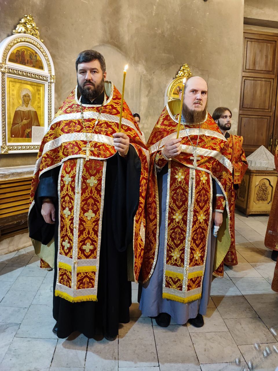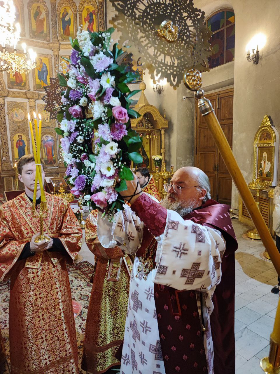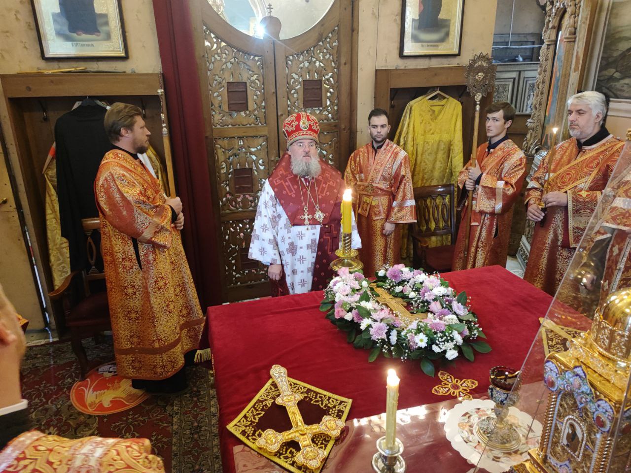 Архипастырю сослужили: настоятель храма протоиерей Вадим Кудрявцев, протоиерей Дмитрий Новаковский, протоиерей Антоний Хатунцев, иерей Николай Лукашев, диакон Олег Митин, диакон Евгений Ковригин, диакон Даниил Бойко и диакон Тимофей Вишняков.