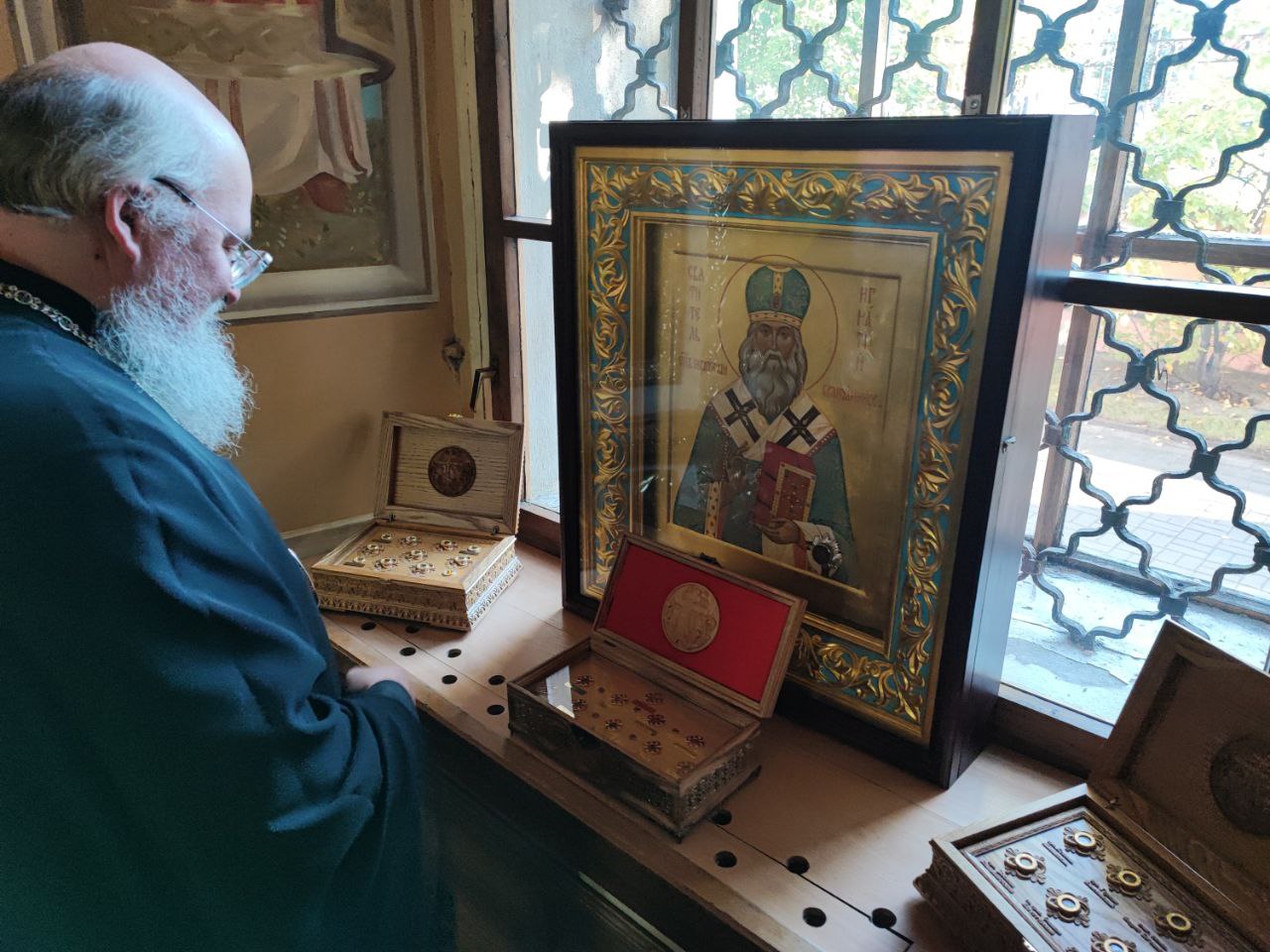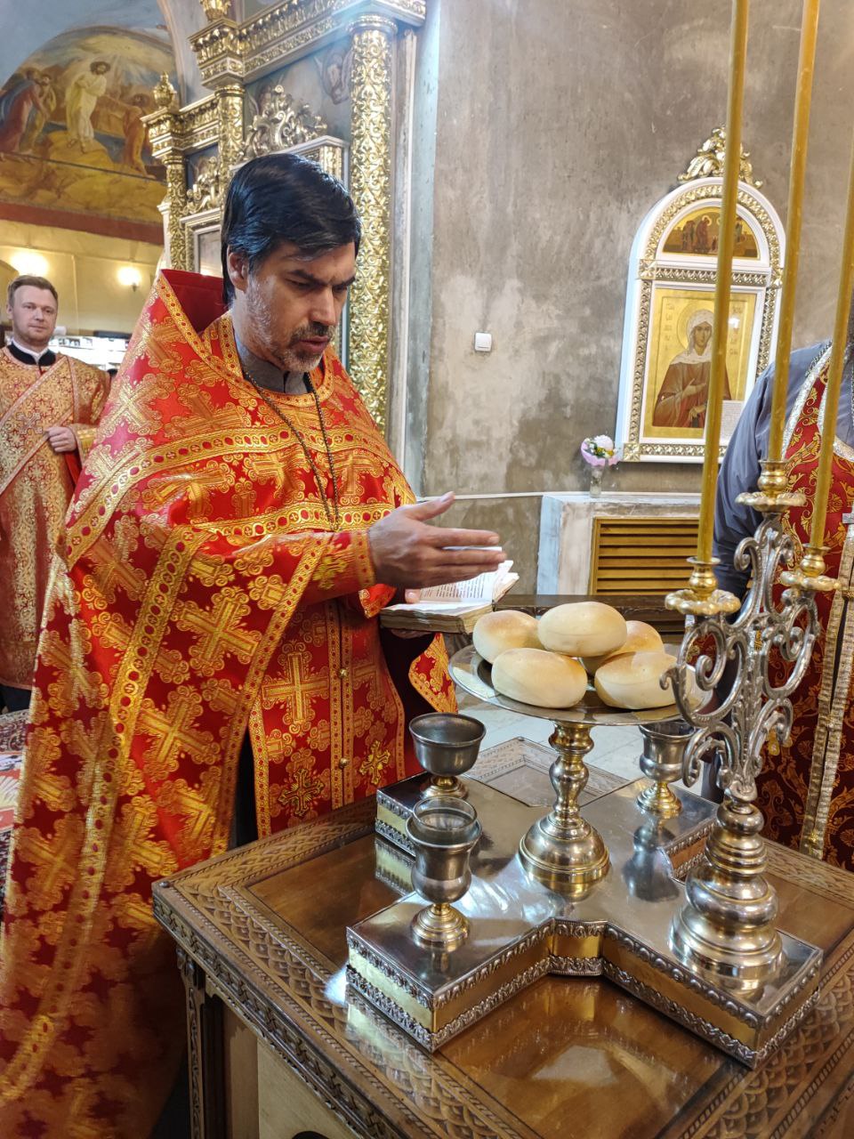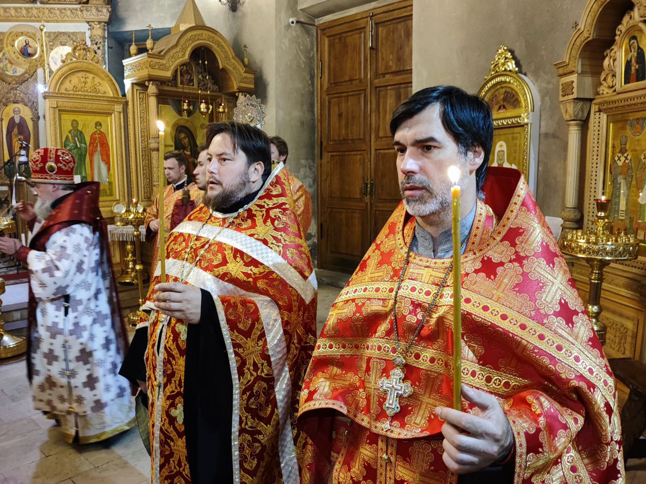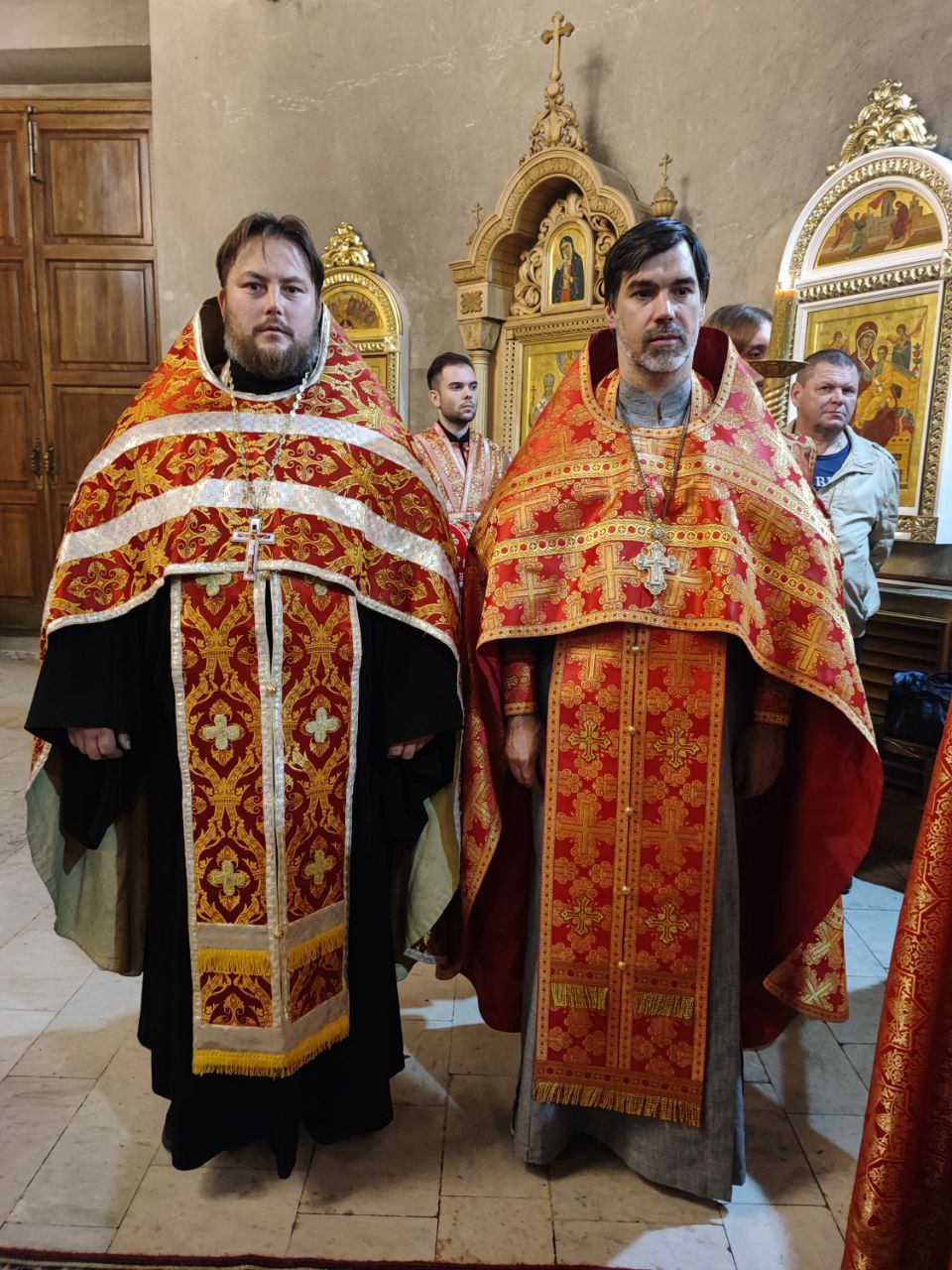 Архипастырю сослужили: настоятель храма протоиерей Вадим Кудрявцев, протоиерей Дмитрий Новаковский, протоиерей Антоний Хатунцев, иерей Николай Лукашев, диакон Олег Митин, диакон Евгений Ковригин, диакон Даниил Бойко и диакон Тимофей Вишняков.
