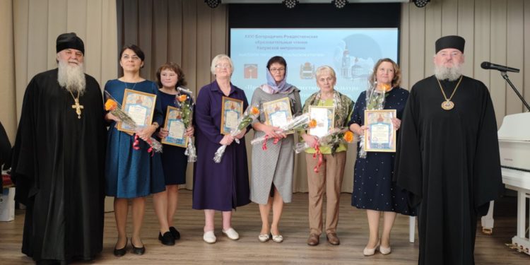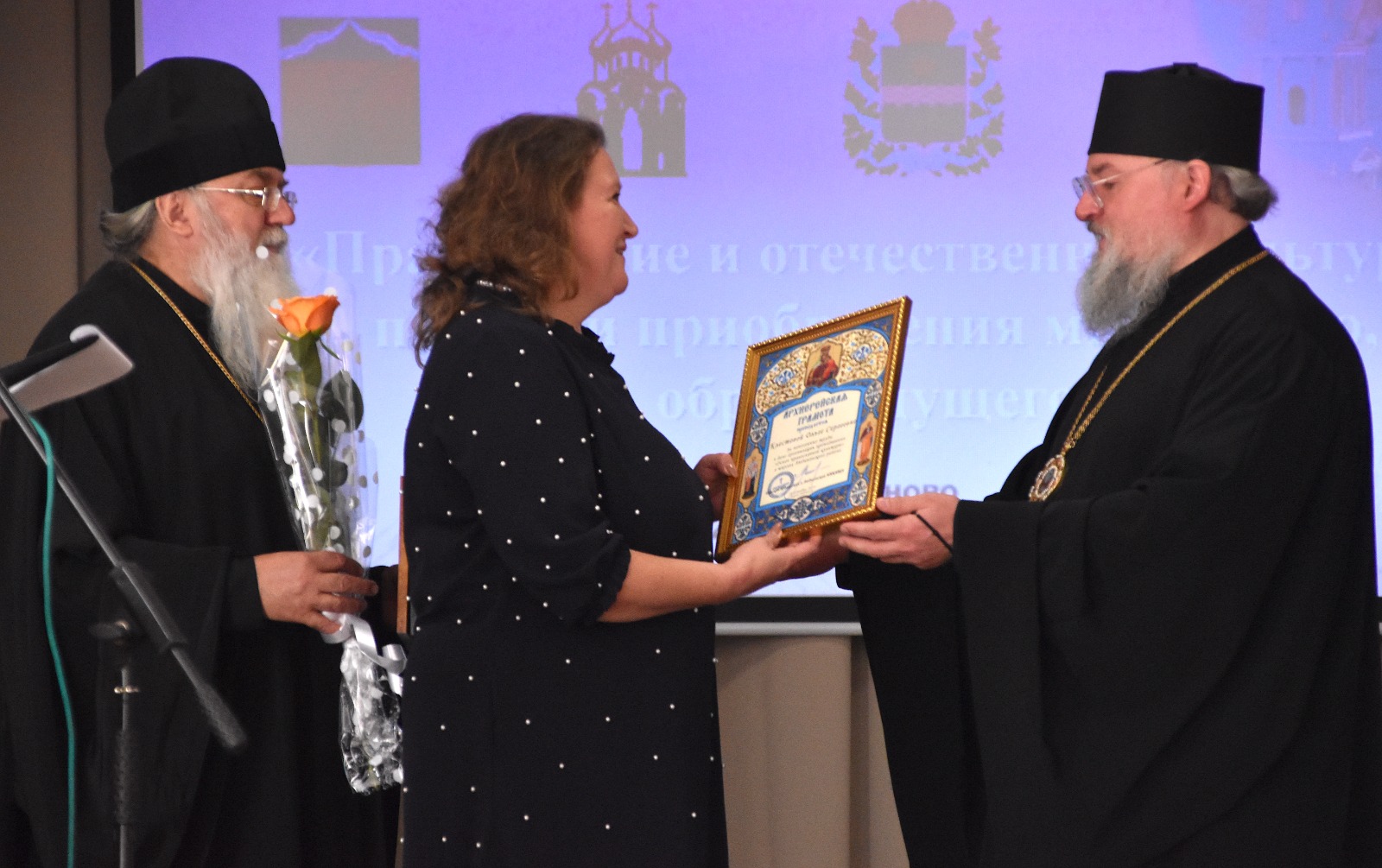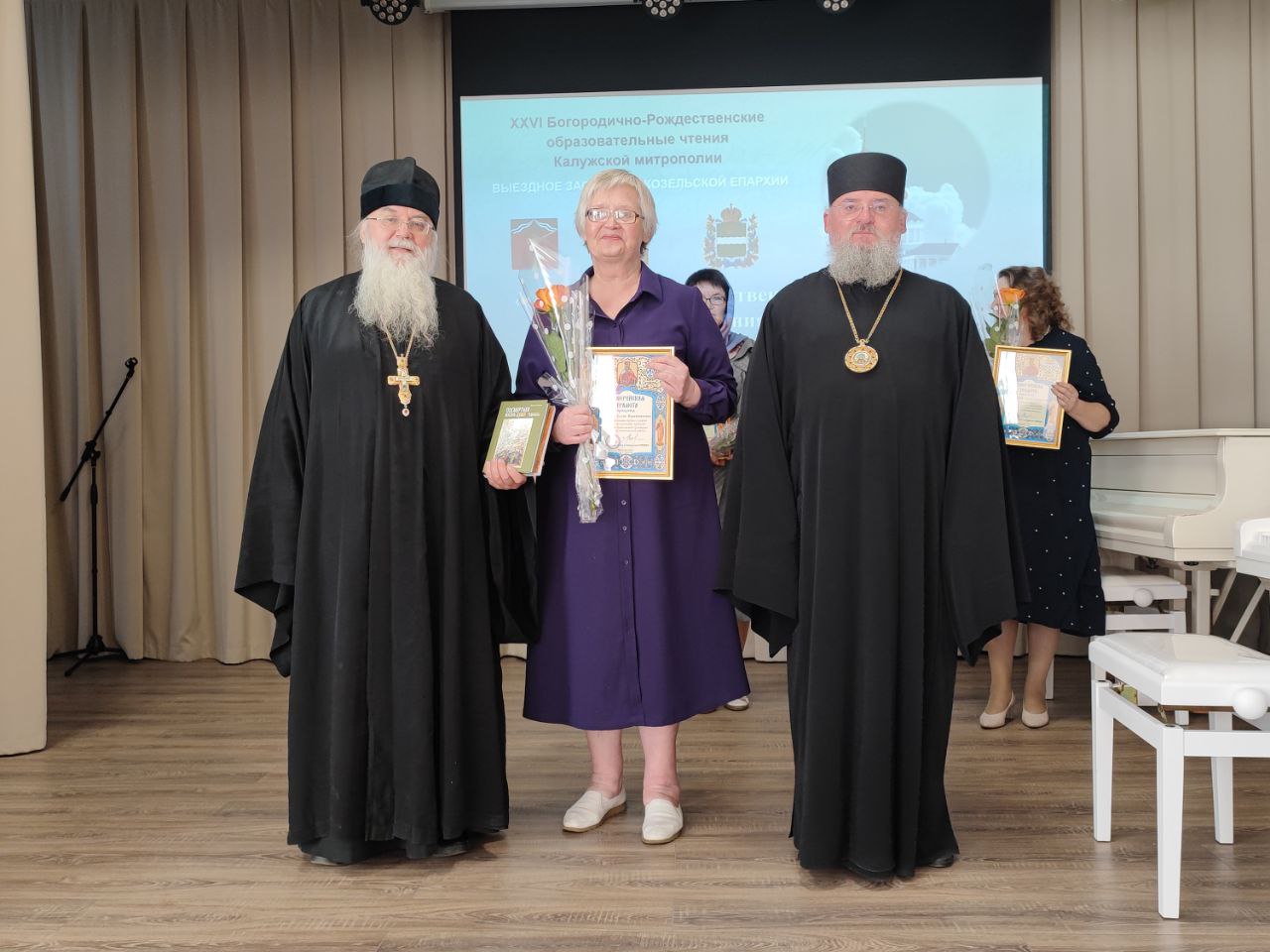 Затем епископ Никита и настоятель Казанского собора города Людиново протоиерей Алексий Жиганов вручили Благодарственные Архиерейские грамоты муниципальным координаторам преподавания курса «Основы православной культуры» за усердные труды во славу Русской Православной Церкви. В том числе Архиерейская грамота также была вручена ветерану труда Елене Валентиновне Орловой за многолетний и усердный труд в преподавании предмета ОПК.
