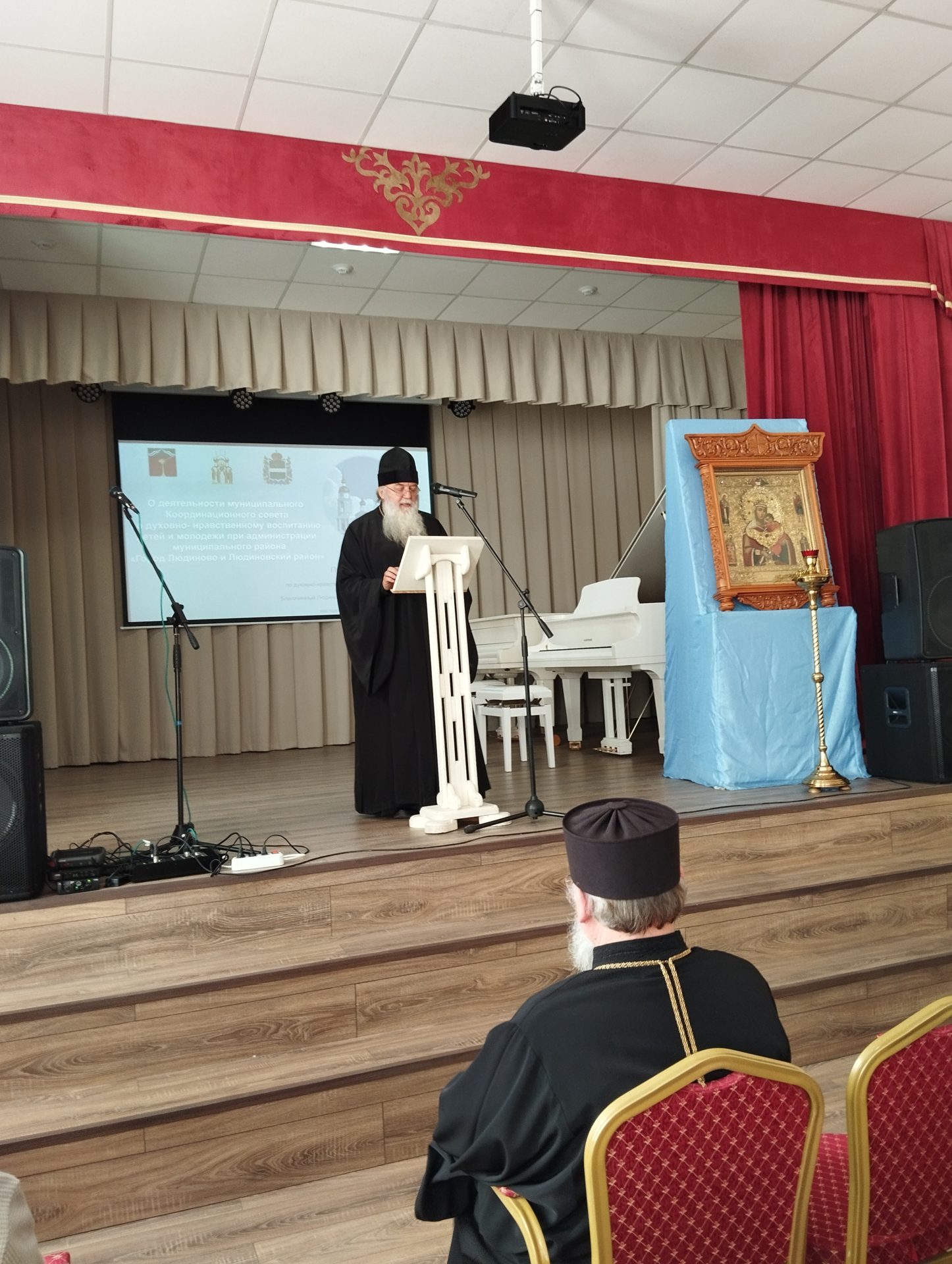 Перед участниками пленарного заседания с докладом «О деятельности муниципального Координационного совета по духовно – нравственному воспитанию детей и молодёжи при администрации муниципального района «город Людиново и Людиновский район», в том числе по созданию условий для повышения качества преподавания «Основ православной культуры» в образовательных организациях» выступил благочинный 6-го округа Козельской епархии протоиерей Алексий Жиганов, член Координационного совета при Правительстве Калужской области.