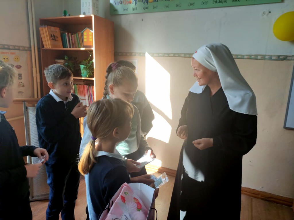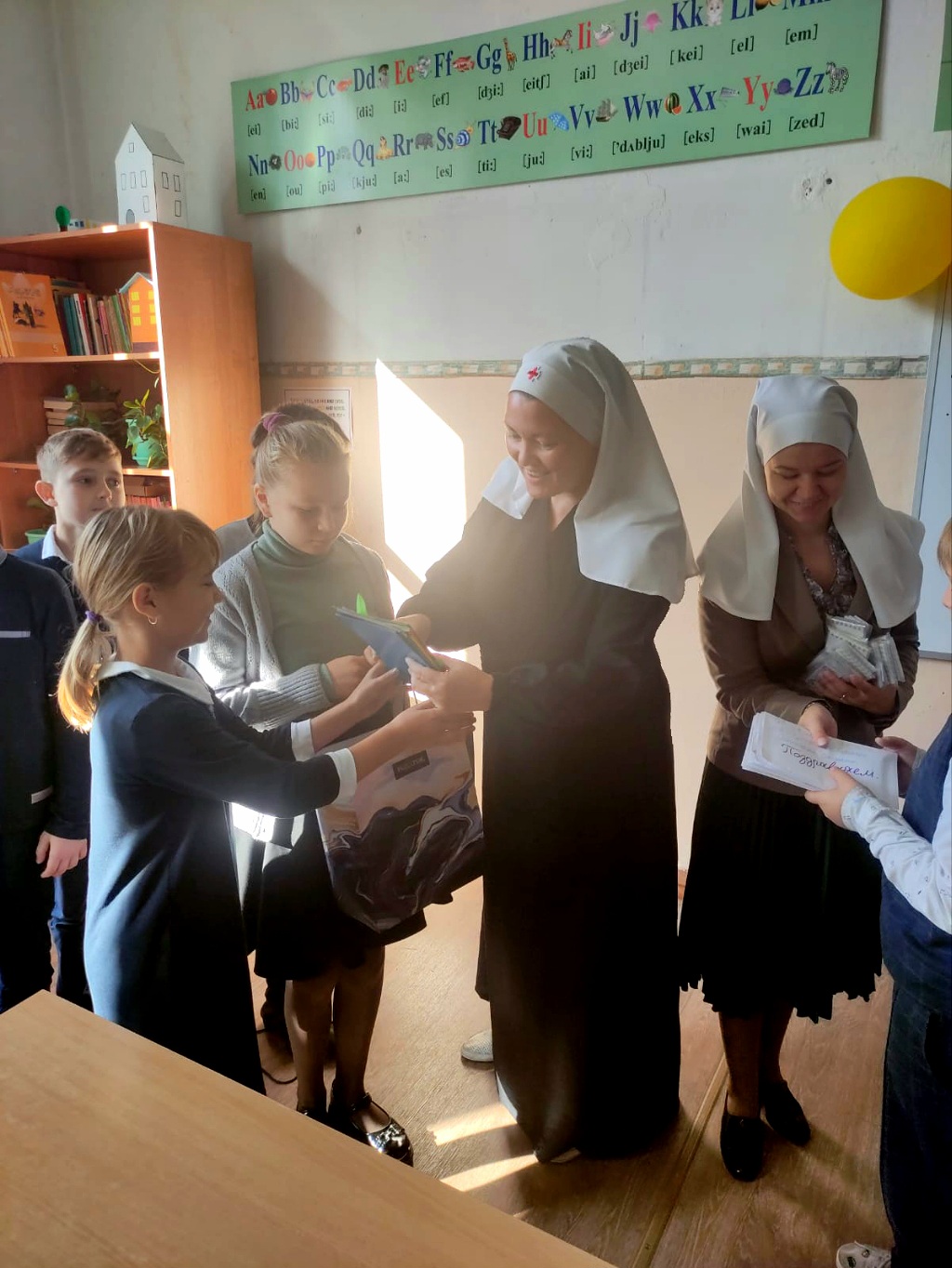 Сестры были очень тронуты такими теплыми, исходящими от добрых детских сердец словами поздравлений и пожеланий, что в благодарность подарили всем ребятам закладки и блокноты из сувенирной коллекции Сестричества.