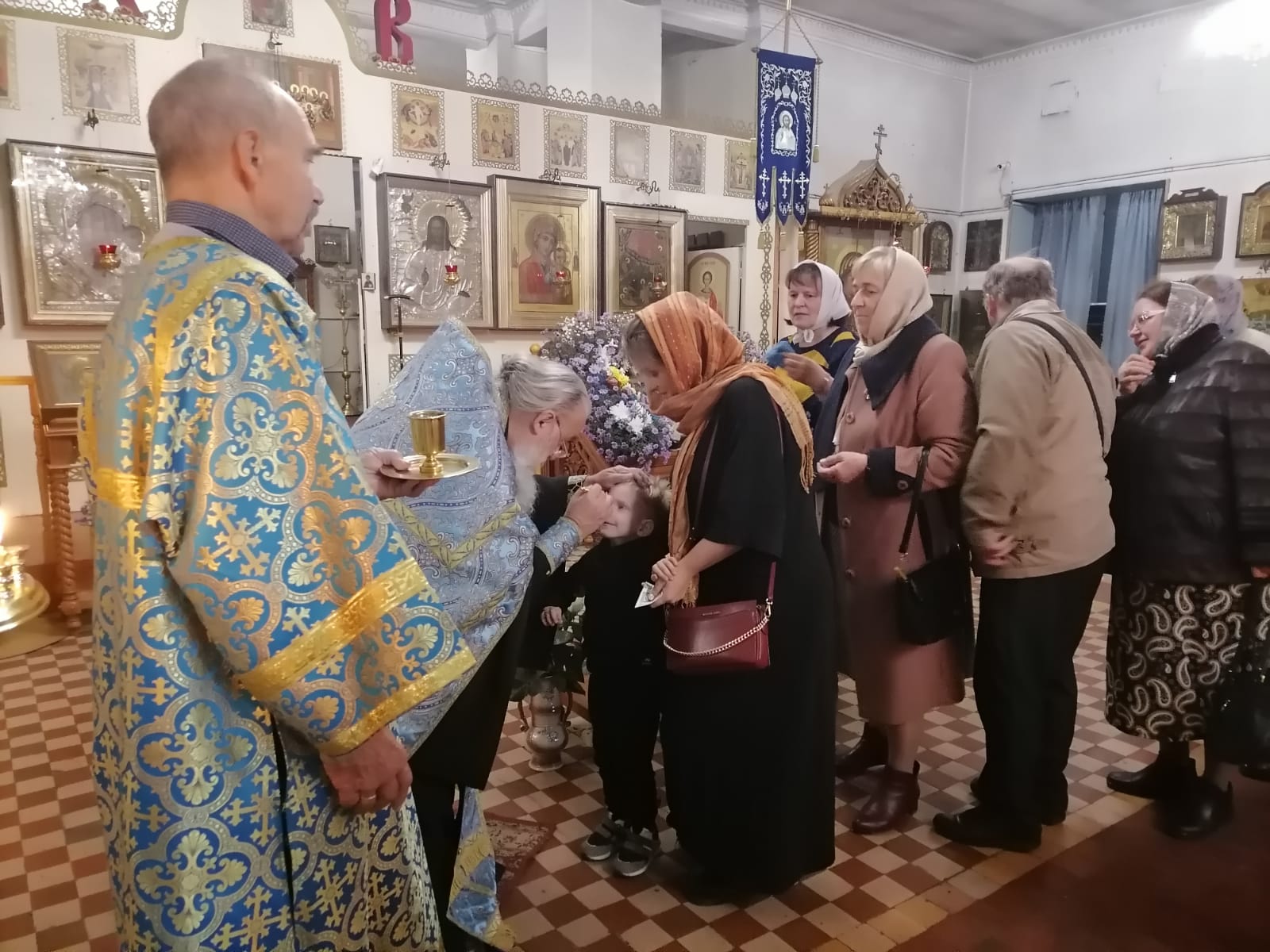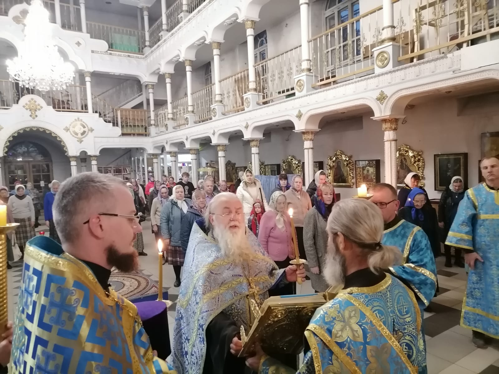 В день праздника, после Божественной литургии, настоятель собора отец Алексий произнёс проповедь: «Служба Покрова Богородицы – это богослужение радости и благодарности, ведь в этот день верующие вспоминают, как много столетий назад Пресвятая Дева пришла на помощь зовущим Ее, 14 октября Русская Православная Церковь вспоминает событие, произошедшее далеко от русской земли – в Византии. Столица империи в очередной раз была в осаде, жители были обессилены и готовы сдаться, но собрались в храме на общую молитву. И именно во время нее присутствовавшему в церкви юродивому Андрею и его ученику стало видно, что вместе с народом к Господу обращается и Богородица, держа над смиренно склоненными головами свой омофор (платок). Вскоре после этого чудесного явления Константинополь был спасен. И так же Богородица приходит и сейчас к тем, кто обращается к Ней с молитвой.