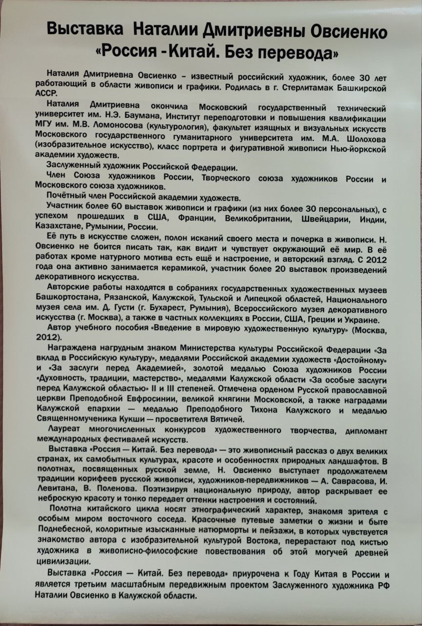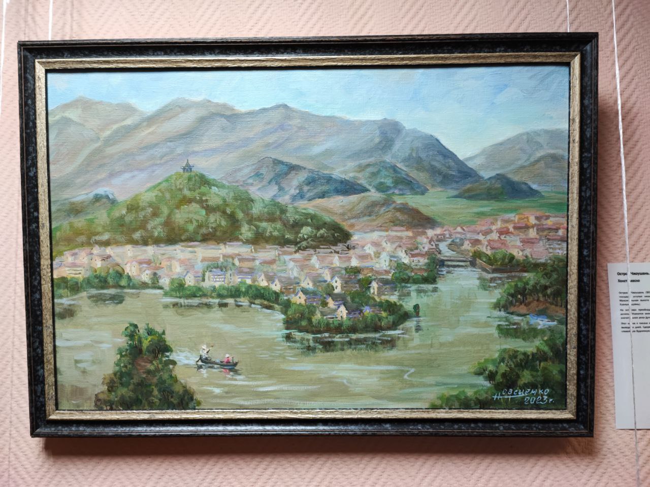 Это уже третья выставка Наталии Дмитриевны на Хвастовичской земле. Называется она «Россия — Китай. Без перевода».