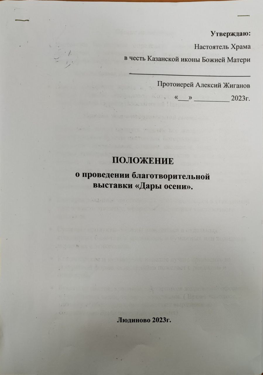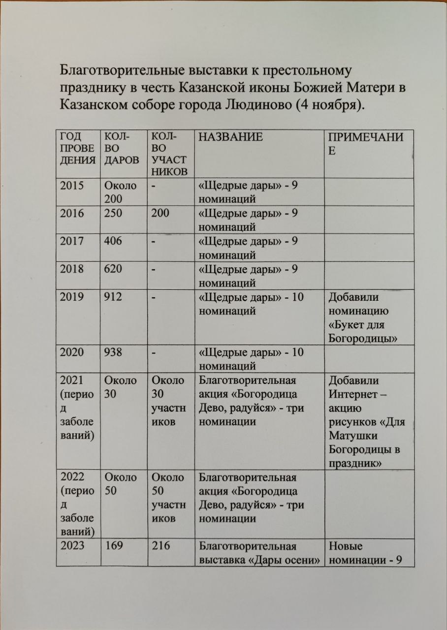 4 ноября 2023 года в Казанском соборе города Людиново в честь престольного праздника Казанской иконы Божией Матери по благословению епископа Козельского и Людиновского Никиты была организована благотворительная выставка «Дары осени». В этом году выставка была организована в большом трапезном зале Духовно – просветительского центра «Светоч». Подобные благотворительные выставки в Казанском соборе проводились с 2015 года. Менялись только названия выставок и номинации: с 2015 года по 2020 год – это «Щедрые дары», с 2021 года по 2022 год – «Богородица Дево, радуйся», в 2023 году – «Дары осени». В этом году участники выставки представили свои дары в восьми номинациях: «Букет для Богородицы», «Кондитерское чудо», «Сладкоежка», «Угощаю от души», «Грибочки лесные», «Чайный сбор домашний», «Ай да овощ, ай да фрукт», «Домашний кулинар». Всего — 216 даров и заготовок. А участие в выставке приняли 169 человек. В номинации «Букет для Богородицы» участники представили удивительное разнообразие и красоту букетов, композиций из живых цветов и осенних даров природы. Баночки с заготовками умельцы оформили красочно и с большой любовью, некоторые организации предоставили на выставку целые композиции из заготовок в деревенском стиле. Порадовала гостей и номинация «Грибочки лесные», ведь год на грибы был урожайный.