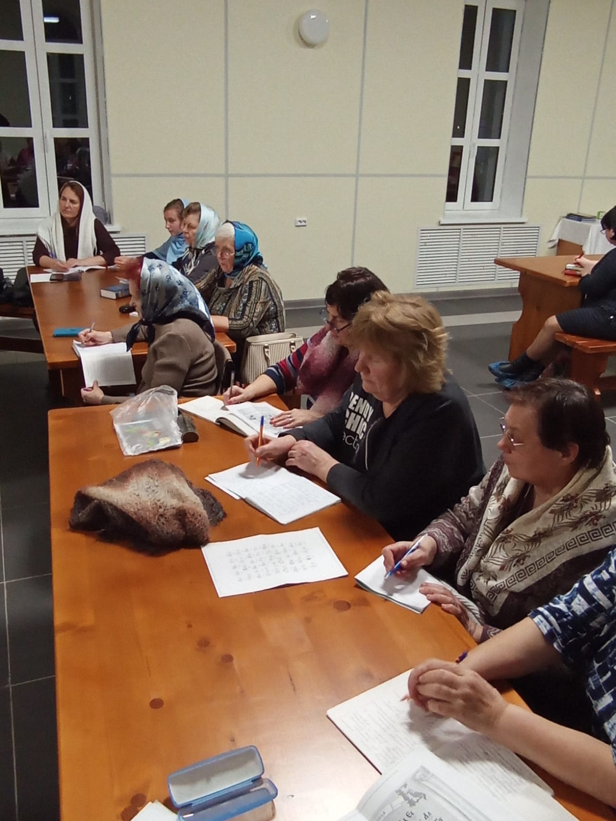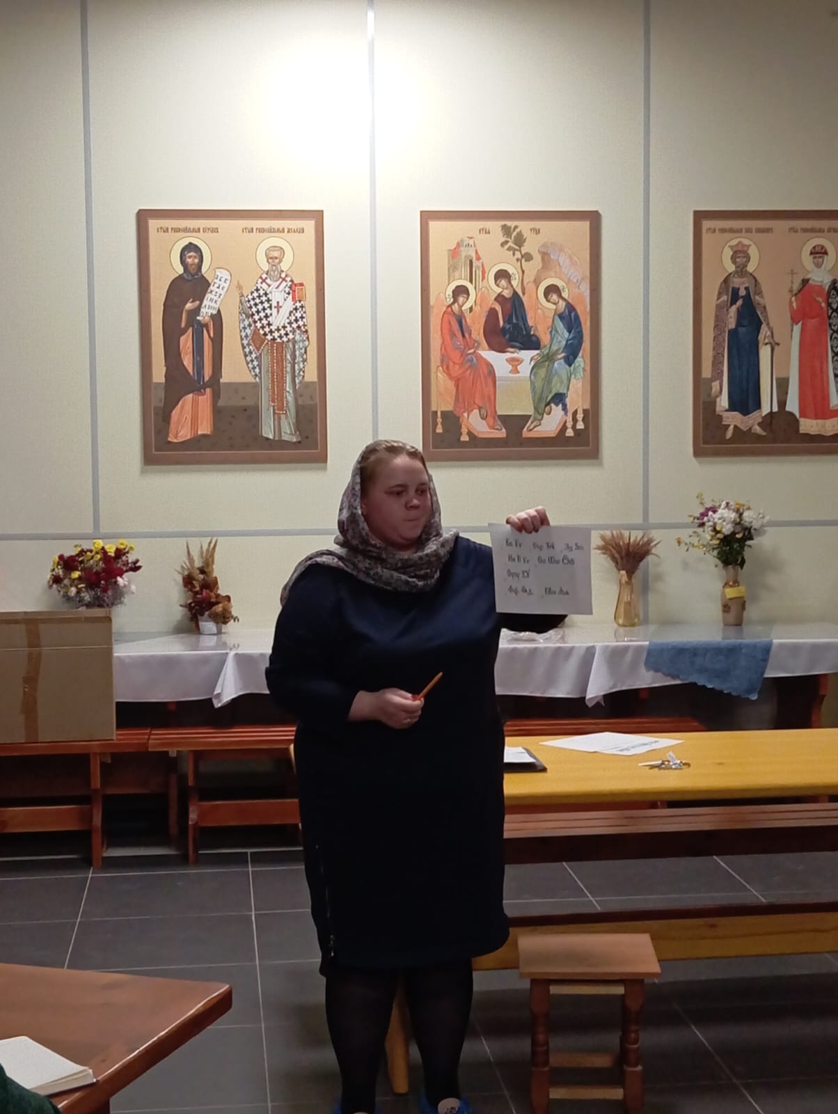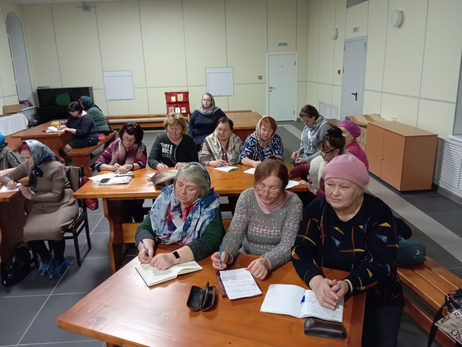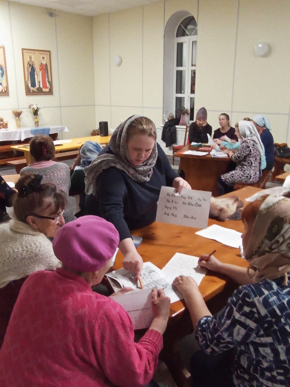 6 ноября 2023 года в Воскресной школе для взрослых при Казанском соборе города Людиново прошло очередное занятие по изучению церковно – славянского языка, которое проводит Светлана Андреевна Майорова (матушка Фотиния). Кроме церковно – славянского языка матушка преподаёт церковное пение. Азы прекрасного языка Церкви слушатели школы с удовольствием постигают, а на занятиях церковному пению изучают и азы нотной грамоты, и песнопения церковных служб. В Воскресной школе для взрослых, кроме руководителя школы иерея Иоанна Майорова, который преподает литургику, трудятся и другие священнослужители Людиновского благочиния: протоиерей Михаил Карпенко – преподает Нравственное Богословие, иерей Алексий Сначёв – Ветхий Завет, диакон Андрей Соколов — Новый Завет.   6 ноября в большом трапезном зале Духовно – просветительского центра «Светоч», где обычно проходят занятия Воскресной школы для взрослых, взрослые ученики поздравили своего руководителя школы иерея Иоанна Майорова с днём рождения, которое он праздновал 4 ноября в престольный праздник в честь Казанской иконы Божией Матери. Батюшке его подопечные пожелали добра и здравия на многая благая лета, поблагодарив за его просветительские труды.