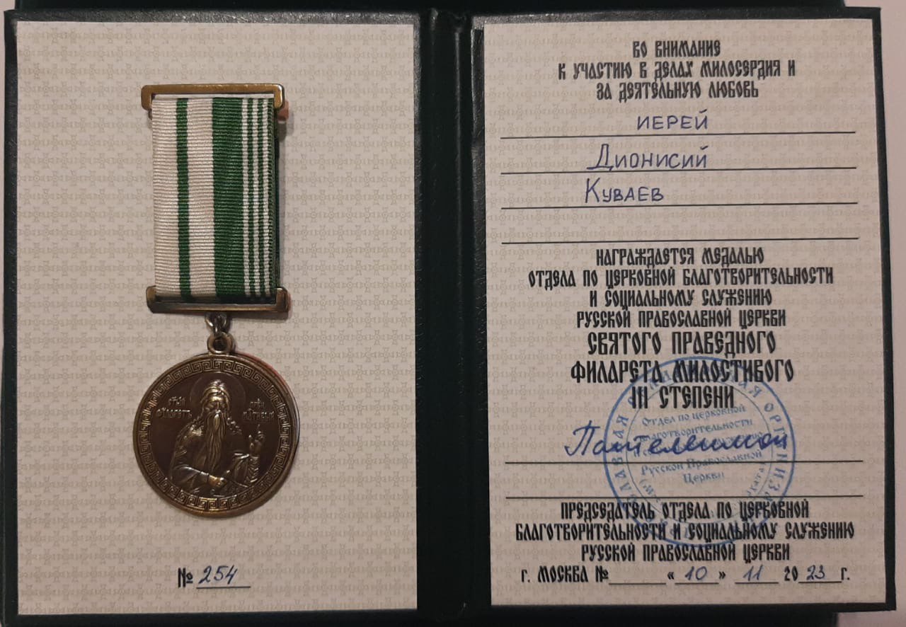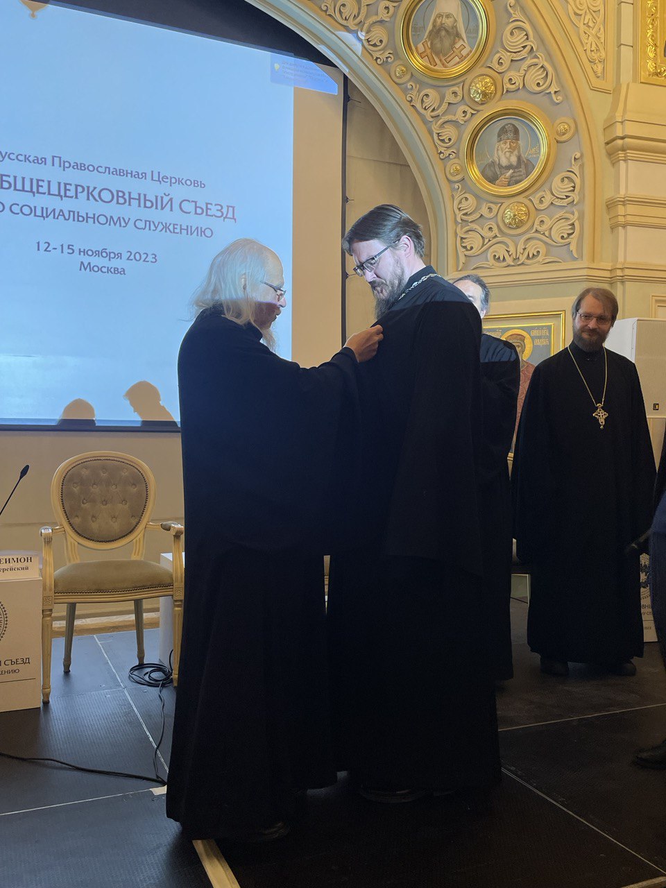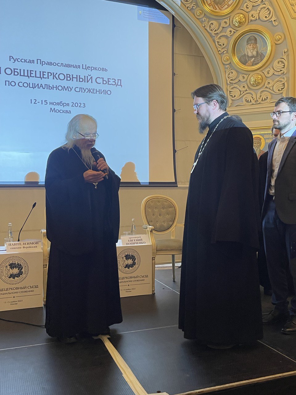 В последний день съезда, перед началом заключительной сессии, епископ Верейский Пантелеимон, председатель Синодального Отдела по церковной благотворительности и социальному служению Русской Православной Церкви отметил труды клирика Козельской епархии иерея Дионисия Куваева и наградил его медалью Синодального Отдела по благотворительности — святого праведного Филарета Милостивого III степени.