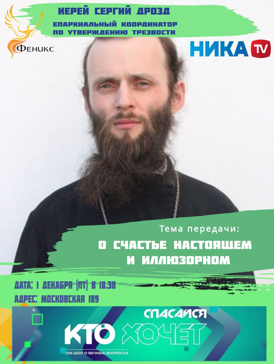1 декабря епархиальный координатор по утверждению трезвости по приглашению протоиерея Георгия Казанцева — настоятеля храма святого великомученика Георгия Победоносца в Калуге и телеведущей Дарьи Хромовой принял участие в ток-шоу  «Спасайся кто хочет» на канале Ника ТВ. Речь в передаче шла о духовных и душевных причинах зависимостей, о церковной программе помощи страждущим недугами алкоголизма и наркомании, о роли семьи в формировании аддикций и о многом другом.