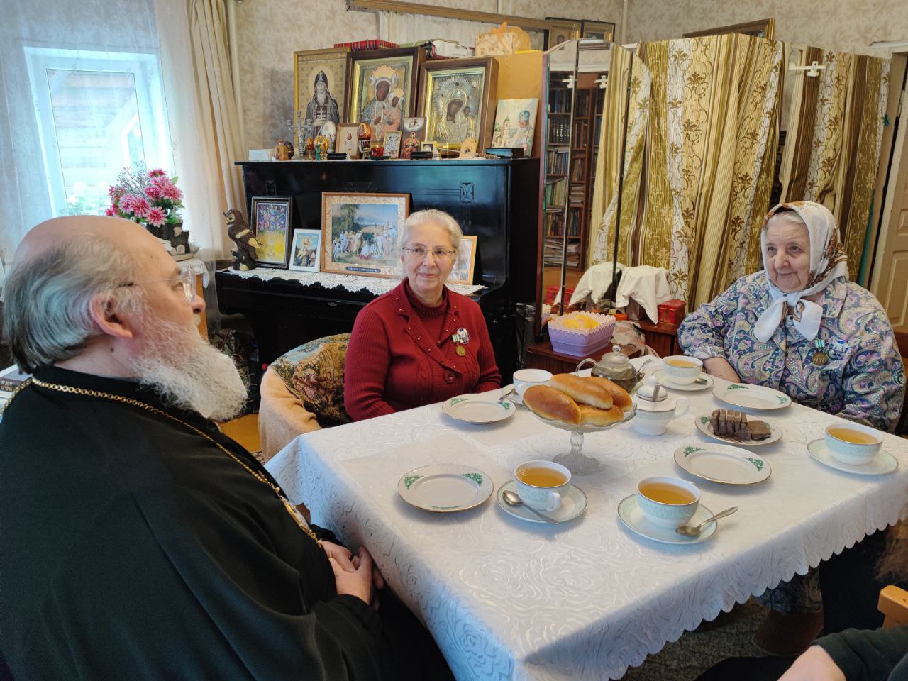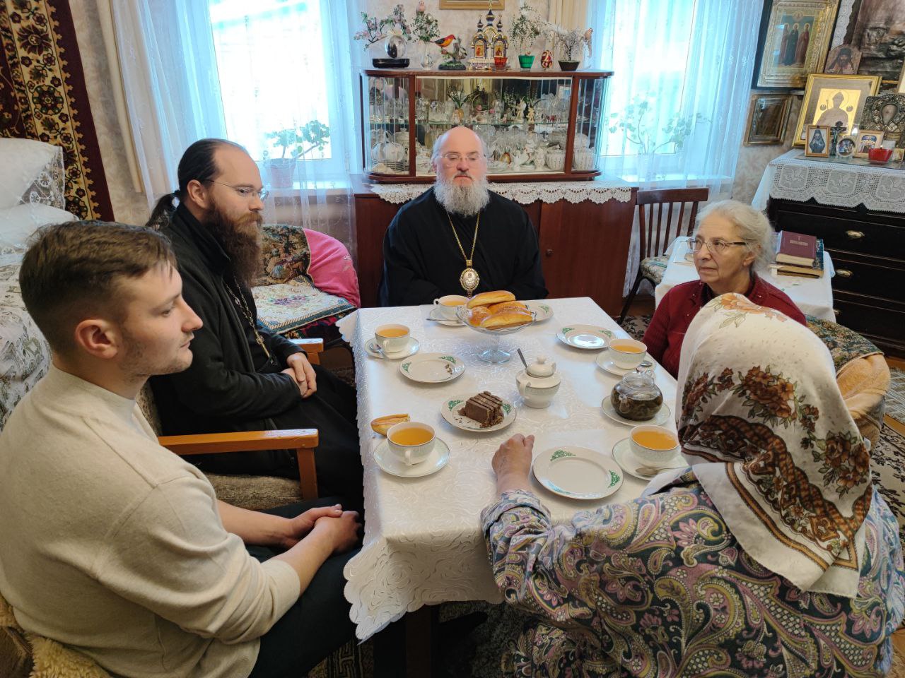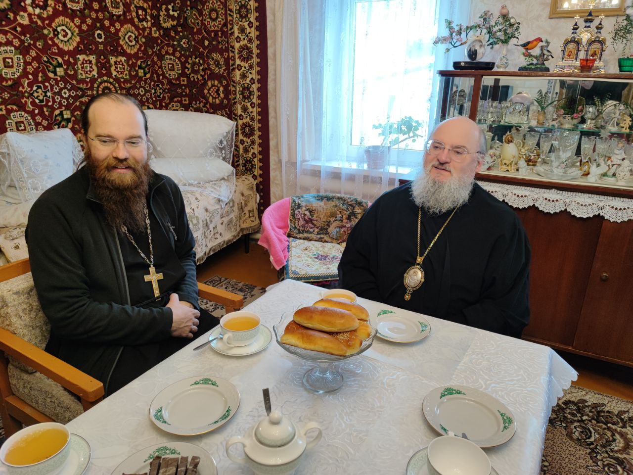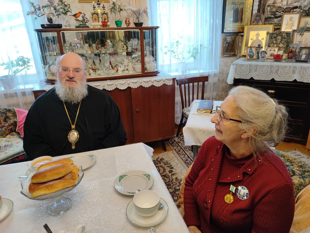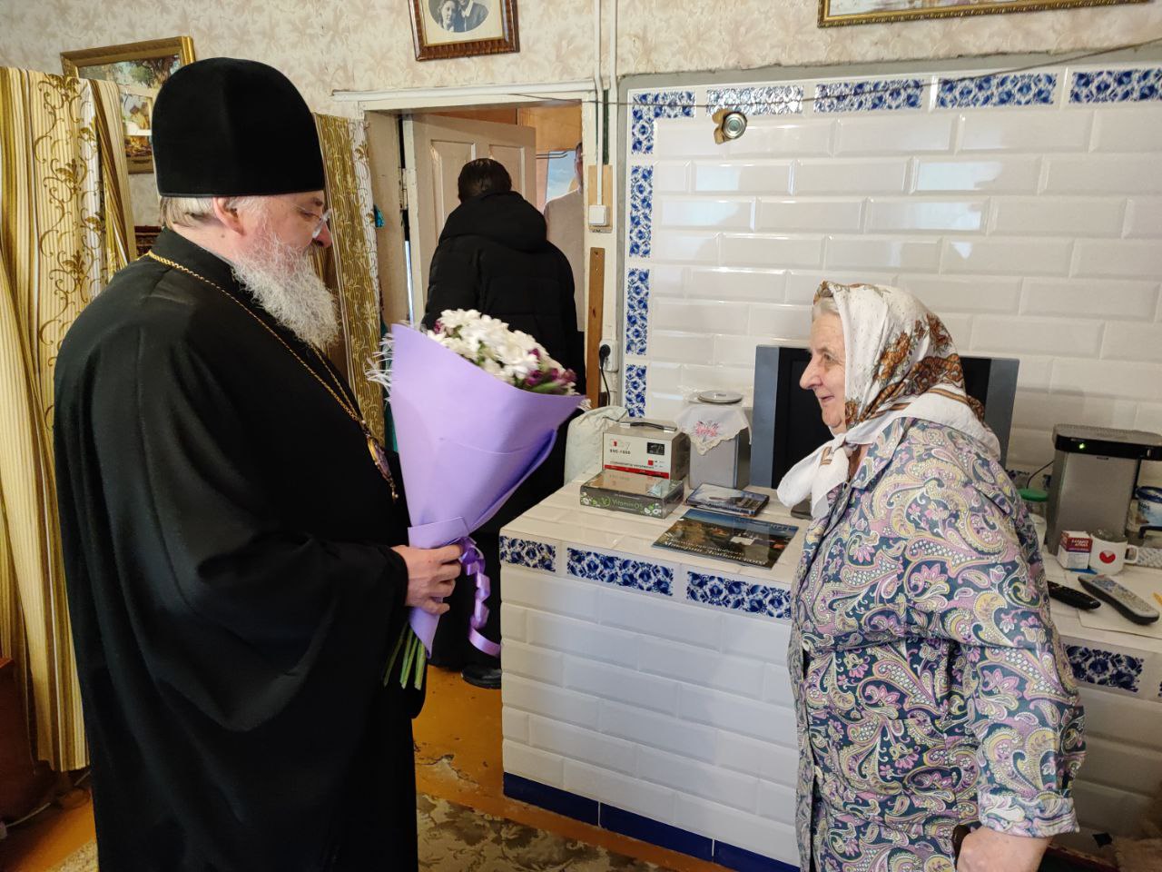 10 декабря епископ Козельский и Людиновский Никита посетил в селе Нижние Прыски вдову настоятеля храма Преображения Господня протоиерея Леонтия Никифорова – Тамару Ивановну, которая вместе с супругом более пятидесяти лет трудилась на приходе, помогая во всем своему батюшке. Отец Леонтий принял приход в один из самых тяжелых периодов гонений на Церковь в советском государстве, однако сумел не только уберечь его от ликвидации, но и укрепить, постоянно благоукрашая и производя различные ремонтные и строительные работы, что на тот момент было практически не реально. И всегда рядом с ним была его супруга – помощница и сомолитвенница. Его поддержка и опора. Вместе с батюшкой они вырасти дочь — Ольгу Леонтьевну и пятерых внуков, двое из которых Симеон и Тихон священники, продолжая дело дедушки, служат сегодня  в Преображенском храме. У матушки десять правнуков.