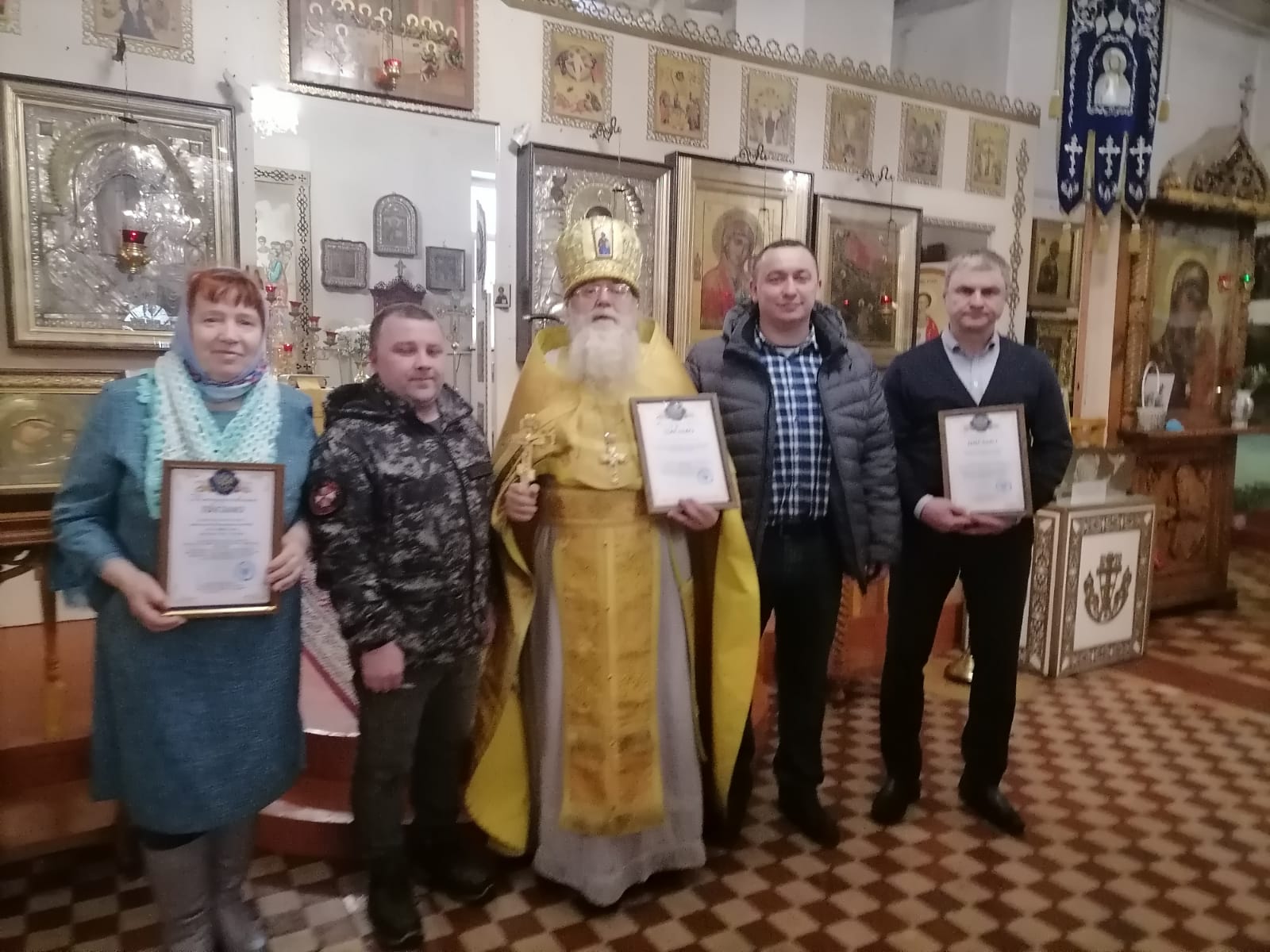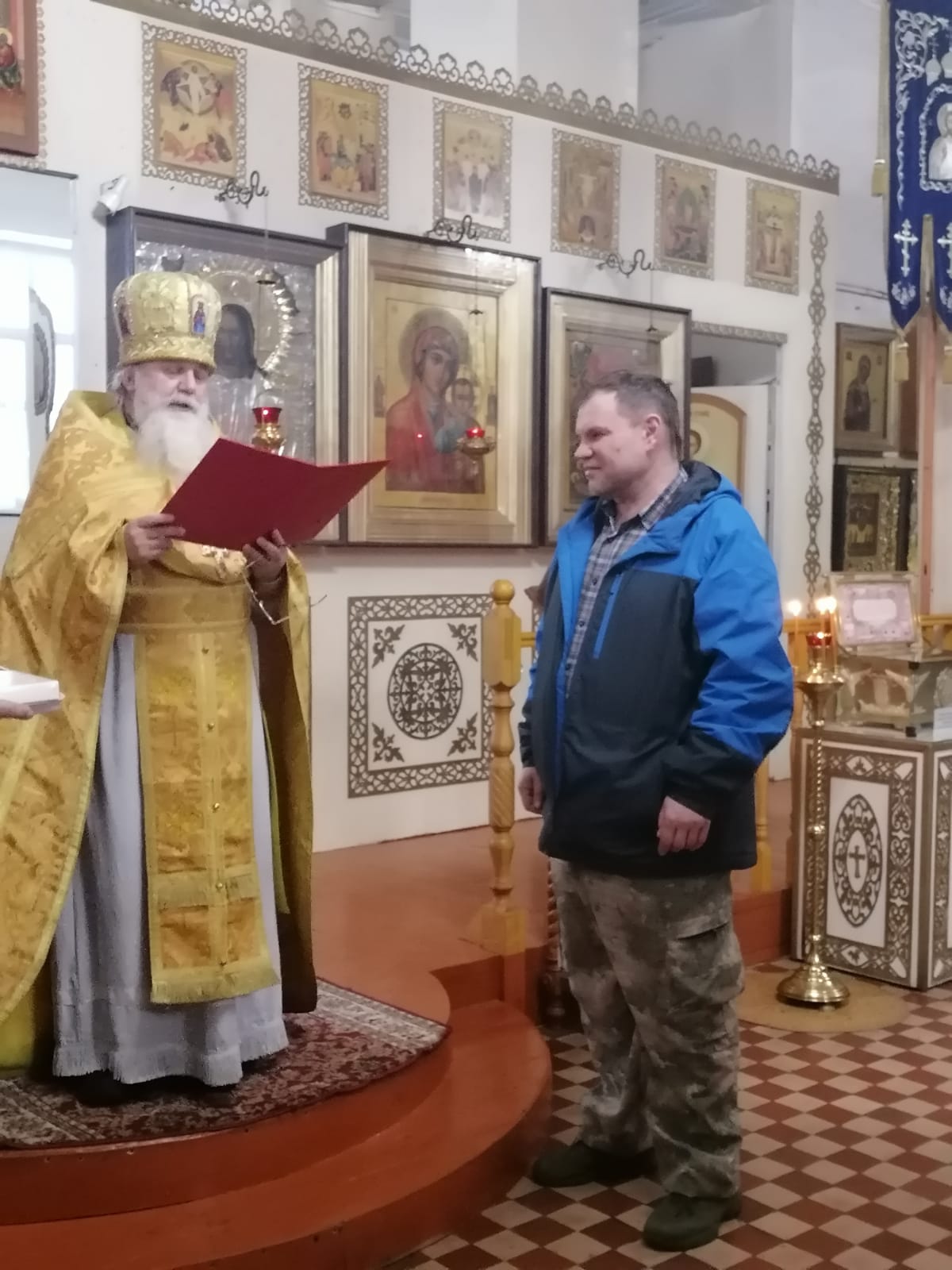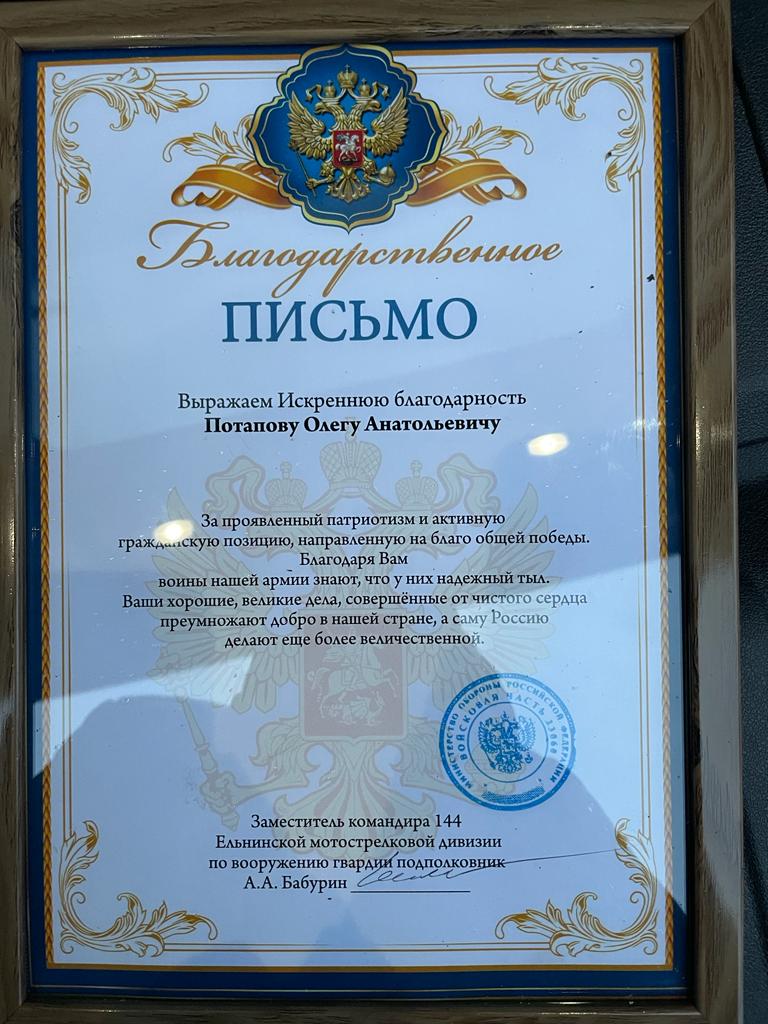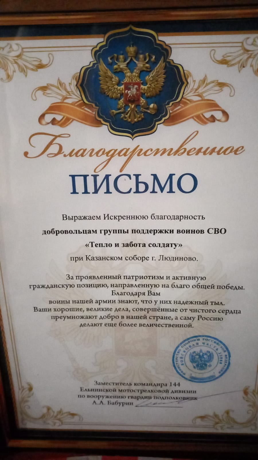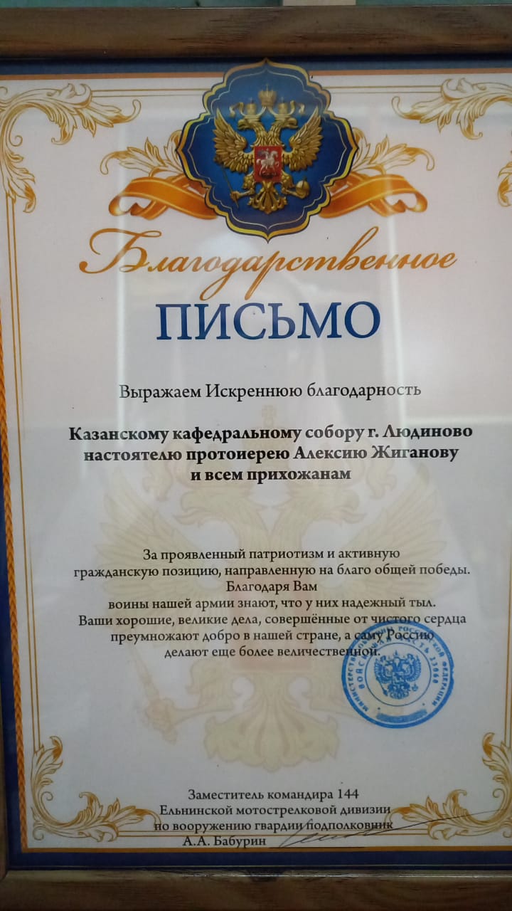 После поздравлений юбиляров к отцу Алексию обратились председатель Калужского Регионального Отделения Всероссийского общественного движения «Отцы России» в Людиновском районе Артём Андреевич Родичкин и его сопредседатель Сергей Александрович Маркасов. Они попросили благословения настоятеля для вручения Благодарственных писем от заместителя командира 144 Ельнинской мотострелковой дивизии по вооружению гвардии подполковника А. А. Бабурина за активную помощь в период специальной военной операции. Артём Андреевич поблагодарил от имени командования всех неравнодушных прихожан, кто помогает нашим бойцам, и вручил настоятелю храма отцу Алексию благодарственное письмо. Также благодарственные письма были вручены  Валентине Егоровне Купрюхиной, координатору группы добровольцев «Тепло и забота солдату» и Олегу Анатольевичу Потапову, прихожанину храма, предпринимателю города Людиново. Отец Алексий, в свою очередь, поблагодарил Родичкина А. А. и Маркасова С. А. и попросил передать благодарность командованию  144 Ельнинской мотострелковой дивизии за оказанную честь сказав, что эта благодарность всем неравнодушным прихожанам Казанского собора и всем людиновцам – добровольцам, которые по зову сердца стремятся по силам помогать нашим воинам, тем самым совершать добрые дела, которые направлены на нашу общую Победу над врагом.