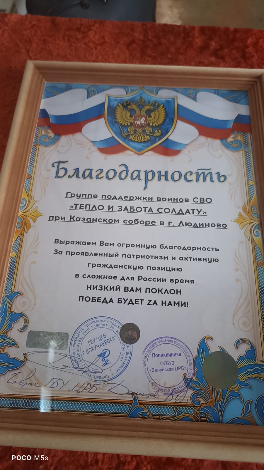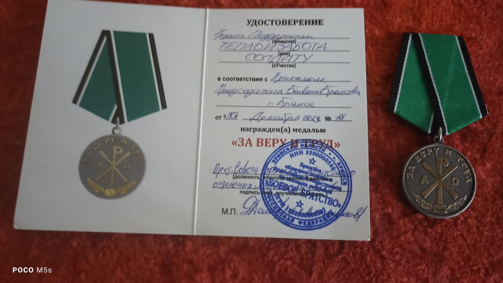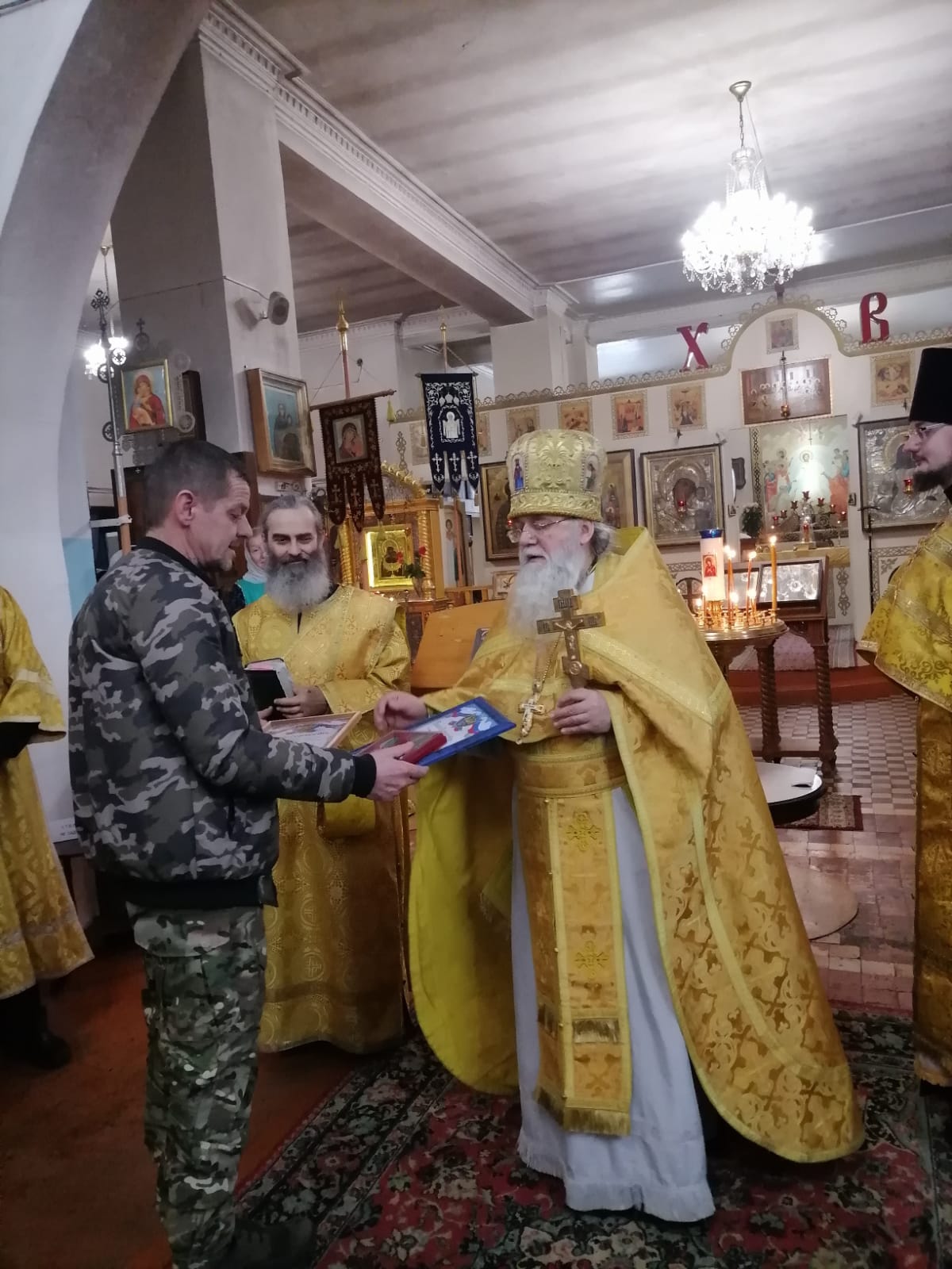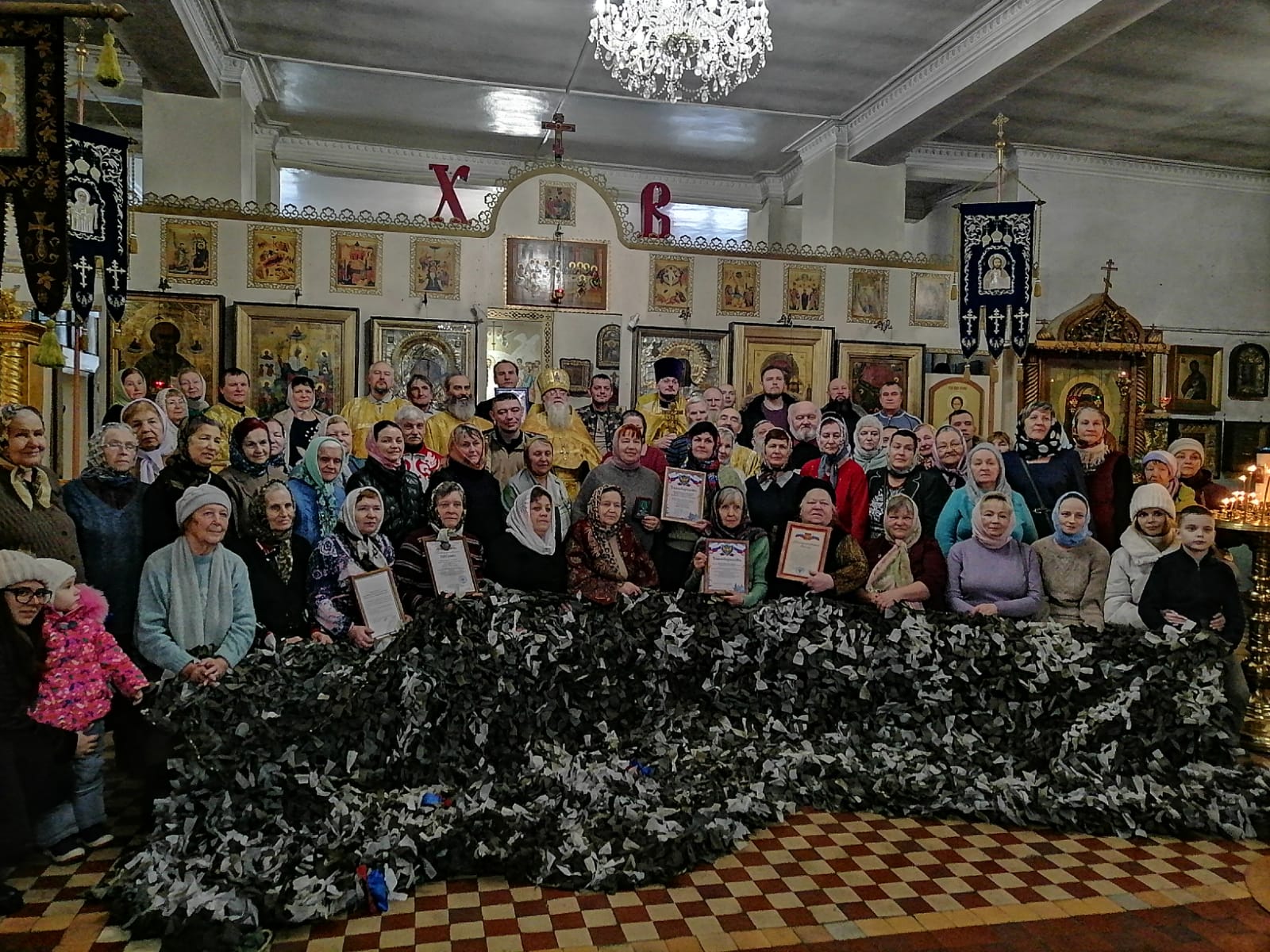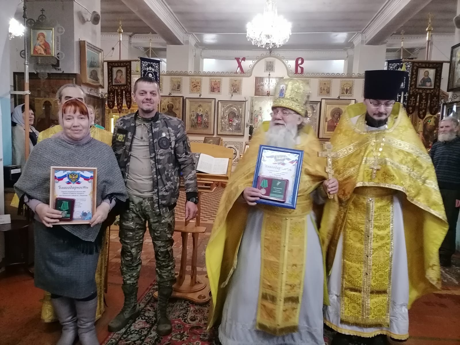 В этот же день были освящены масксети для наших воинов в зону СВО. После богослужений предприниматель Олег Бабченко по просьбе главного врача и коллектива больницы города Докучаевска вручил настоятелю Казанского собора протоиерею Алексию Жиганову и координатору группы Валентине Купрюхиной в лице всех добровольцев приходской группы «Тепло и забота солдату» при Казанском соборе города Людиново благодарности за проявленный патриотизм и активную гражданскую позицию. Здесь же от Брянского областного отделения Всероссийской общественной организации «Боевое братство» были вручены медали «За ВЕРУ И ТРУД».