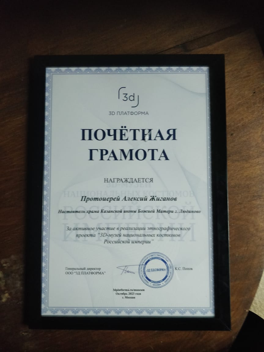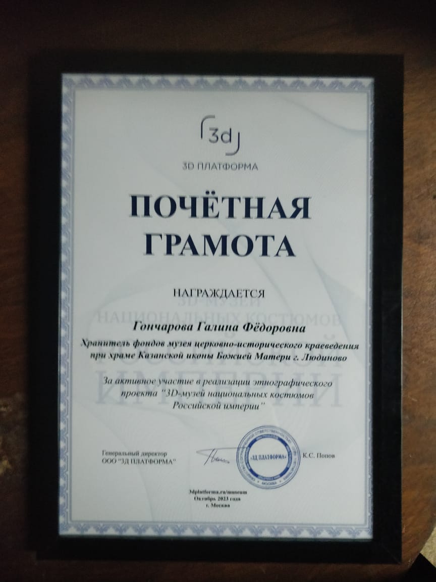 Радостно, что в реализации данного этнографического проекта также приняли участие людиновцы: настоятель Казанского собора города Людиново протоиерей Алексий Жиганов и хранитель фондов музея церковно – исторического краеведения при Казанском соборе города Людиново Галина Фёдоровна Гончарова. За активное участие в проекте «3D-музея национальных костюмов Российской империи» людиновские помощники награждены Почётными грамотами.