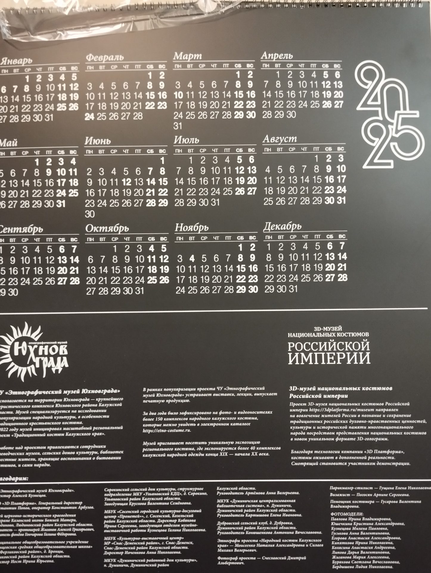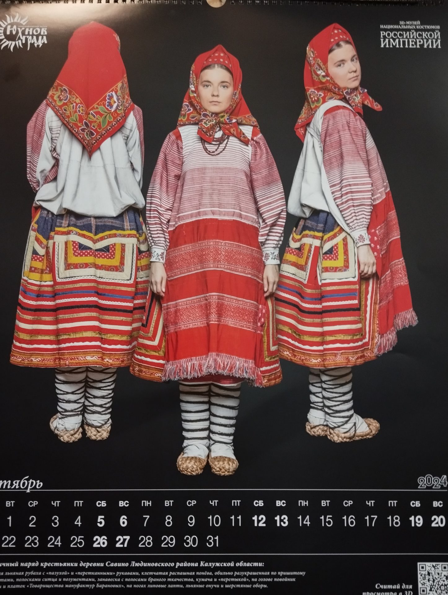 В настоящее время, благодаря стараниям руководителя Этнографического музея Юхновграда, получен долгожданный календарь на 2024 год большим форматом – это 12 нарядов с «дополненной реальностью» от 3D платформы. Очень радует, что в данный уникальный календарь вошли фотографии выпускниц Воскресной школы «Светоч», а теперь прихожанок Казанского собора города Людиново: Анастасии Колясиной и Марии Жигановой. Девушки, среди других красавиц, показали удивительные старинные русские наряды во всей красе!